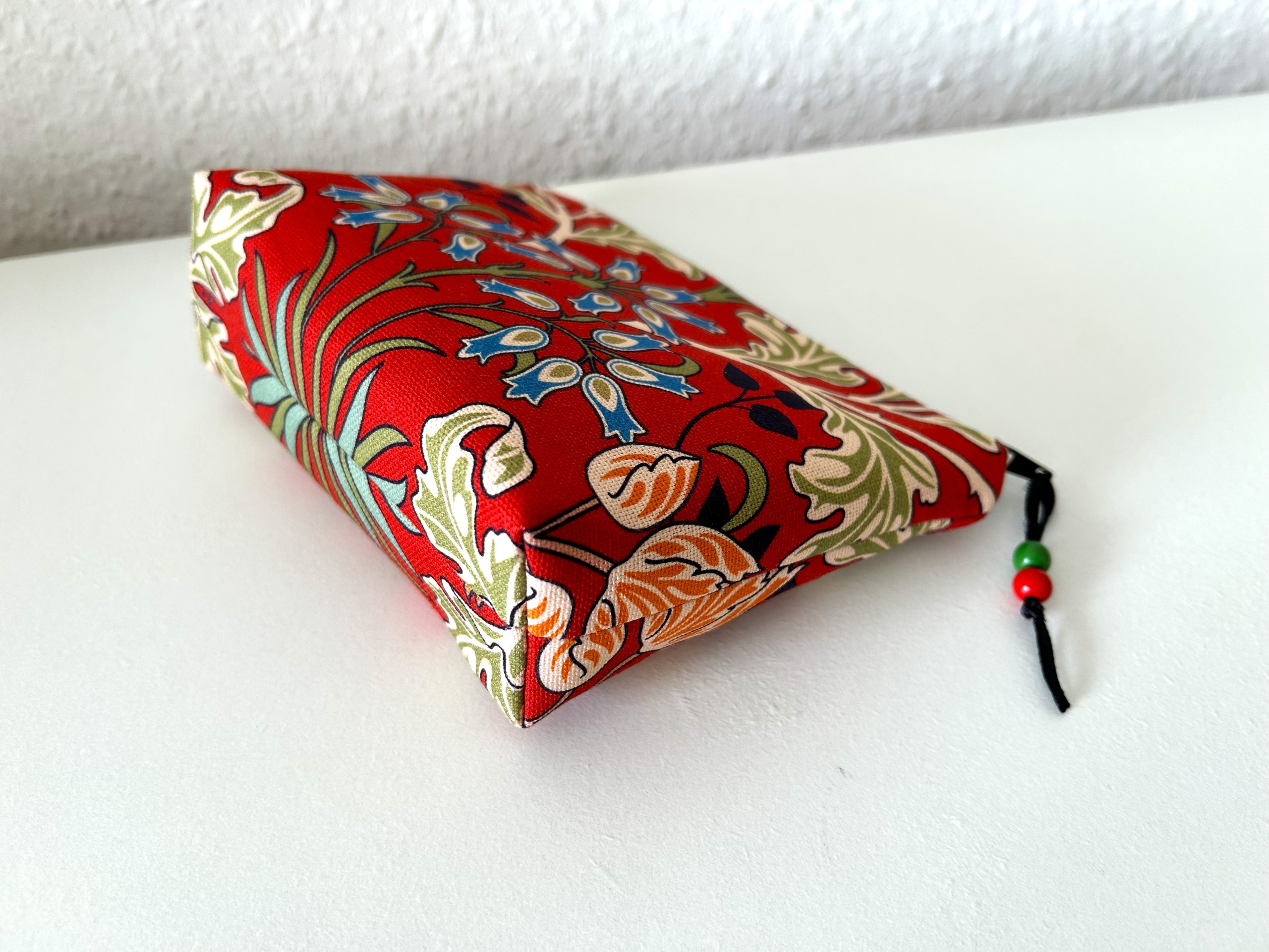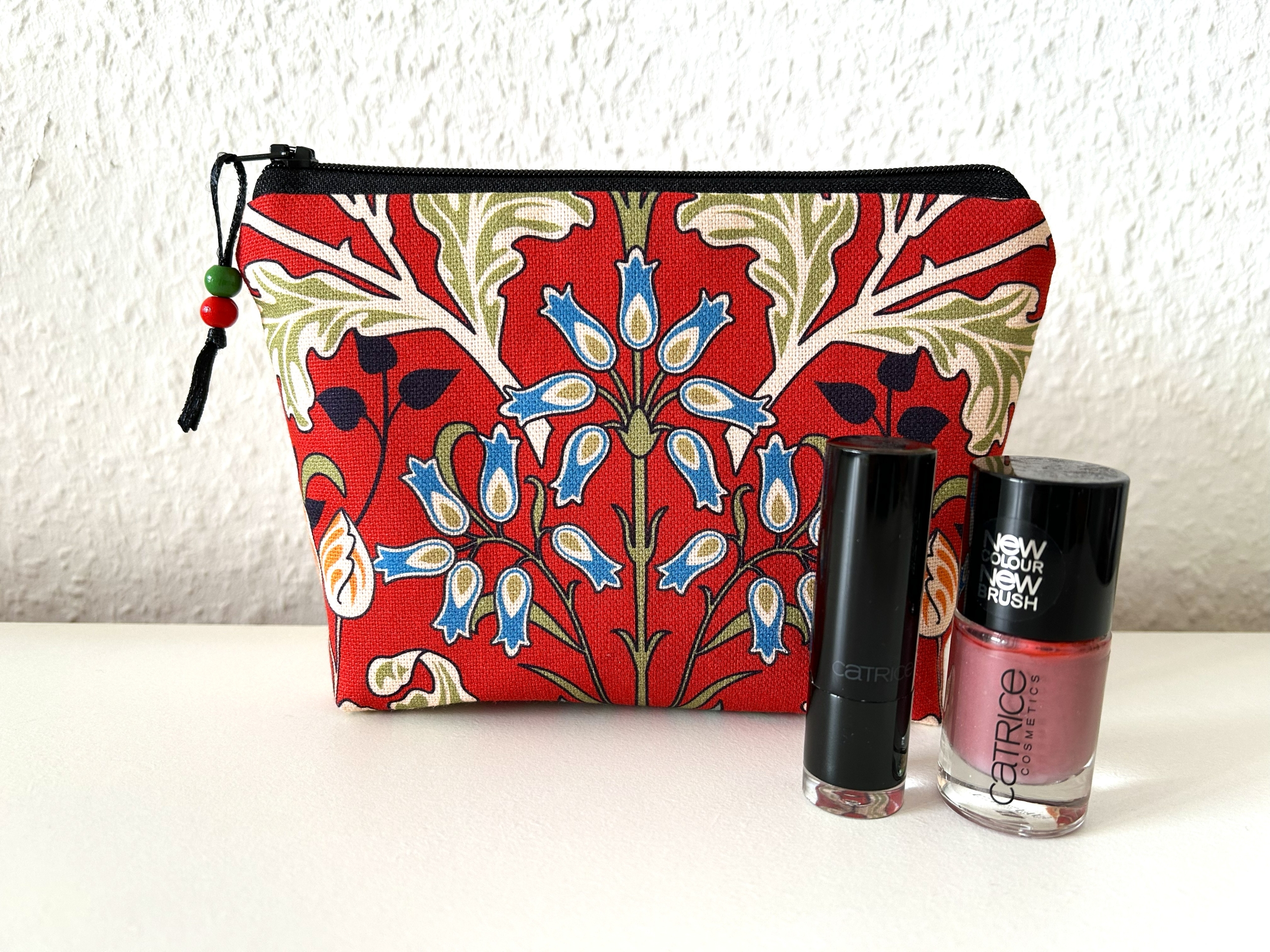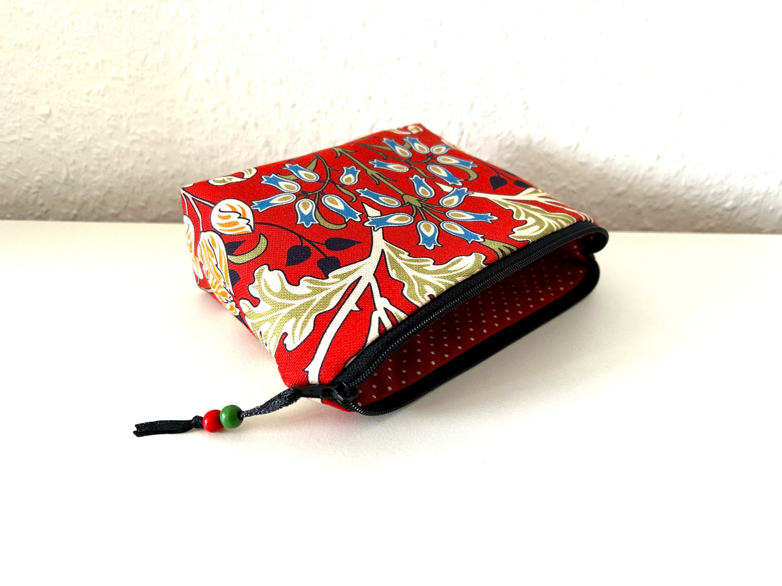 Schöne kleine Kosmetiktasche aus Baumwollstoff in dunkelrot mit Blumenmotiv.