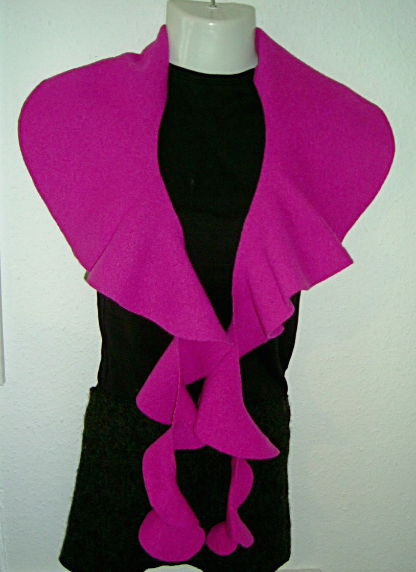 Die Schals sind wie ein Kragen geschnitten. Sie können offen getragen werden. Oder ein Ende über die Schulter und dann mit einer Brosche oder einer Ansteckblume befestigt werden. Oder aber auch wie ein normaler Schal doppelt getragen werden.