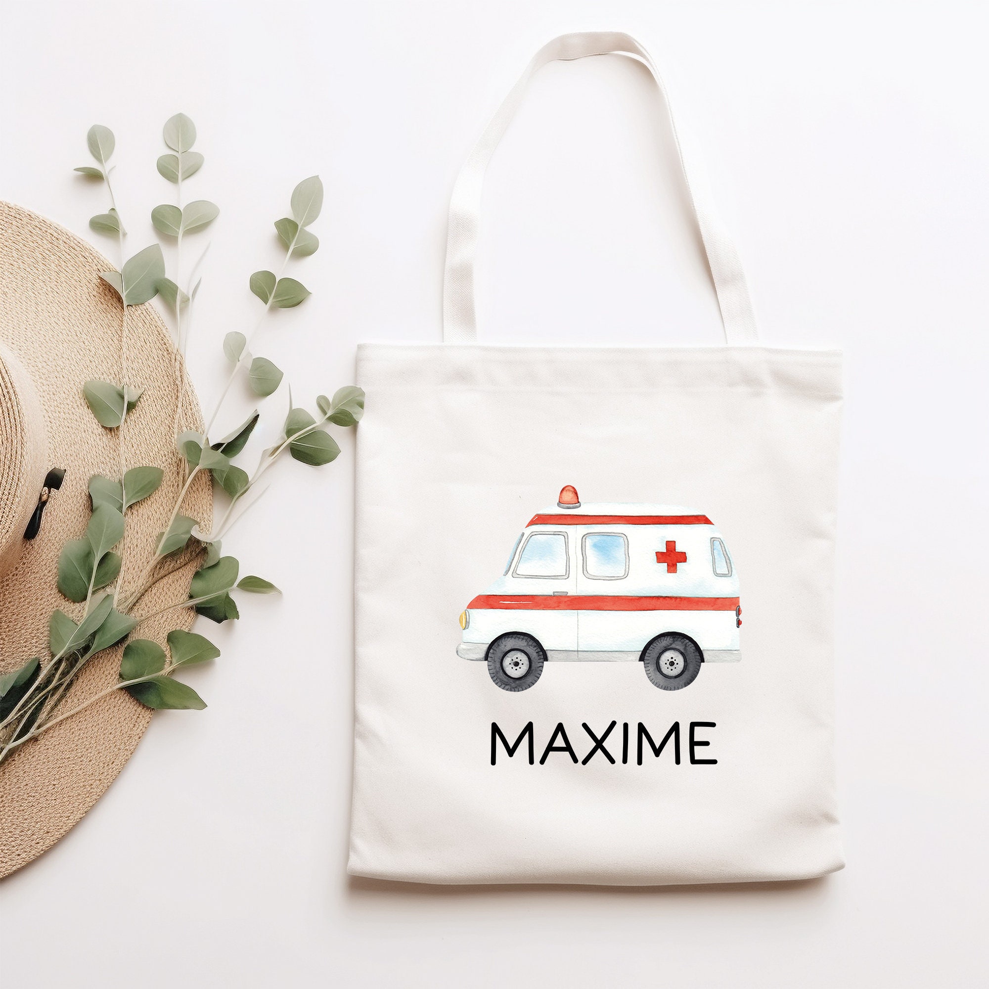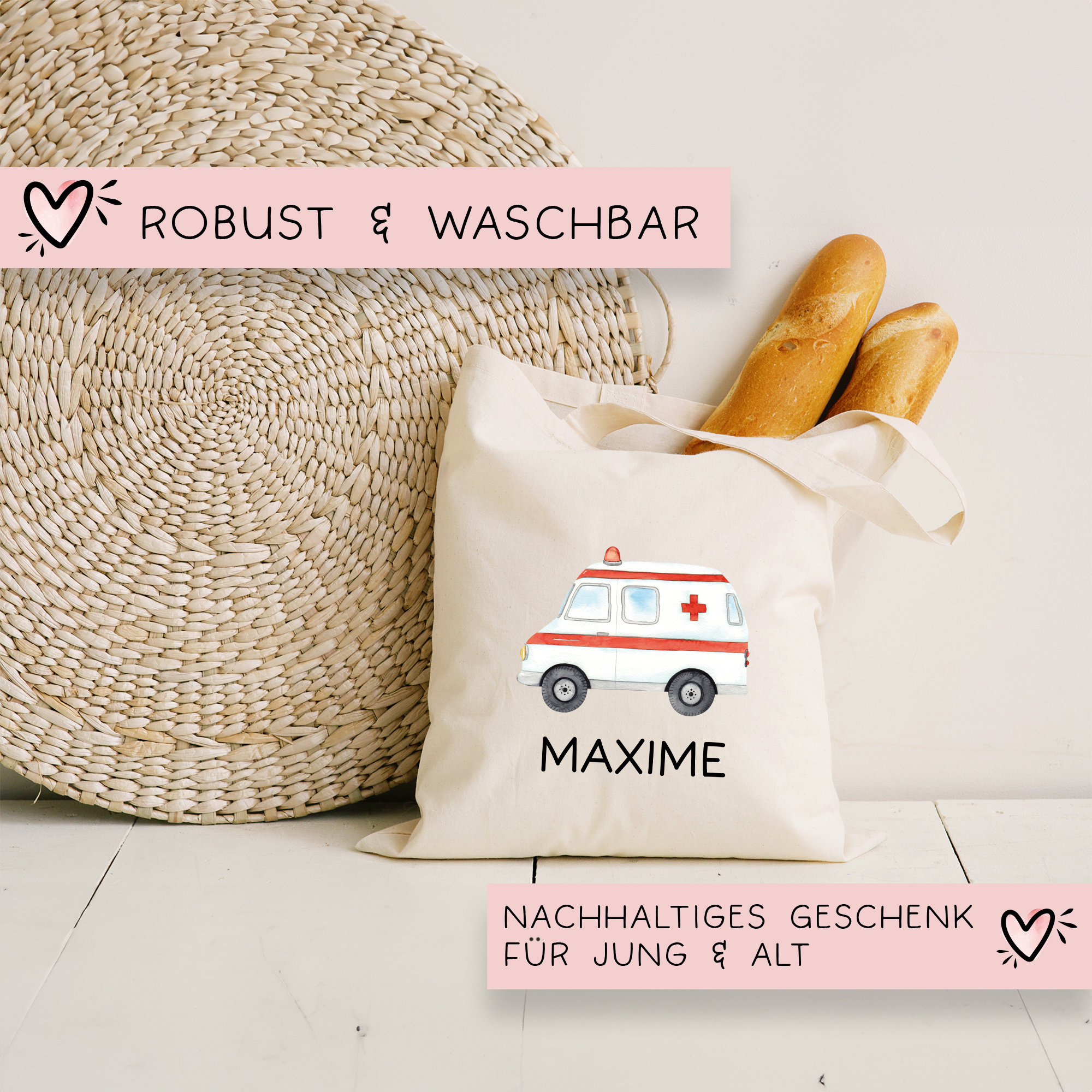 Der personalisierte Turnbeutel für Kinder ist vielseitig einsetzbar, besteht aus robuster Bio-Baumwolle und ist ein treuer Begleiter für unsere Kleinen. Er ist mit einem weißen Krankenwagen Rettungswagen oder Rettungsfahrzeug und dem Namen des Kindes bedruckt.