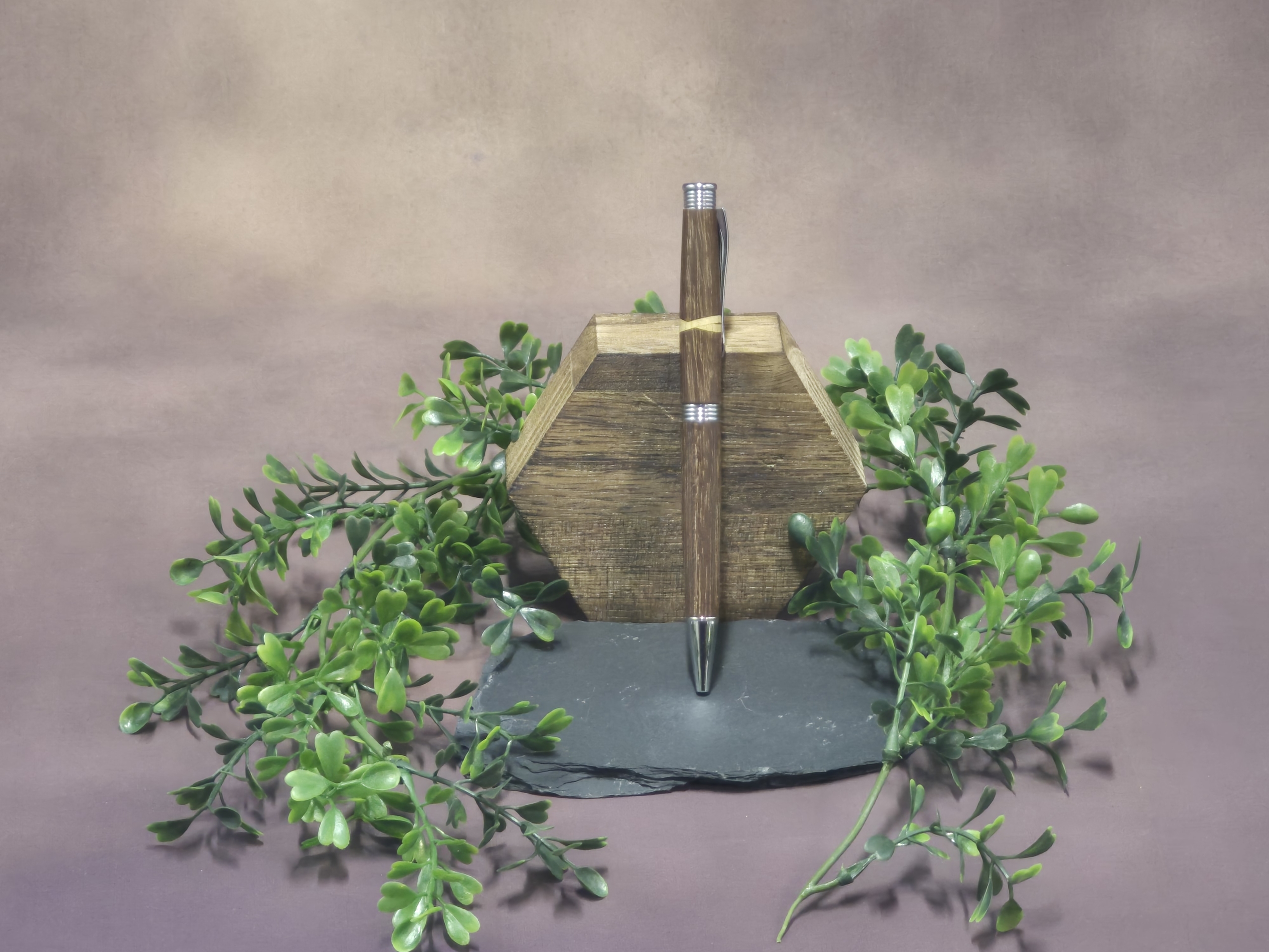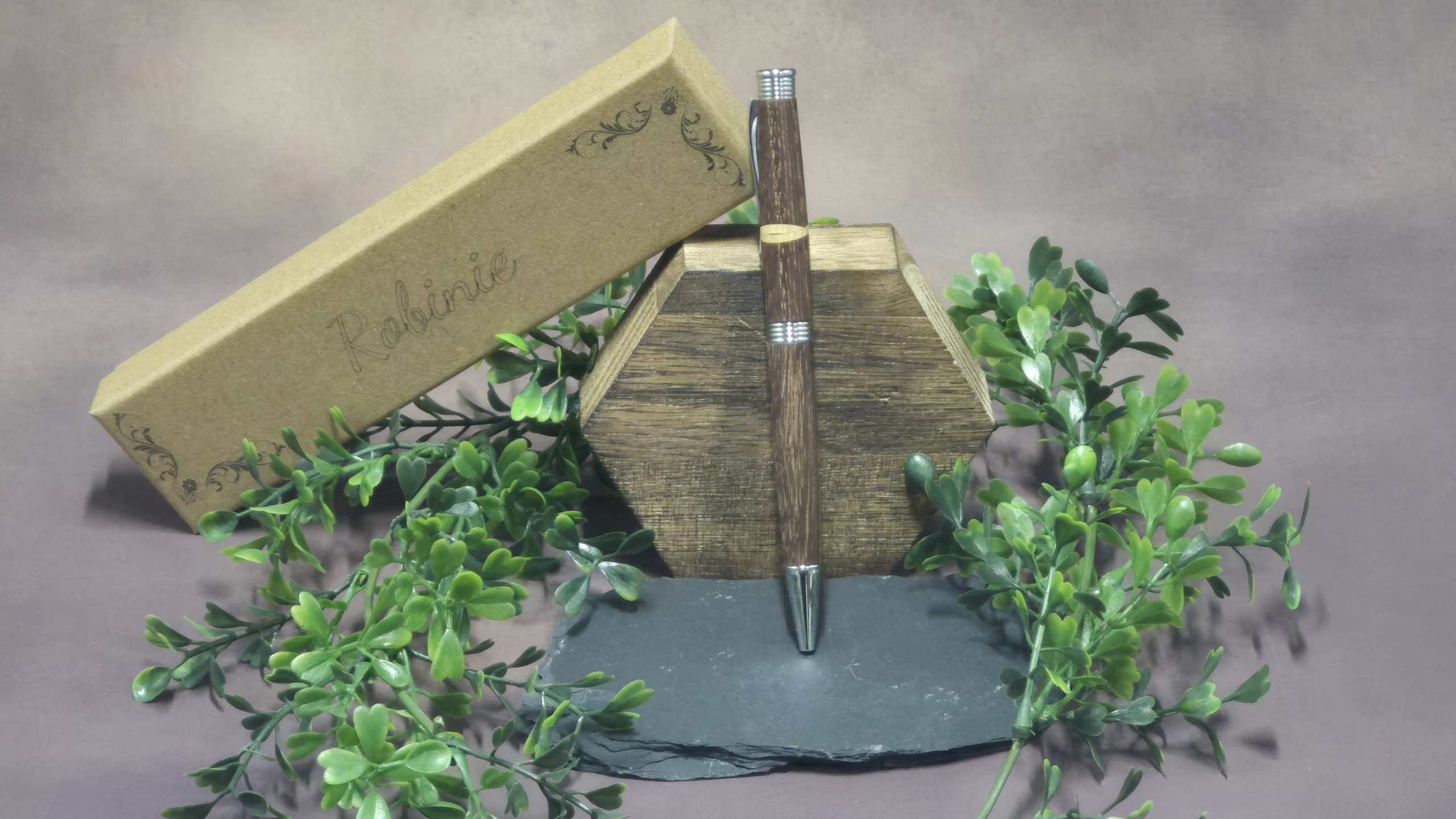 Handgemachter Kugelschreiber aus gedämfter Robinie mit Intarsien-Einsatz aus Robinie.