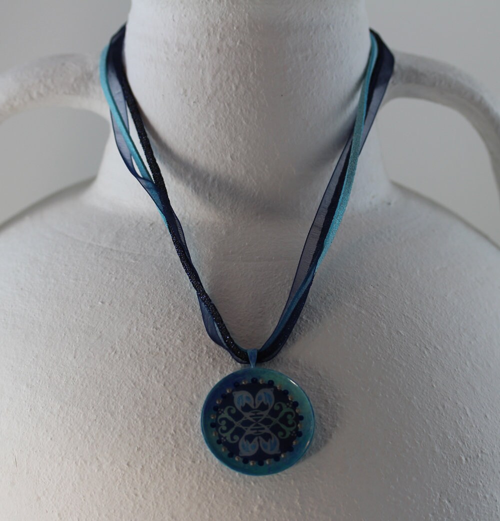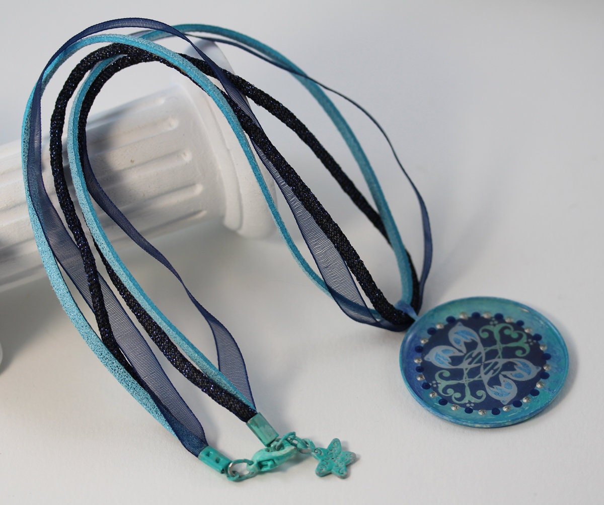 Die Materialien sind versilbertes und von Hand patiniertes Metall, das Motiv ist mit silberfarbenen und dunkelblauen 3D Effekten verziert und in schützenden Kunstharz eingegossen, die Kordel ist aus weichem Velours, Lurexgarn und Organzaband gearbeitet.