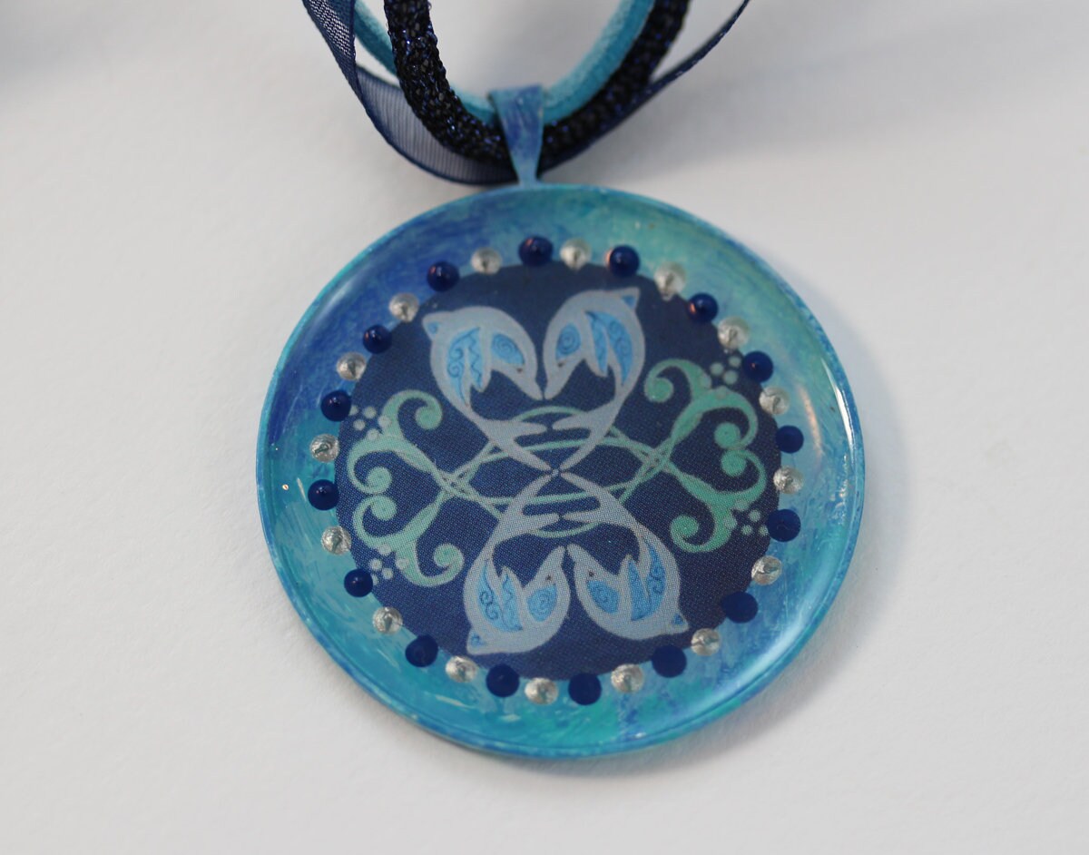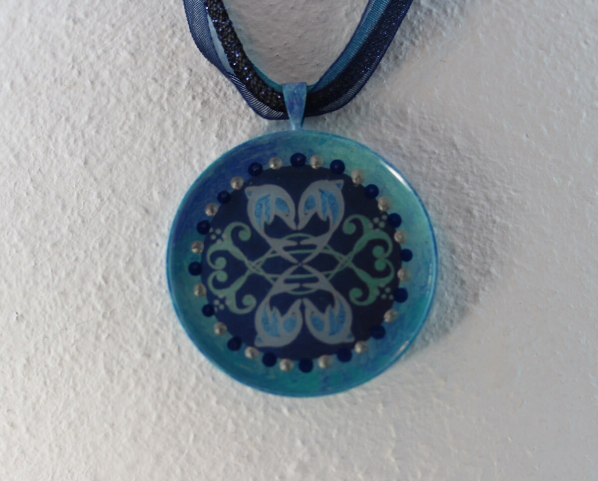 Das Motiv Dolphin Love in einem in Meeresfarben türkis und blau patiniertem Anhänger an einer kunstvollen Kette aus softig weichen Kordeln, welche das schöne Motiv auf besondere Weise unterstreicht.