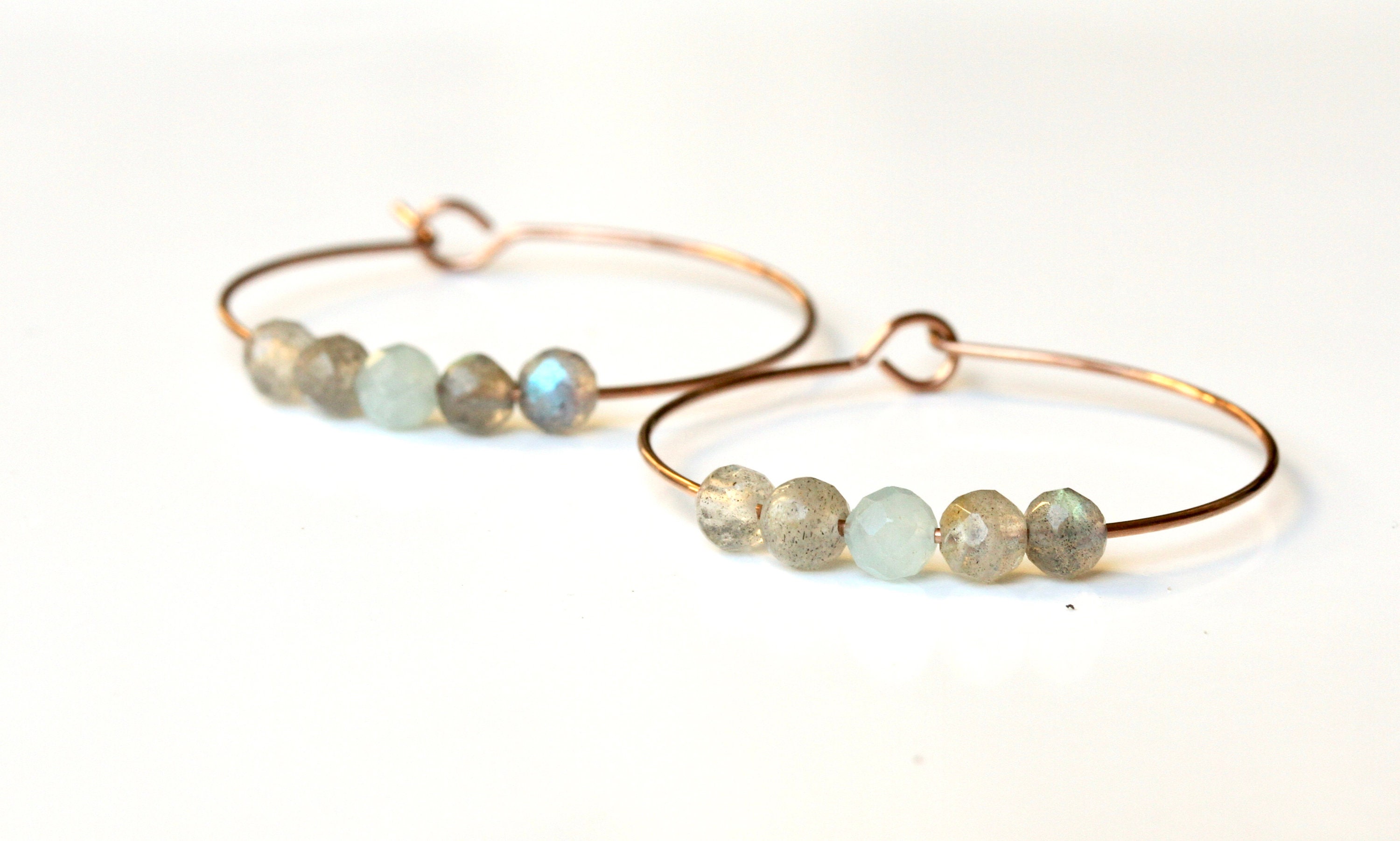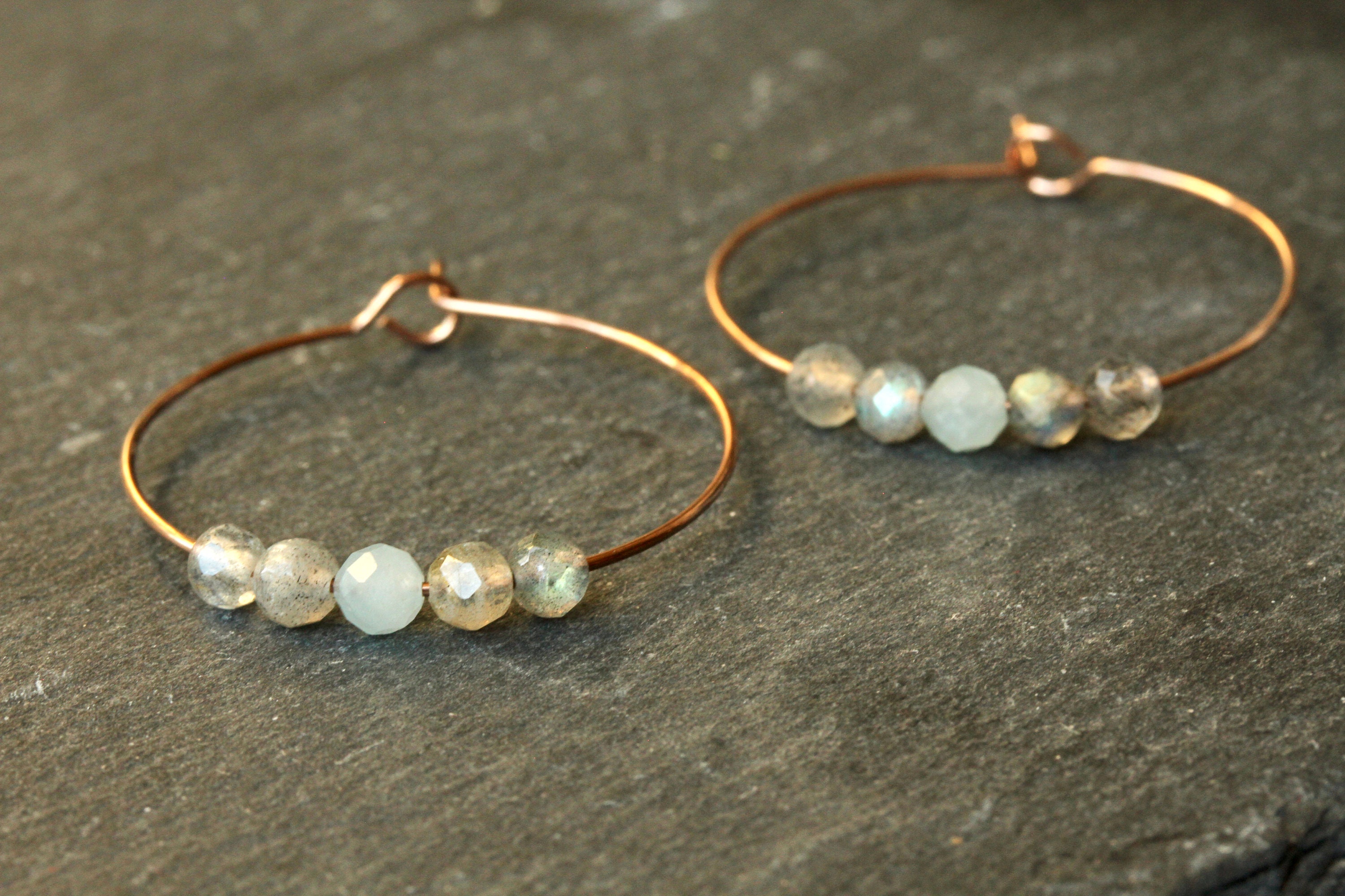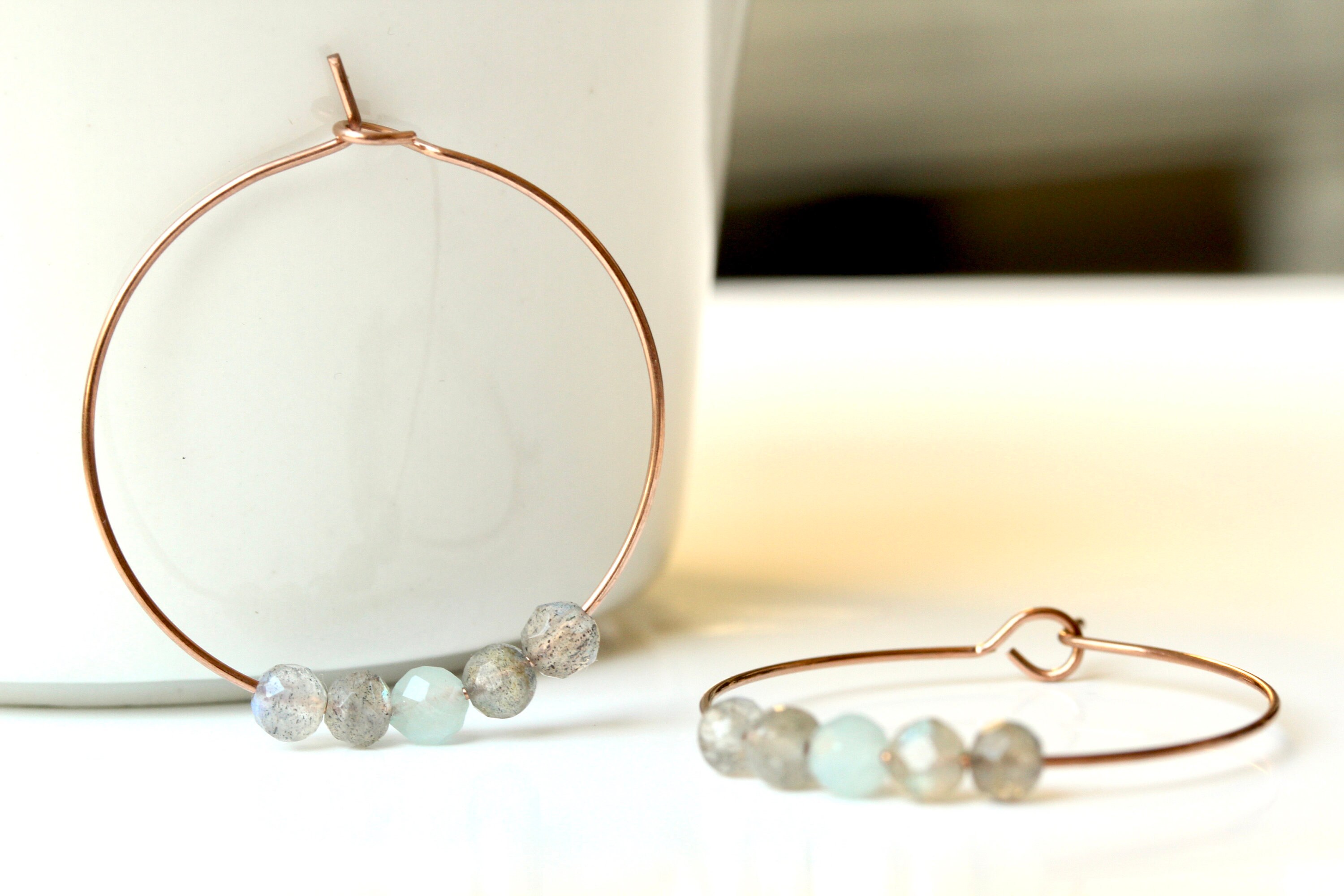 Glänzende Creolen aus 316L Edelstahl, rosegoldfarben und mit microfacettierten Edelsteinperlen aus Labradorit und Aquamarin verschönt.