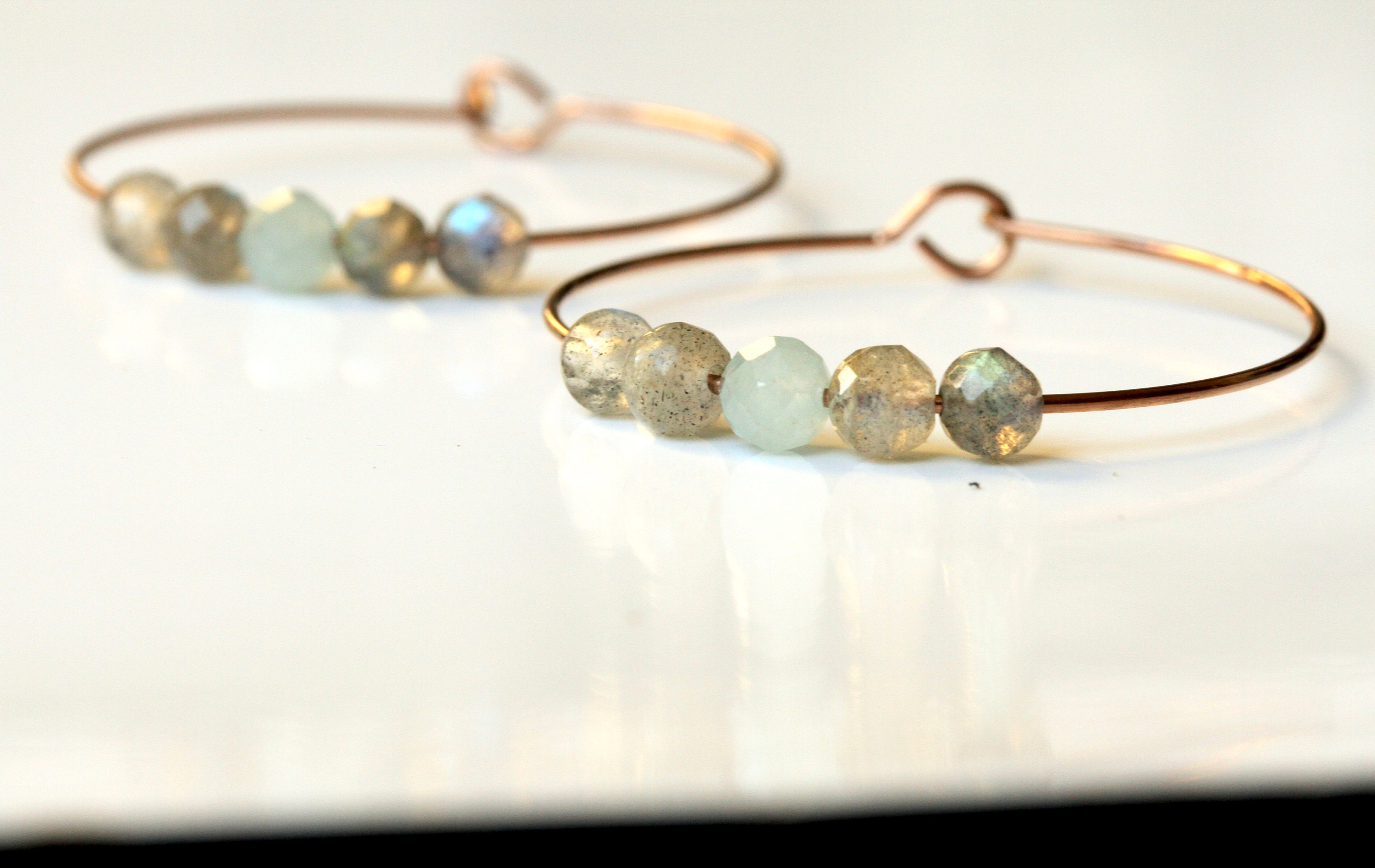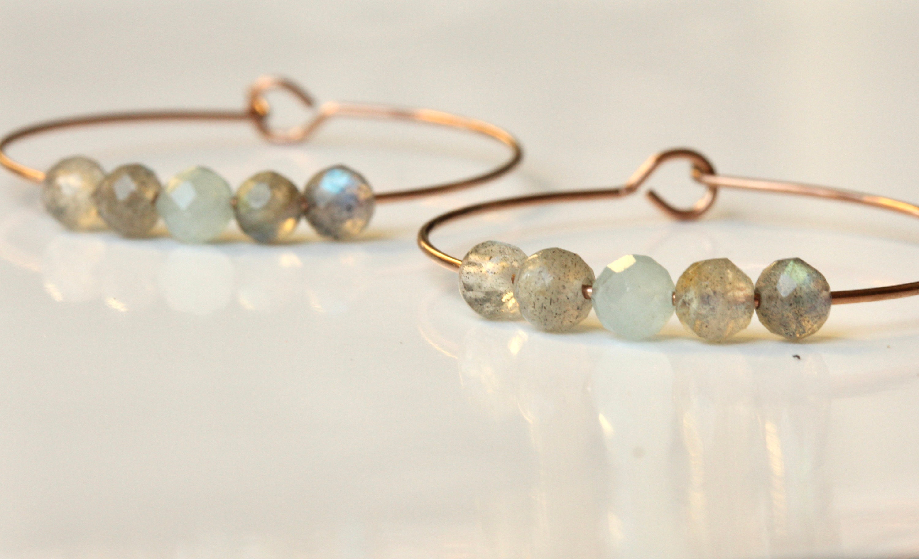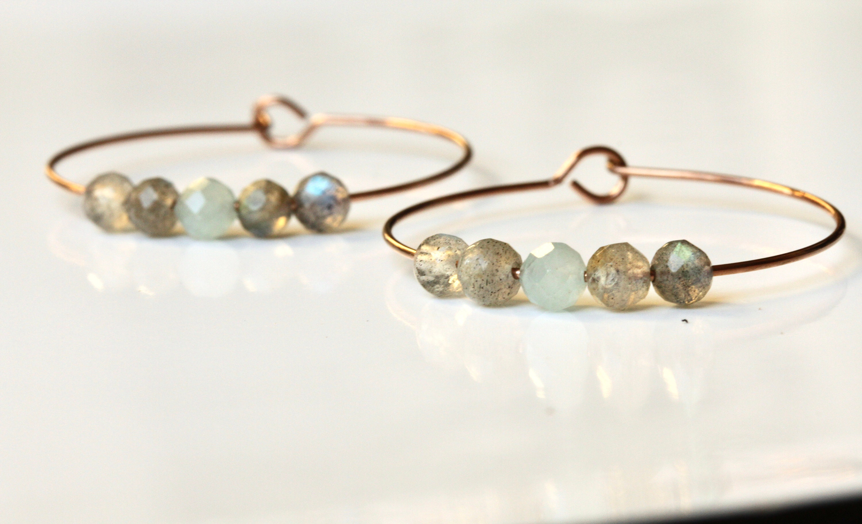 Glänzende Creolen aus 316L Edelstahl, rosegoldfarben und mit microfacettierten Edelsteinperlen aus Labradorit und Aquamarin verschönt.