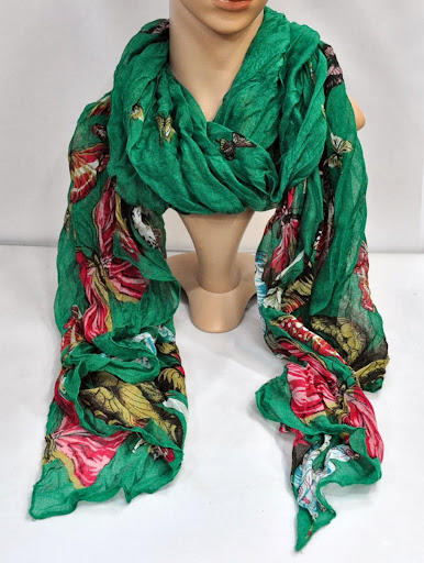 Sie kaufen einen leichten Damen-Schal Motiv "Schmetterlinge" für Frühjahr, Sommer und Strand, neu, ungetragen. Farbe: grün-bunt.