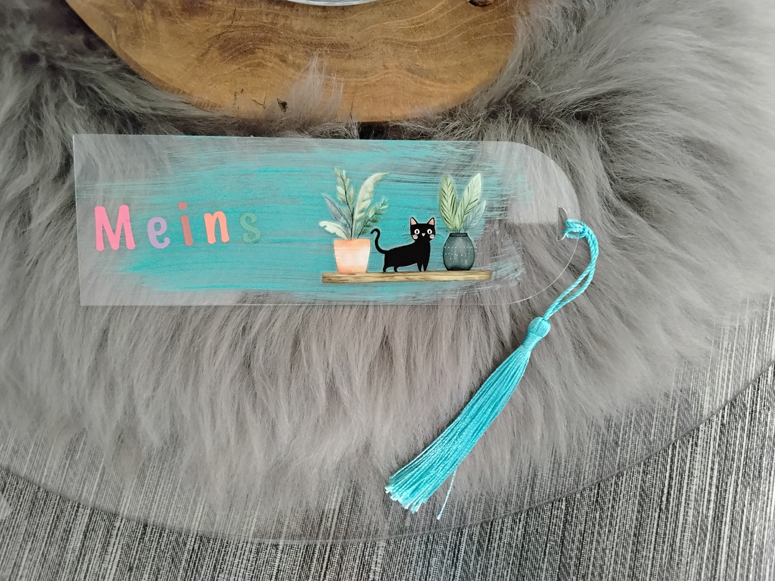 Acryl-Lesezeichen mit schönem Spruch mit farblich passender Quaste.