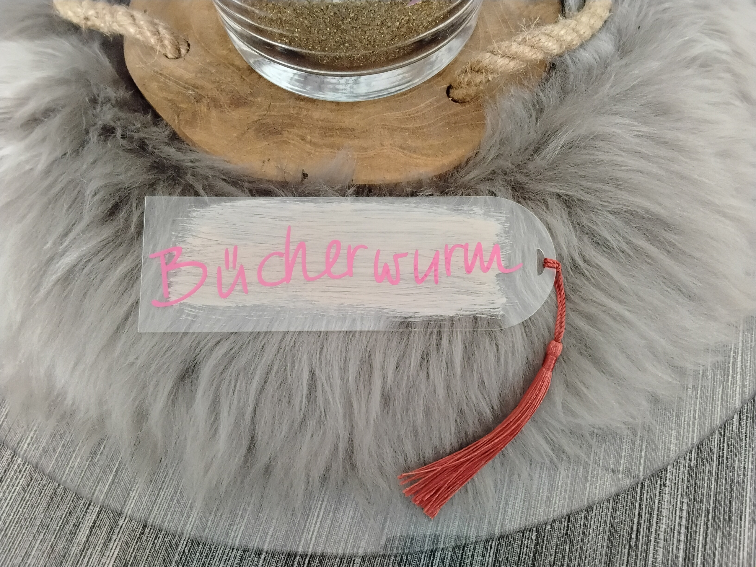 Acryl-Lesezeichen mit schönem Spruch mit farblich passender Quaste.