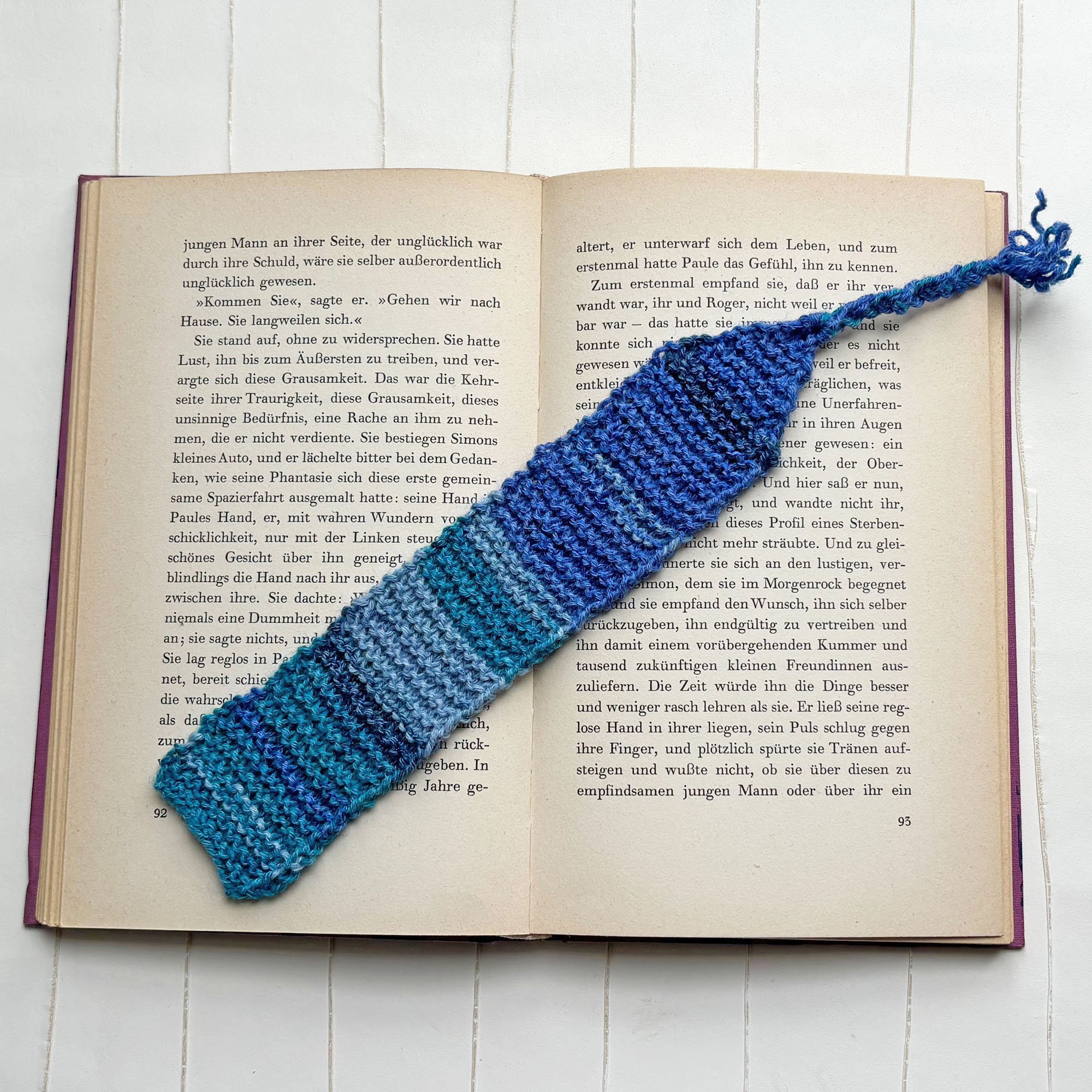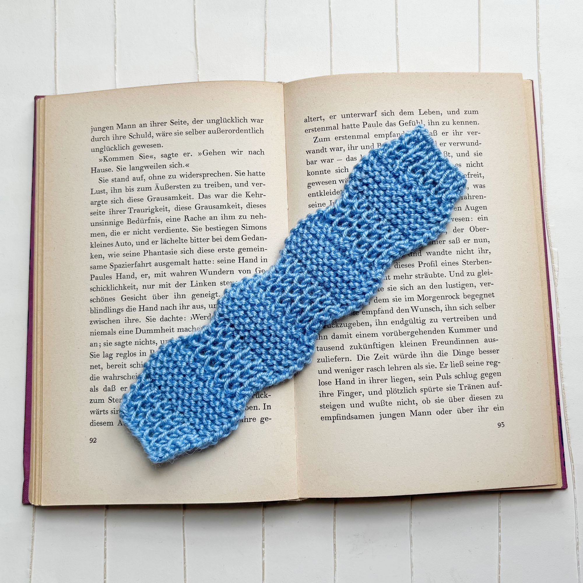 - Blaue Lesezeichen aus dünnem Garn handgestrickt