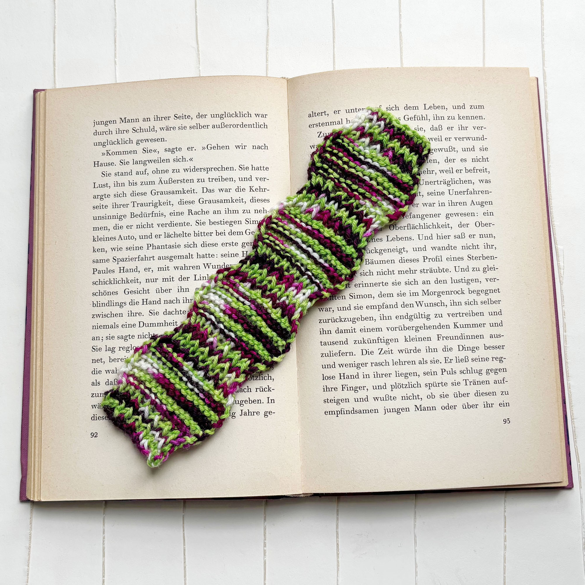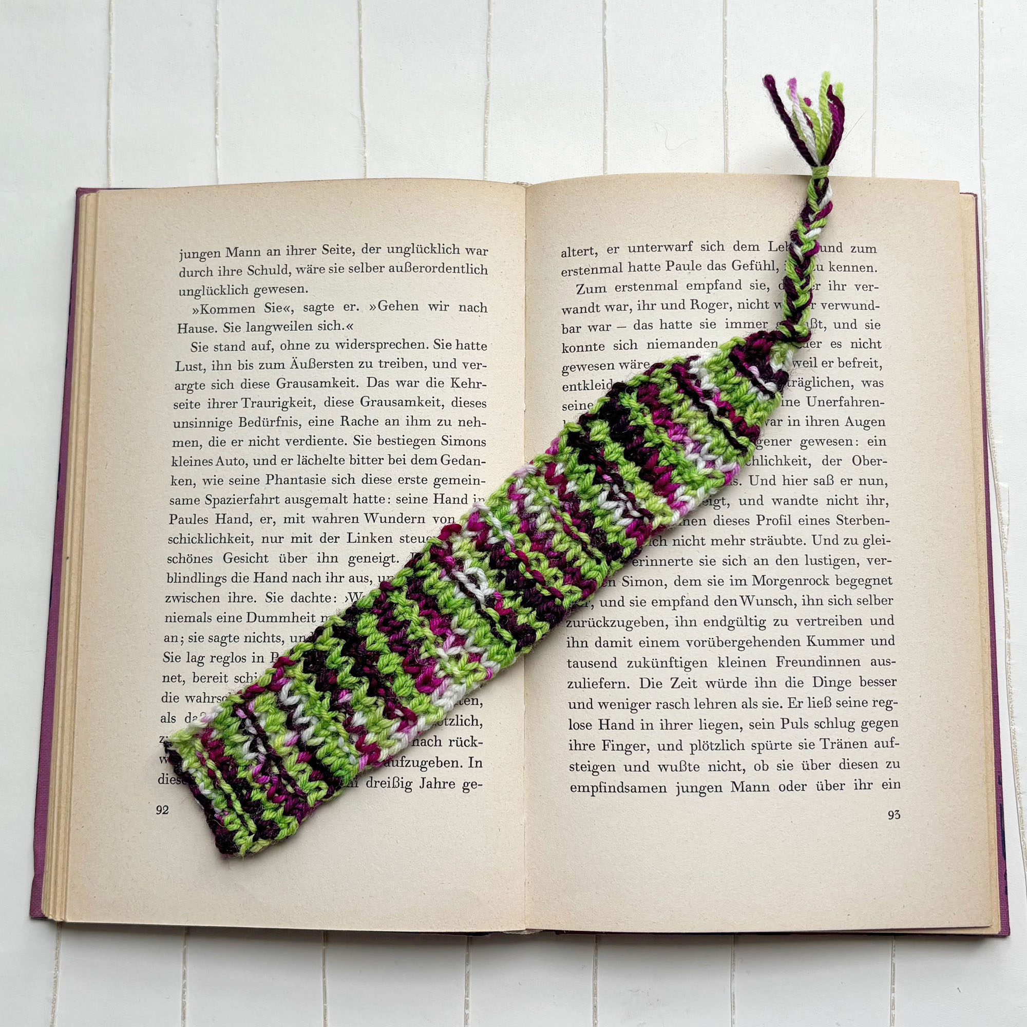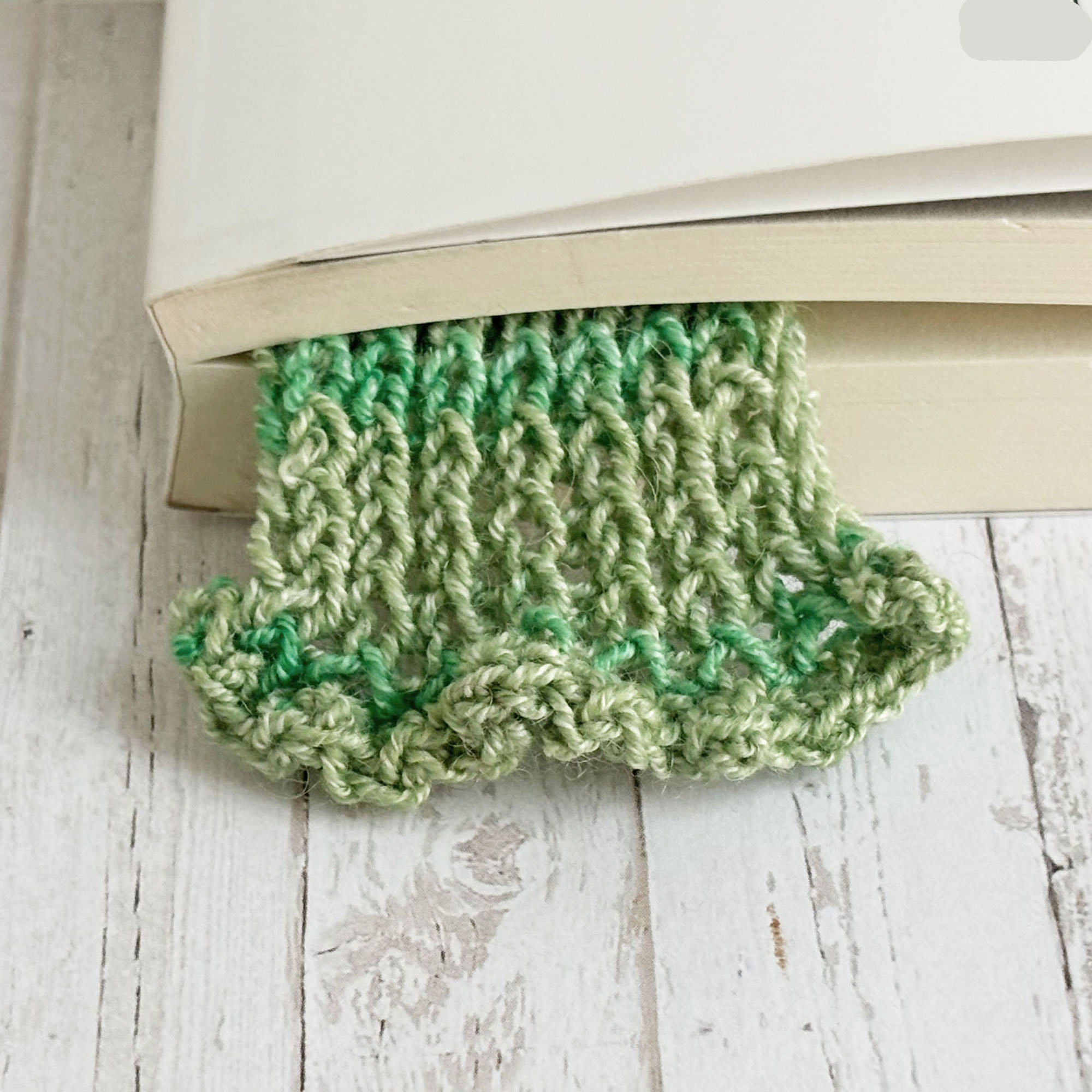Diese Lesezeichen in Grüntönen sind mit Zopf, Rüsche oder in Wellenform handgestrickt.