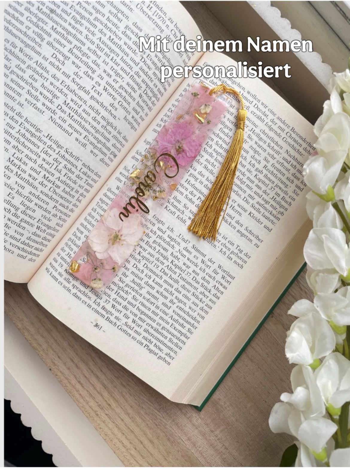 Das Lesezeichen ist 14 cm lang und wird mit seinem einschnappen personalisiert . Es sind zwei echte getrocknete Blumen sowie schleierkraut eingearbeitet . Die Schrift ist in Gold