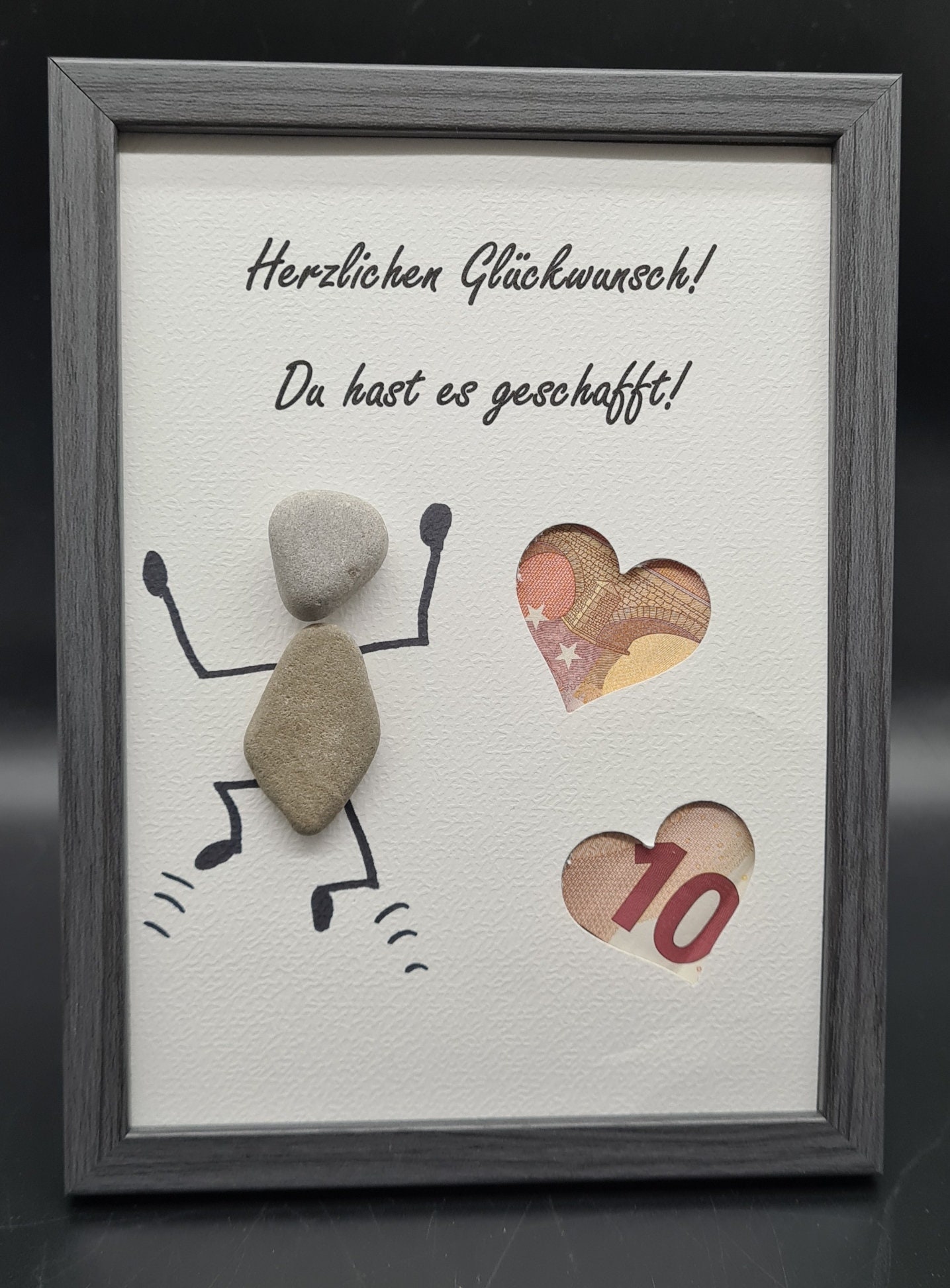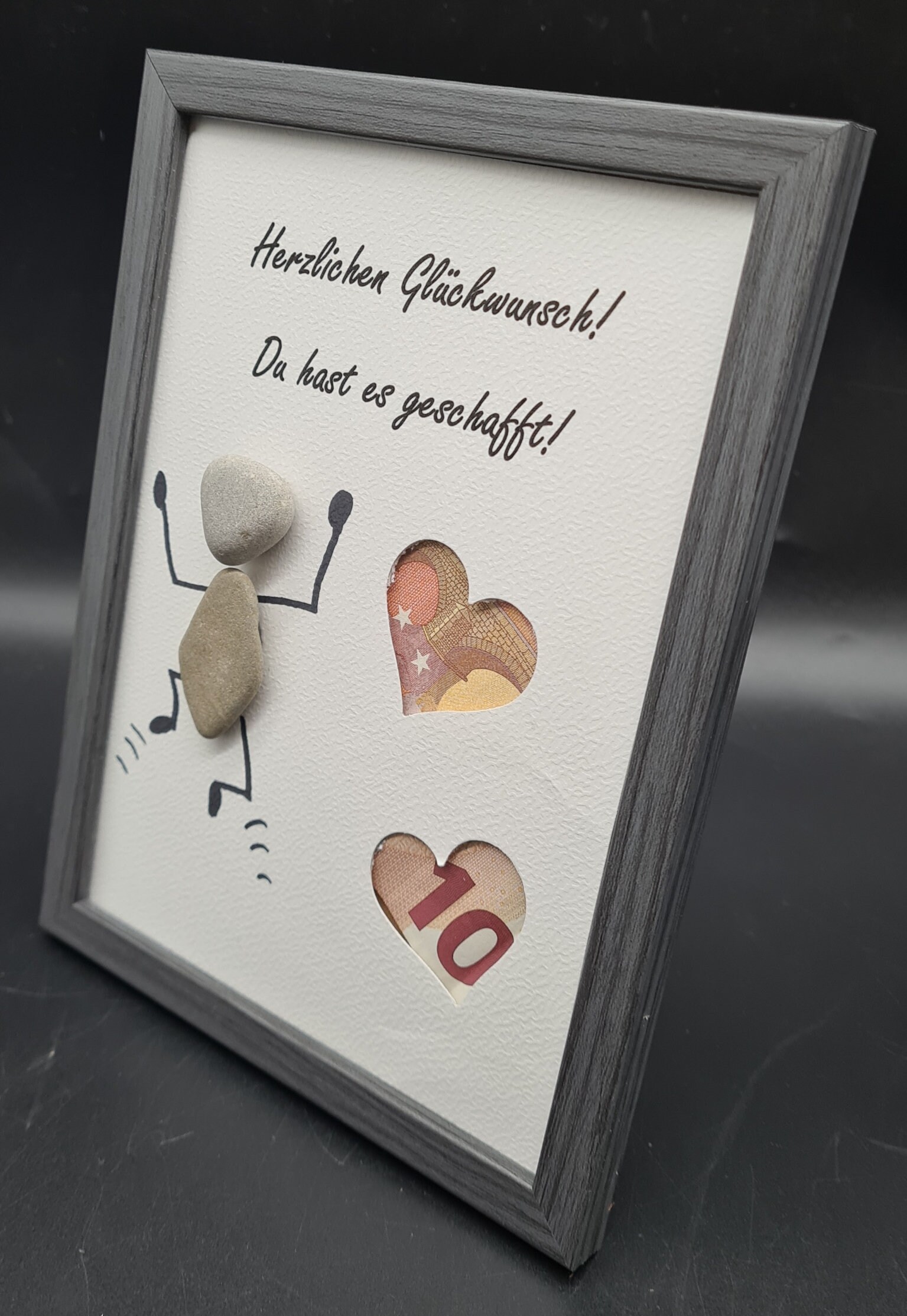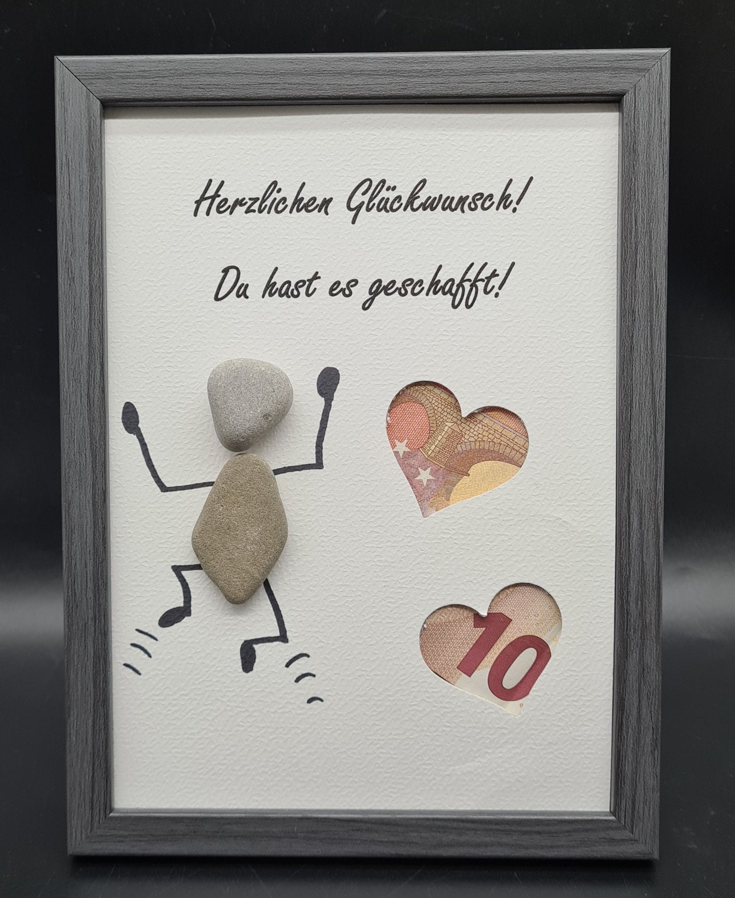 Liebevoll handgefertigtes Steinbild als Geldgeschenk mit dem Spruch "Herzlichen Glückwunsch! Du hast es geschafft!"