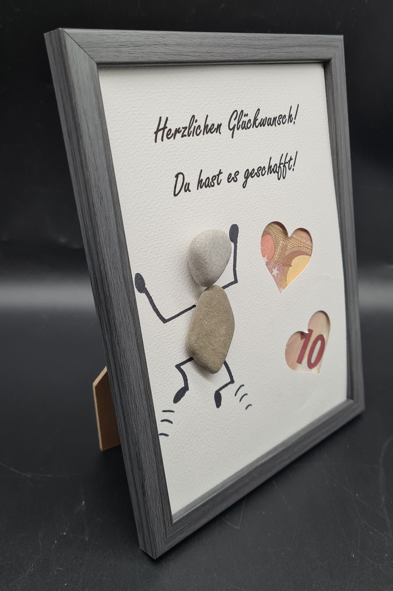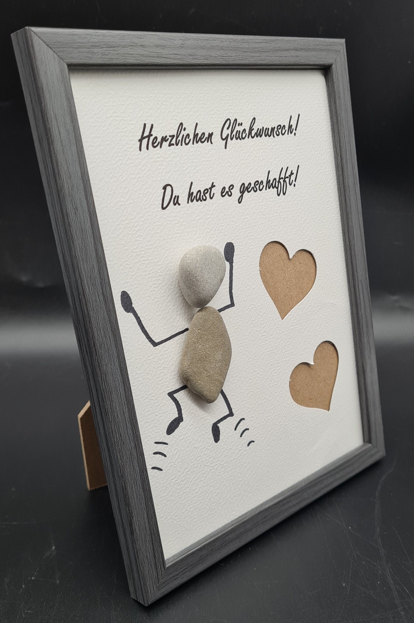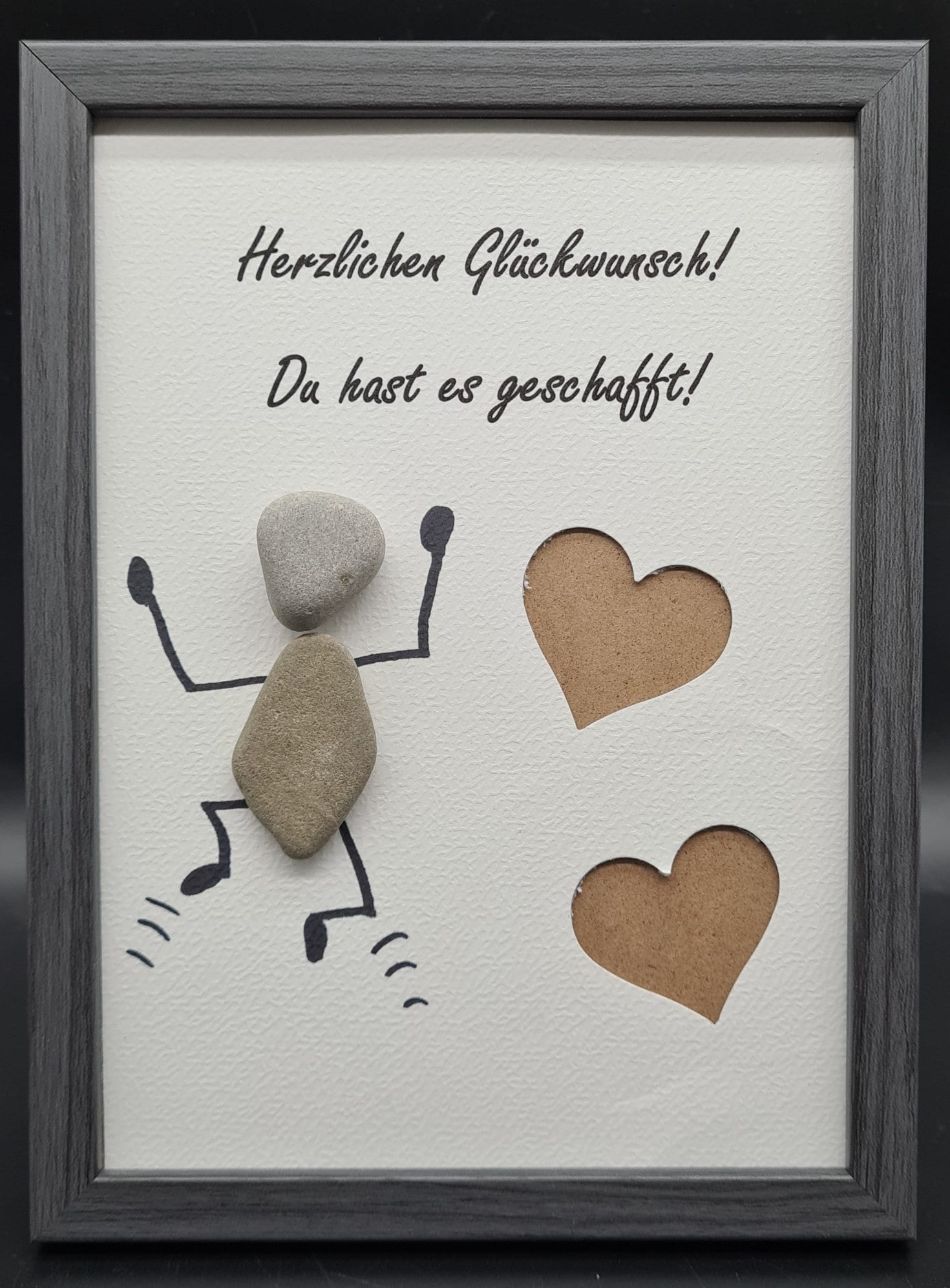 Liebevoll handgefertigtes Steinbild als Geldgeschenk mit dem Spruch "Herzlichen Glückwunsch! Du hast es geschafft!"