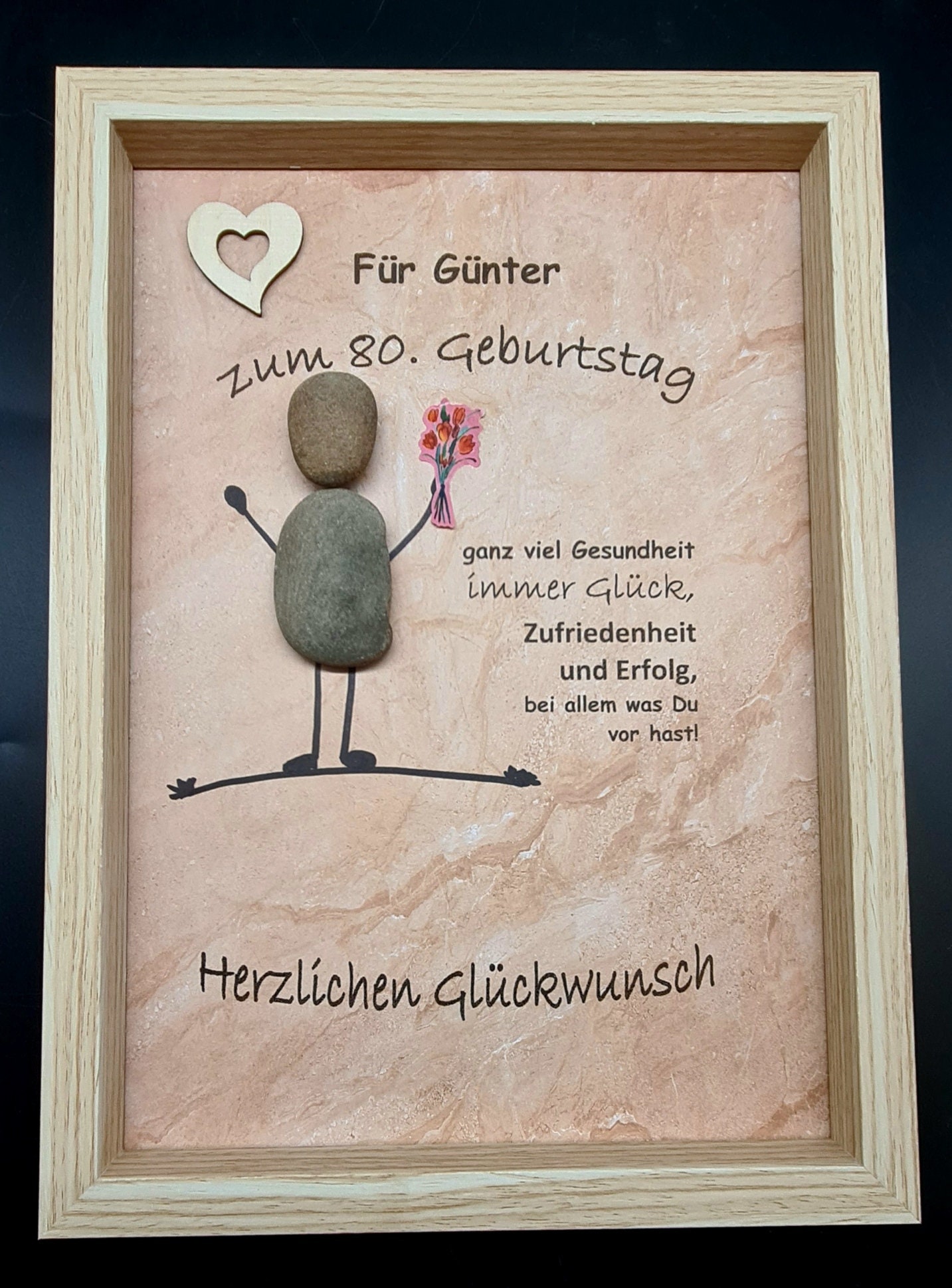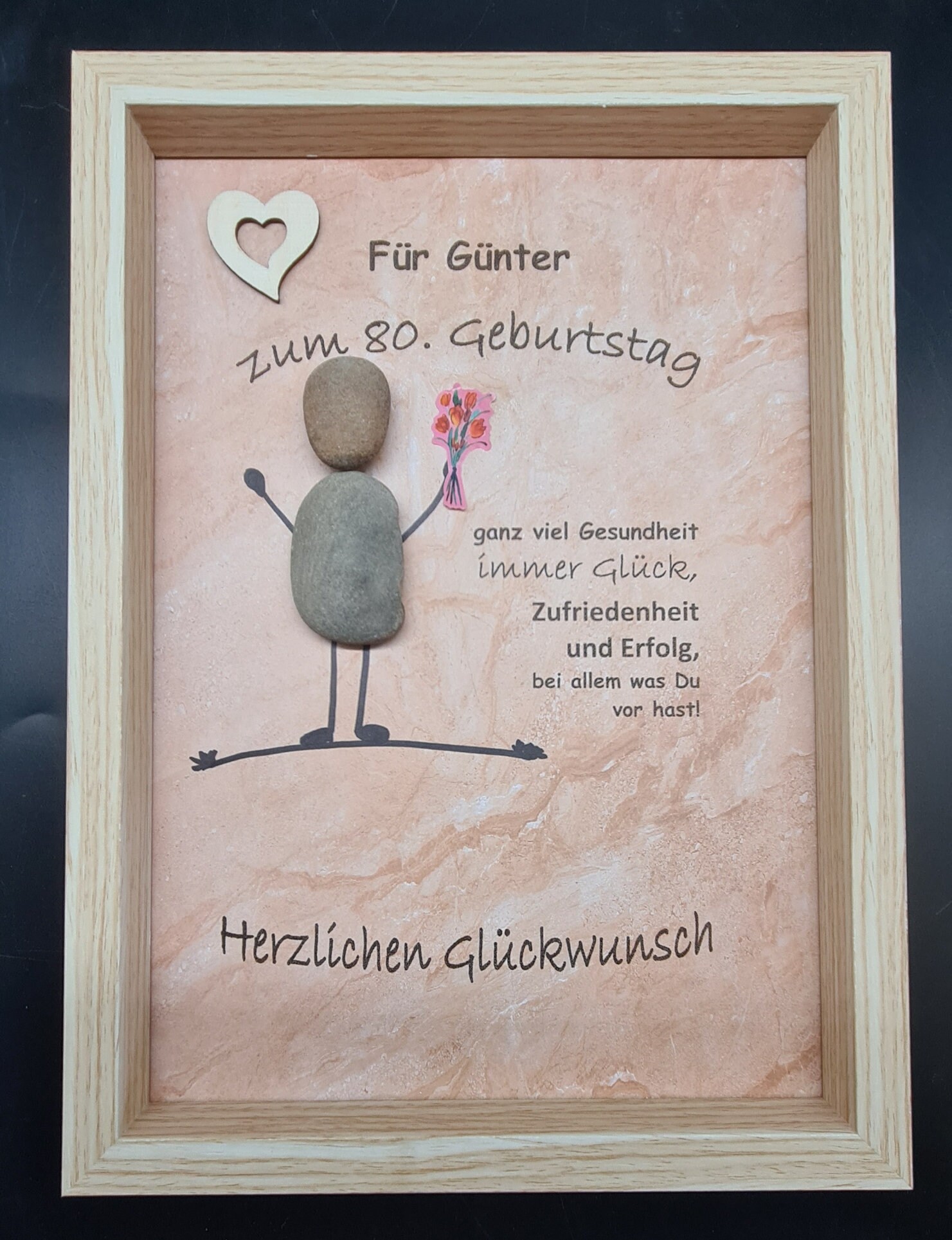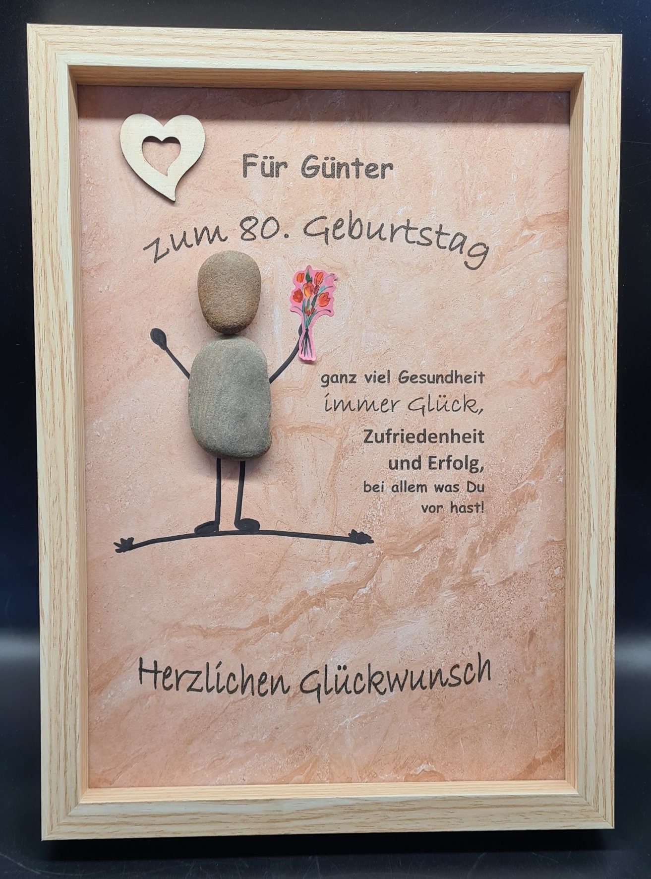 Liebevoll handgefertigtes Steinbild, personalisierbar mit dem Namen des Geburtstagskindes und mit der Zahl, um den wievielten Geburtstag es sich handelt.