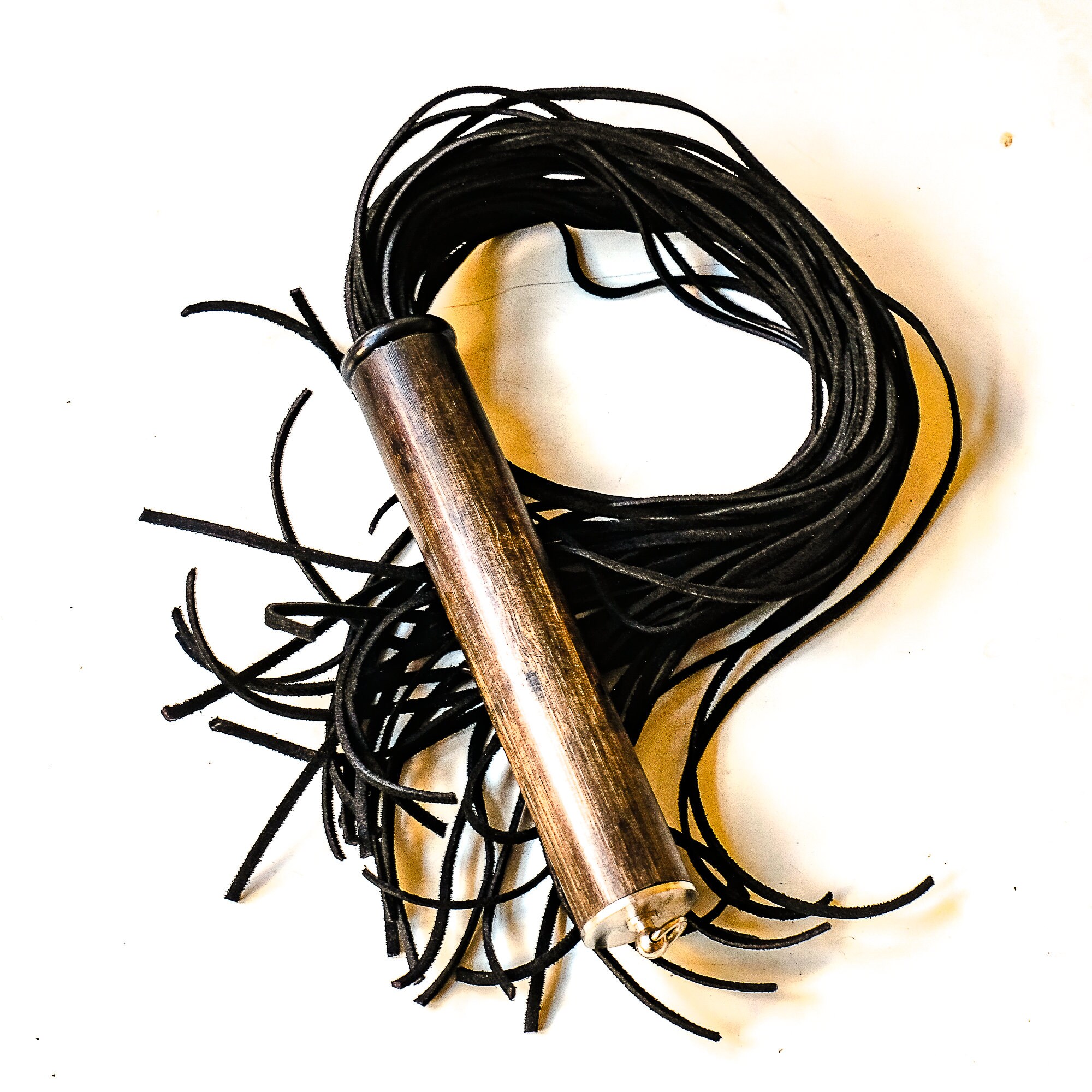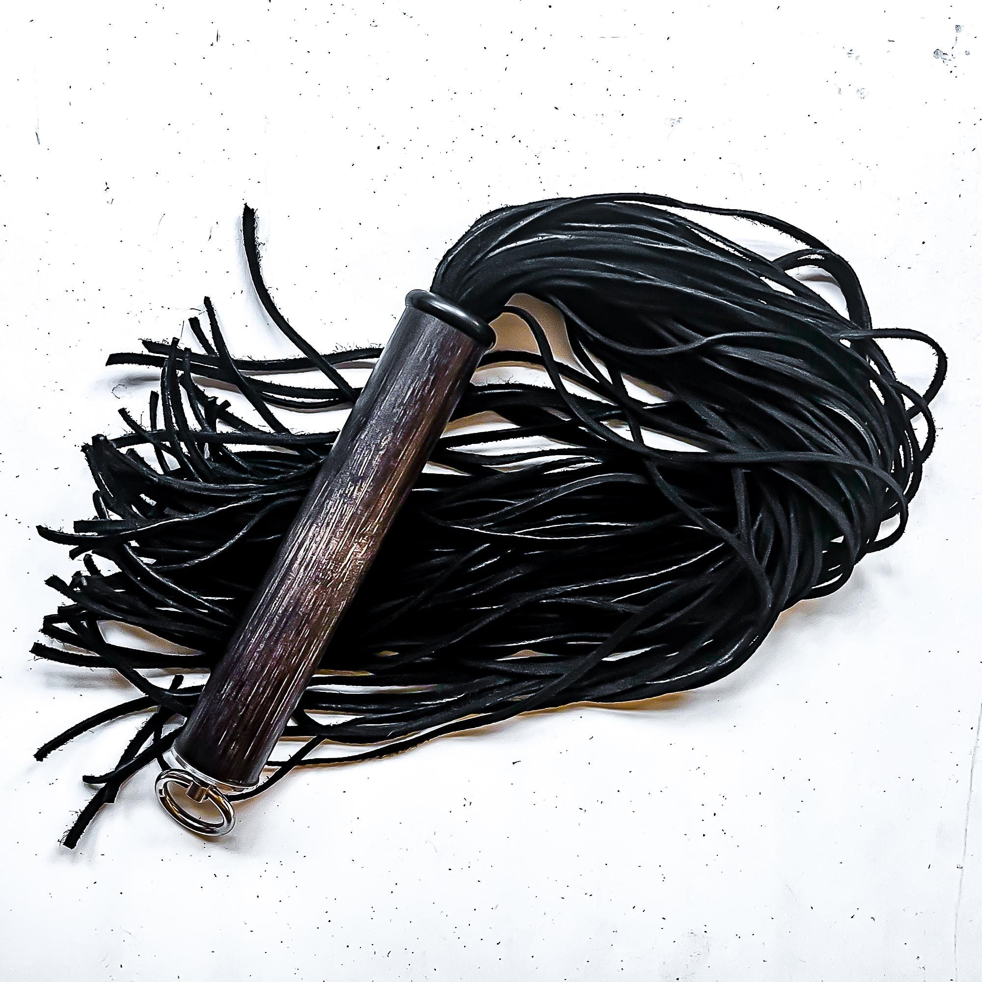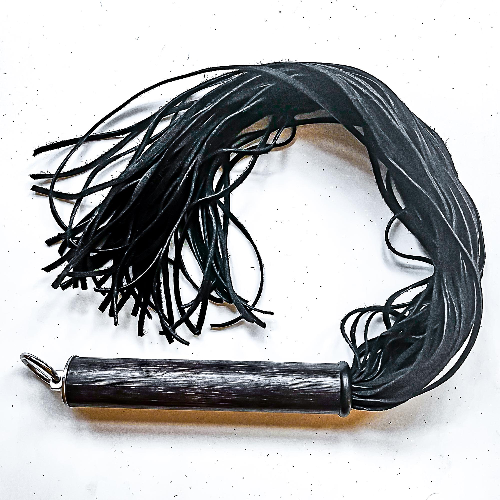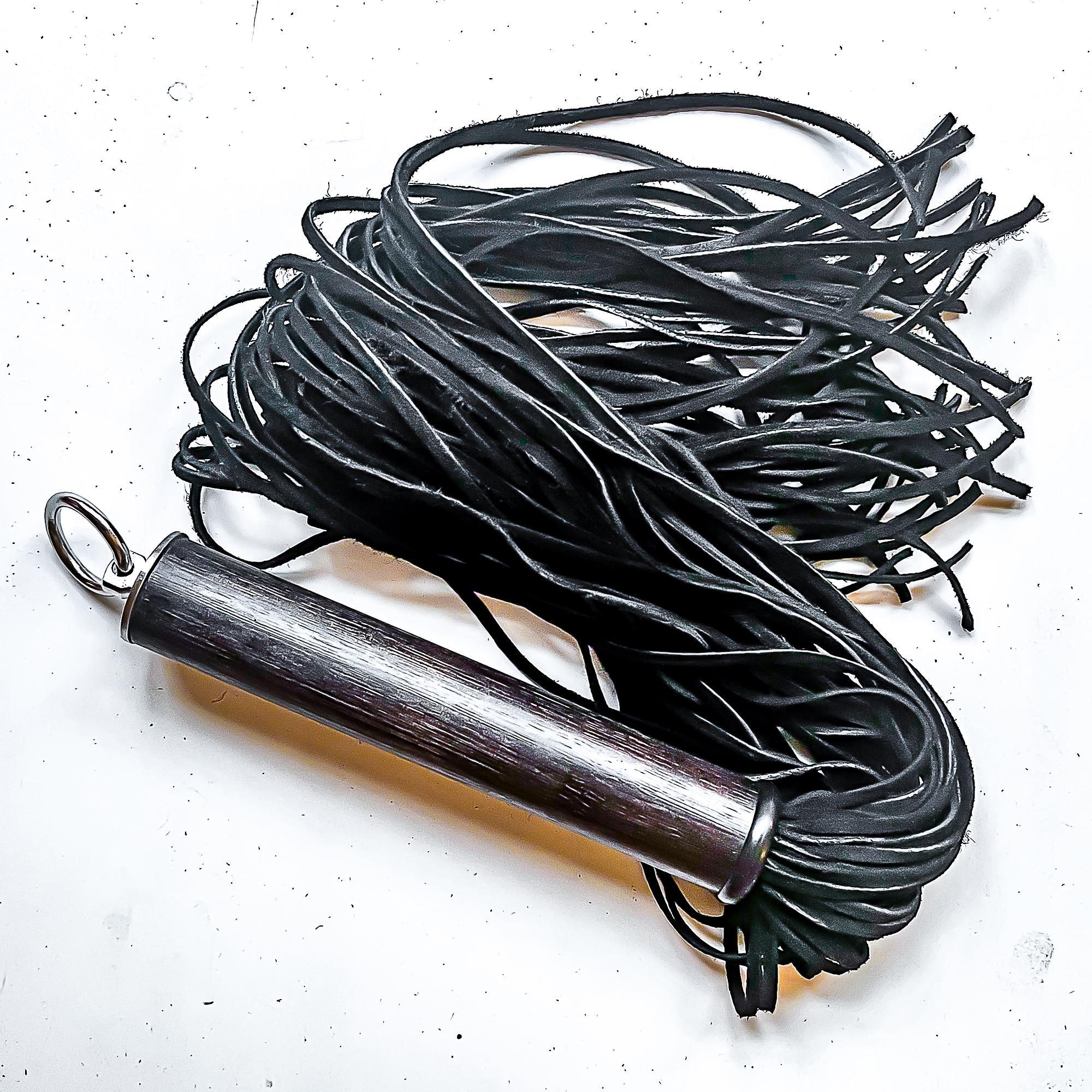 Flogger mit 40 Strängen aus schwarzen 3x2mm Velourslederstreifen, ca. 61cm/24", davon ca. 17cm/7“ Griff aus individuell gefärbtem Bambusholz, veredelt mit feinstem Lack und mit einem Abschluss aus V2A Edelstahl.