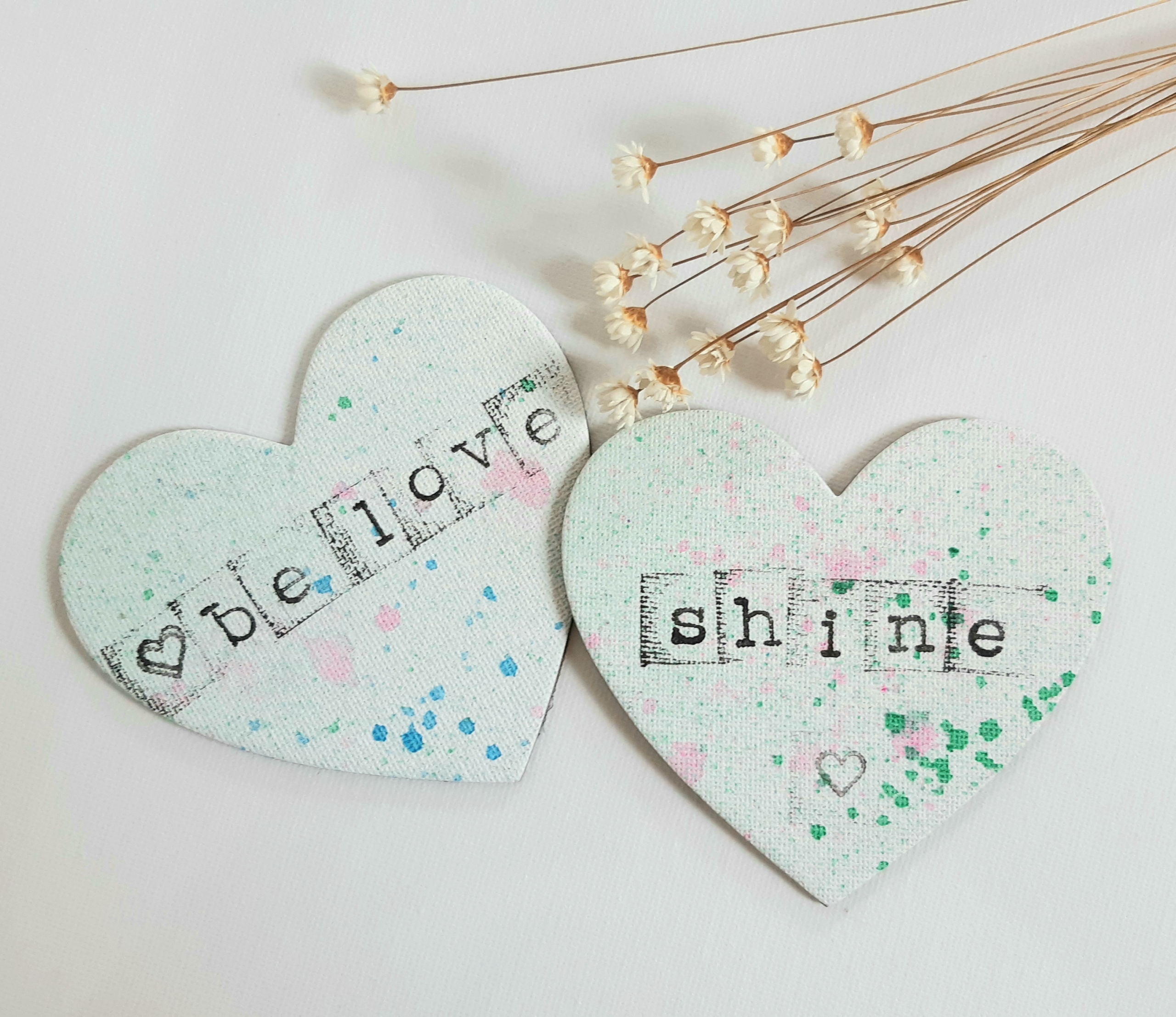 Set aus 2 handbemalten Magneten im Leinwand-Design mit Bestärkungsbotschaften, 2x Herzform