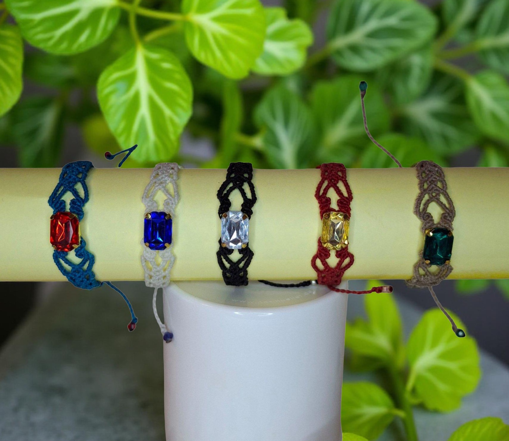 Dieses handgefertigte Makramee-Armband ist schlicht mit einem Strasstein in der Mitte.