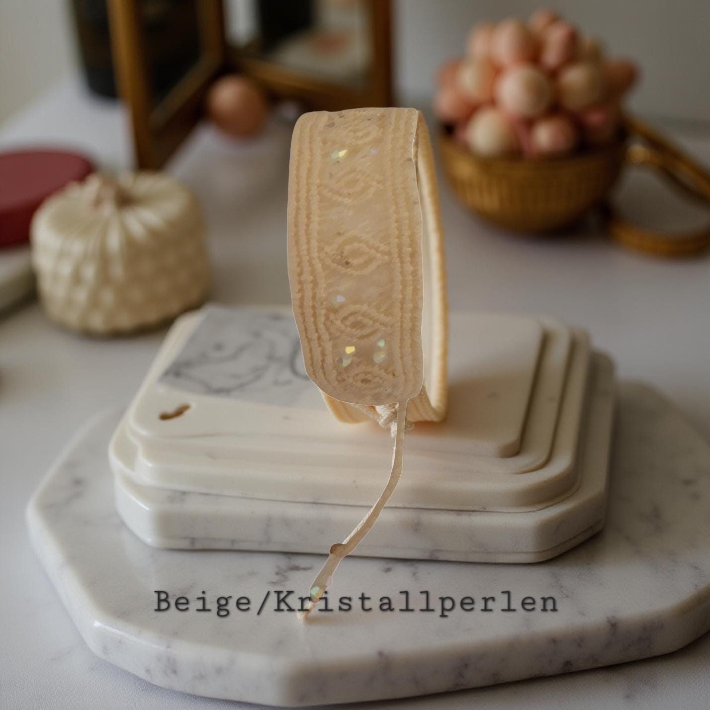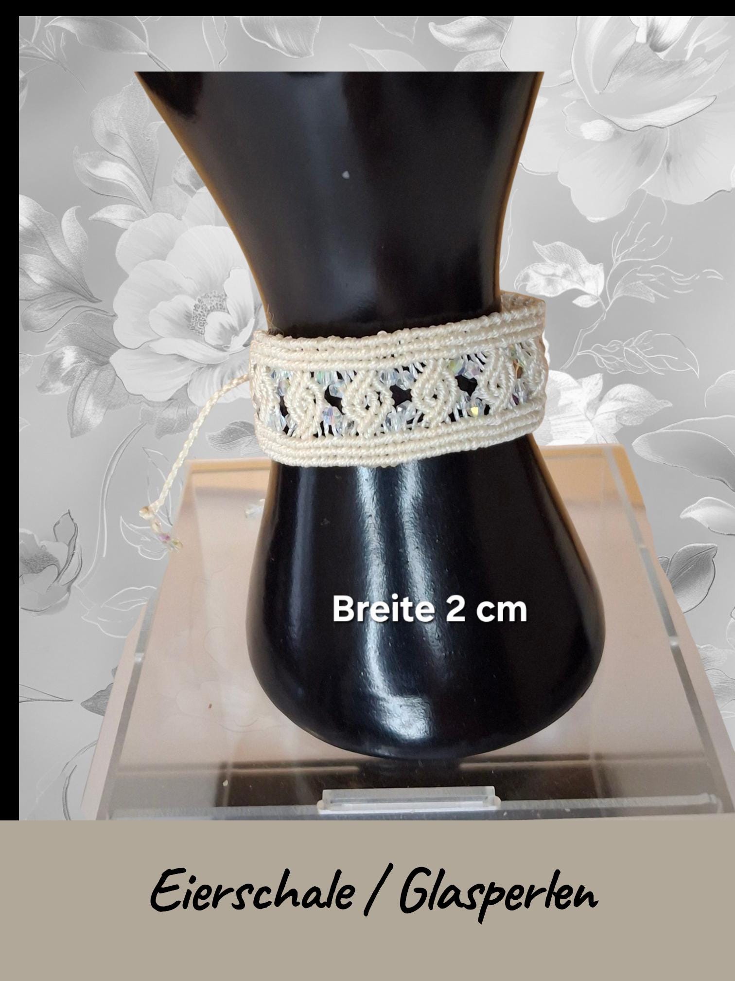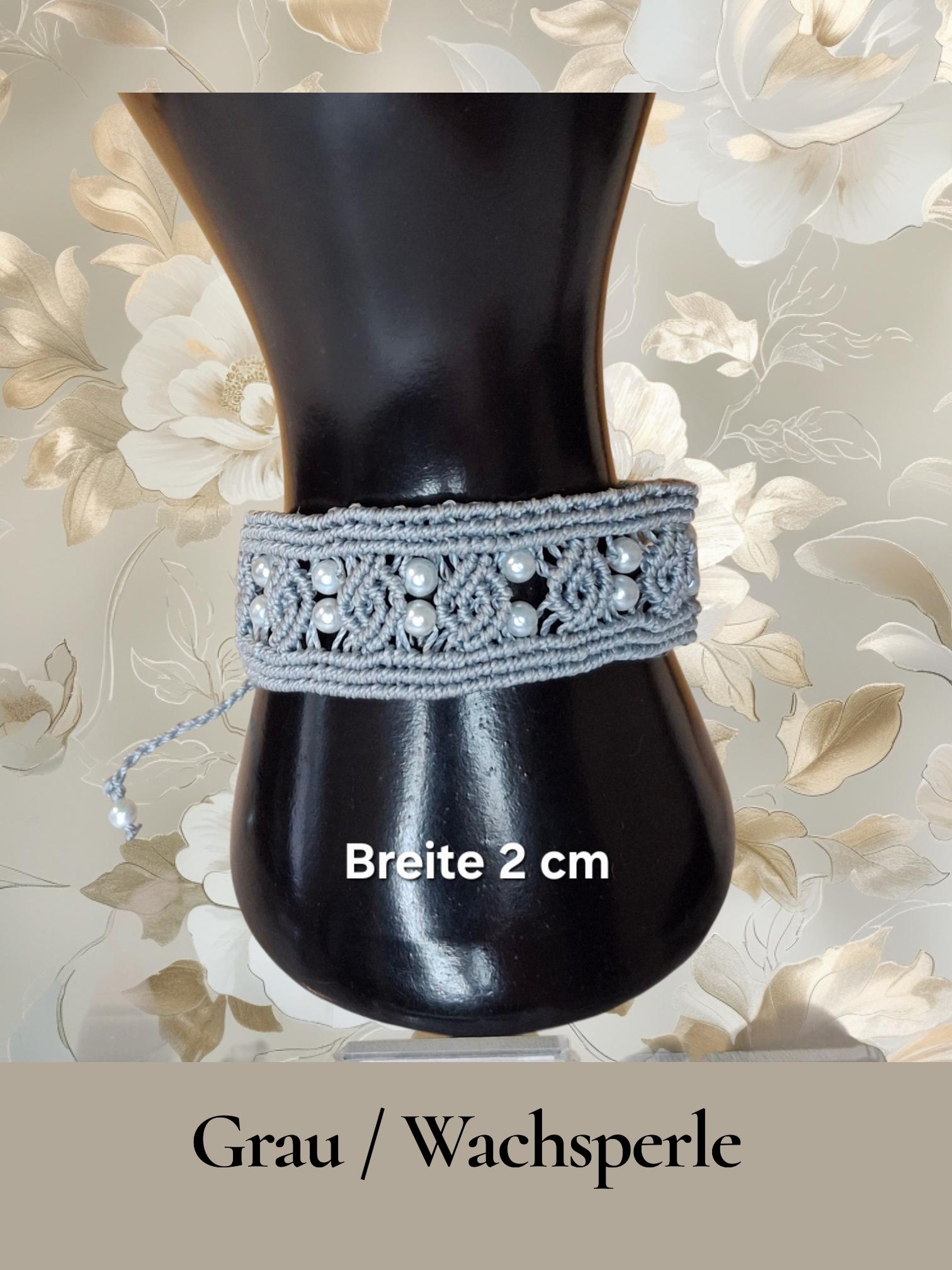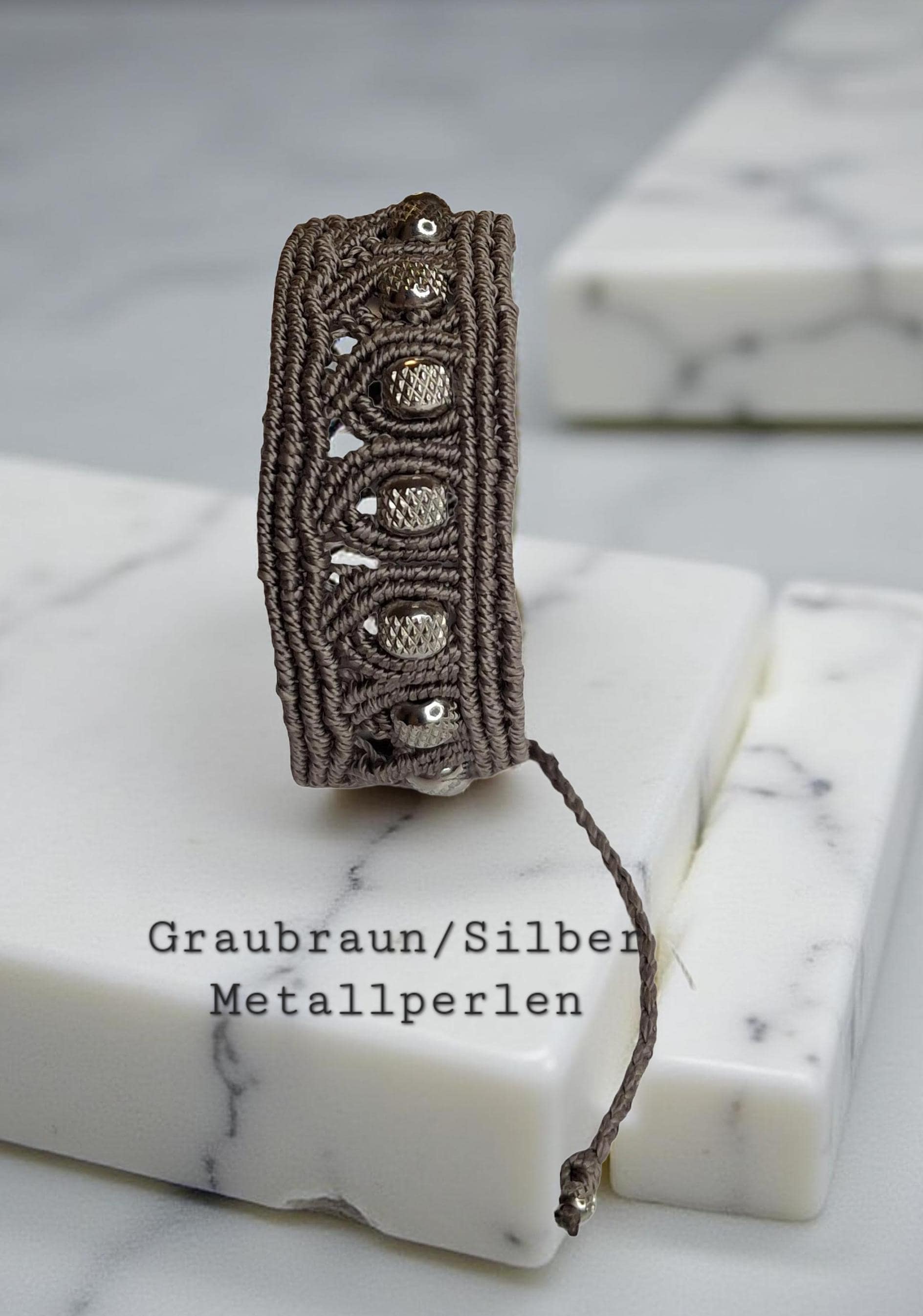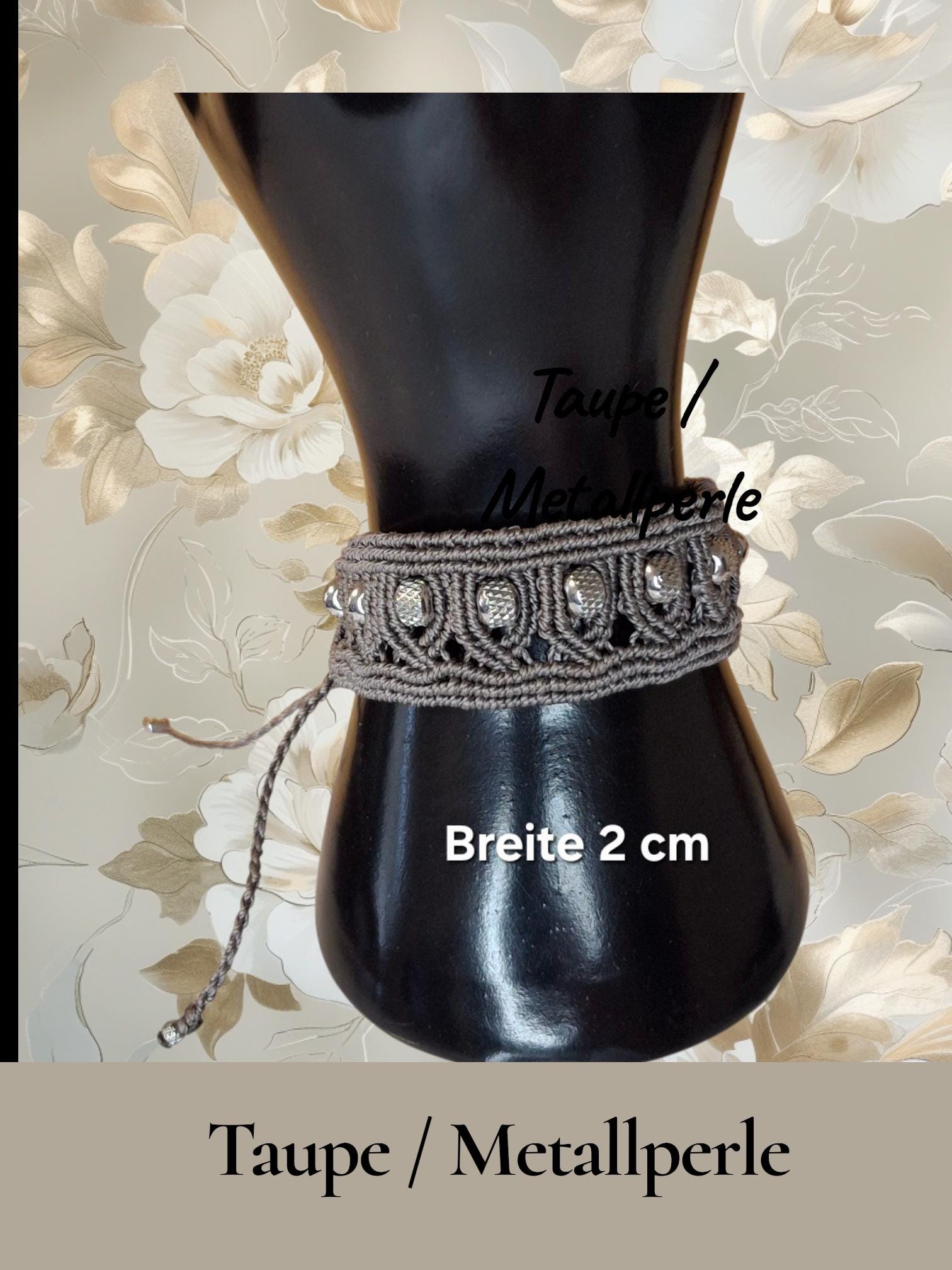 Dieses handgefertigte Makramee-Armband ist mit Glas- Metall oder Wachsperlen gemacht.