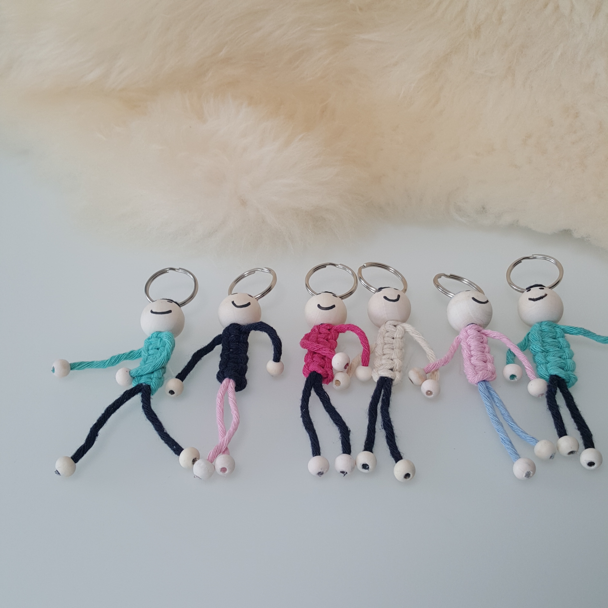 Schöne handgemachte Makramee Schlüsselanhänger in individueller Gestaltung. Hier bekommst du einen Schlüsselanhänger der sich hervorragend als Geschenk für Kinder, Mitgebsel oder als kleines Dankeschön für Erzieher*innen eignet. Sie sind aus einer Baumwollschnur in unterschiedlichen Farben gefertigt. Sie haben an der Oberseite einen Schlüsselring mit 3,5 cm Durchmesser.