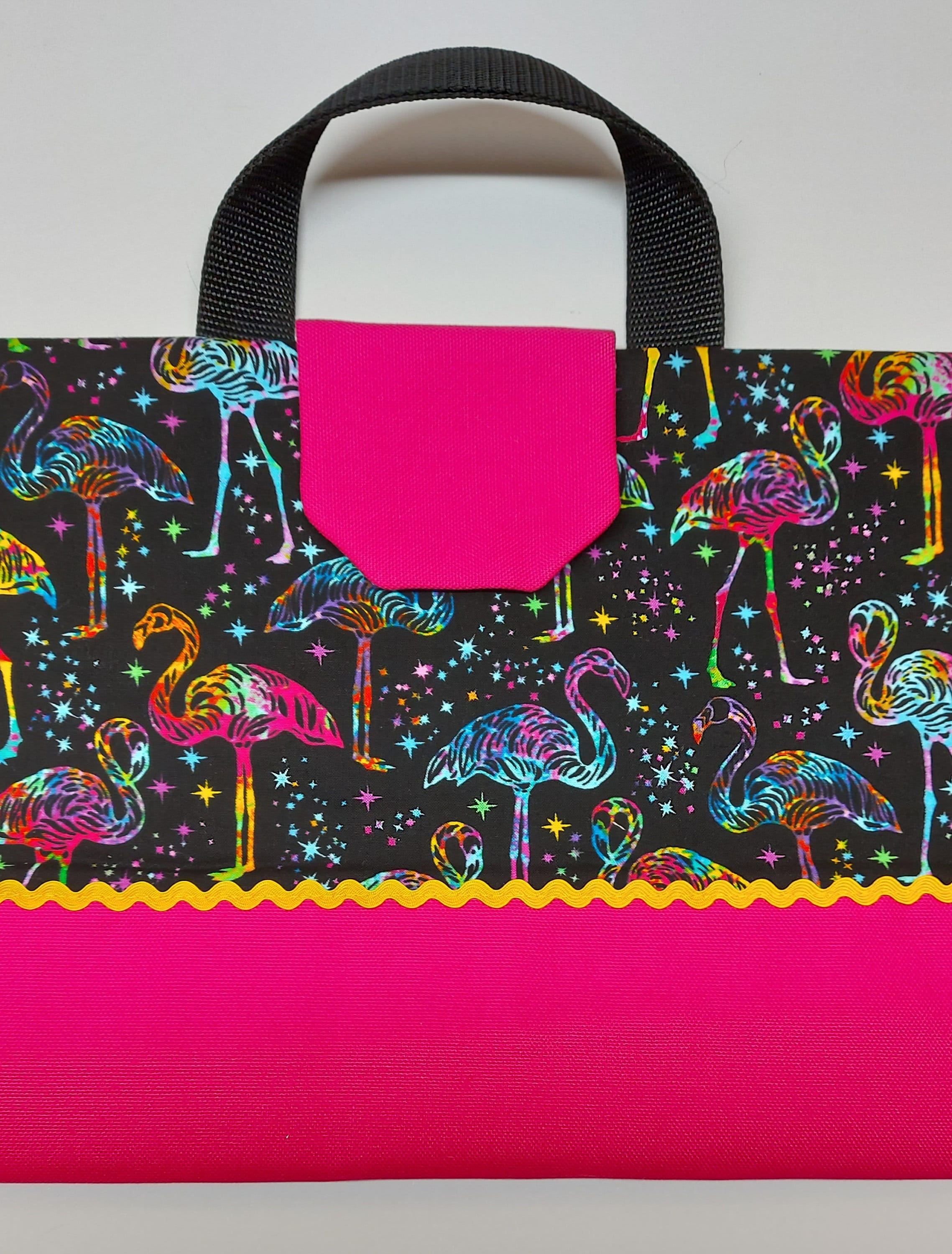 Die Tasche ist leicht verschließbar durch Klettverschlüsse und komplett mit Volumenvlies abgefüttert. Sie ist vorsichtig bei 30° Grad Schonwäsche waschbar und kann nach dem Trocknen auch übergebügelt werden.