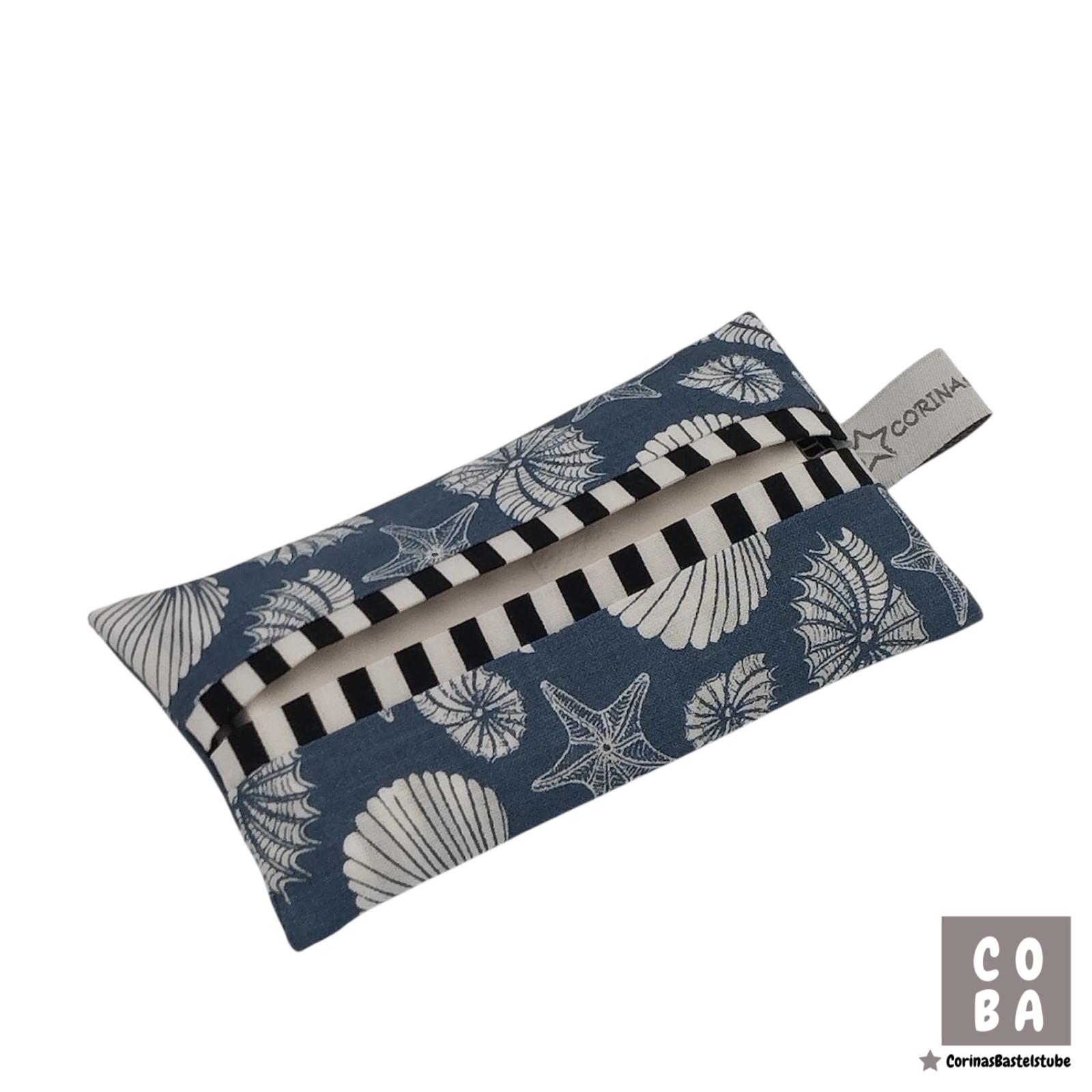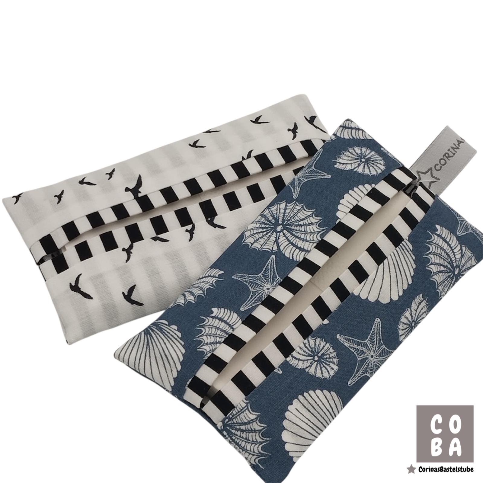 Diese liebevoll genähte Taschentüchertasche im maritimen Design mit Möwen und Muscheln bringt Nordsee-Feeling in deinen Alltag.