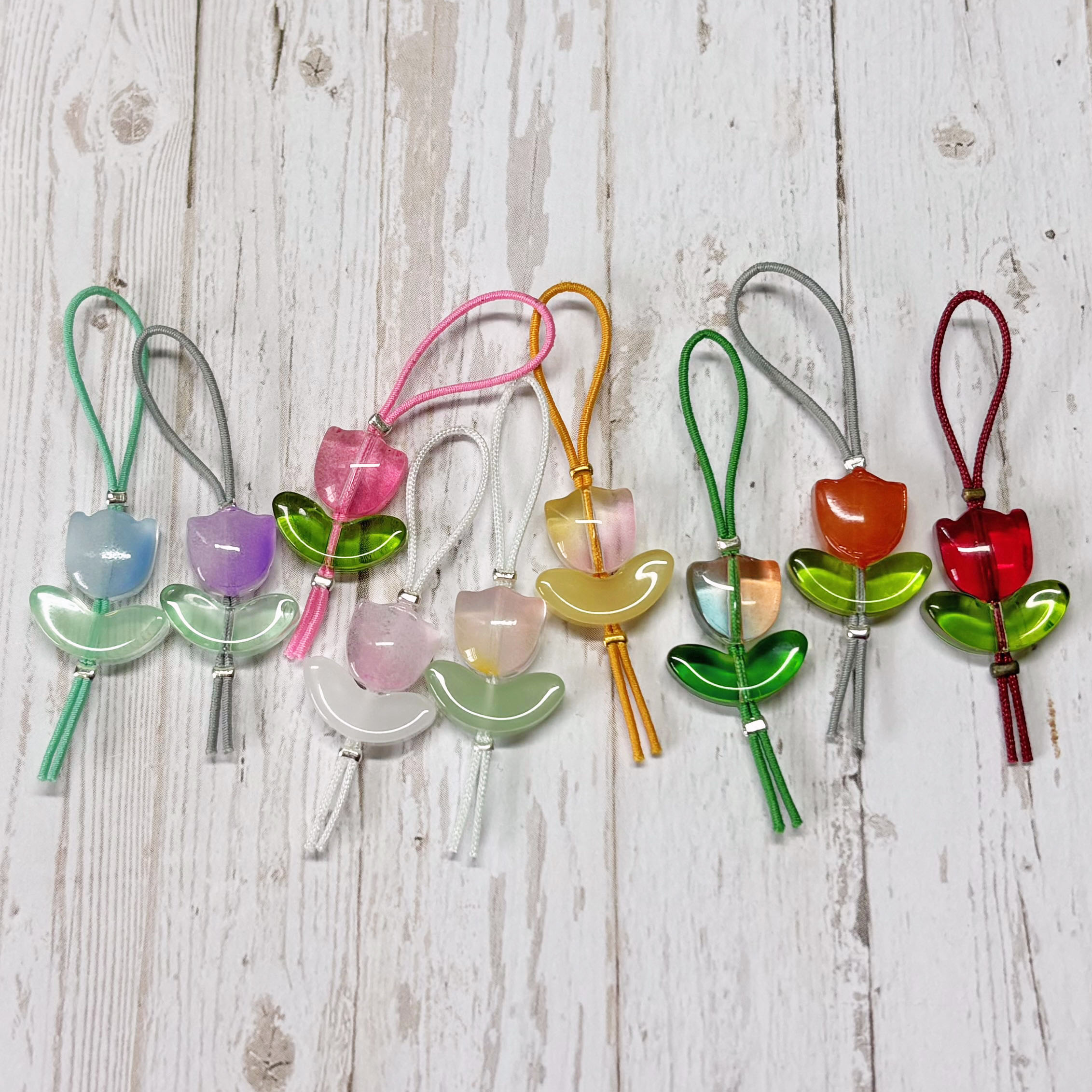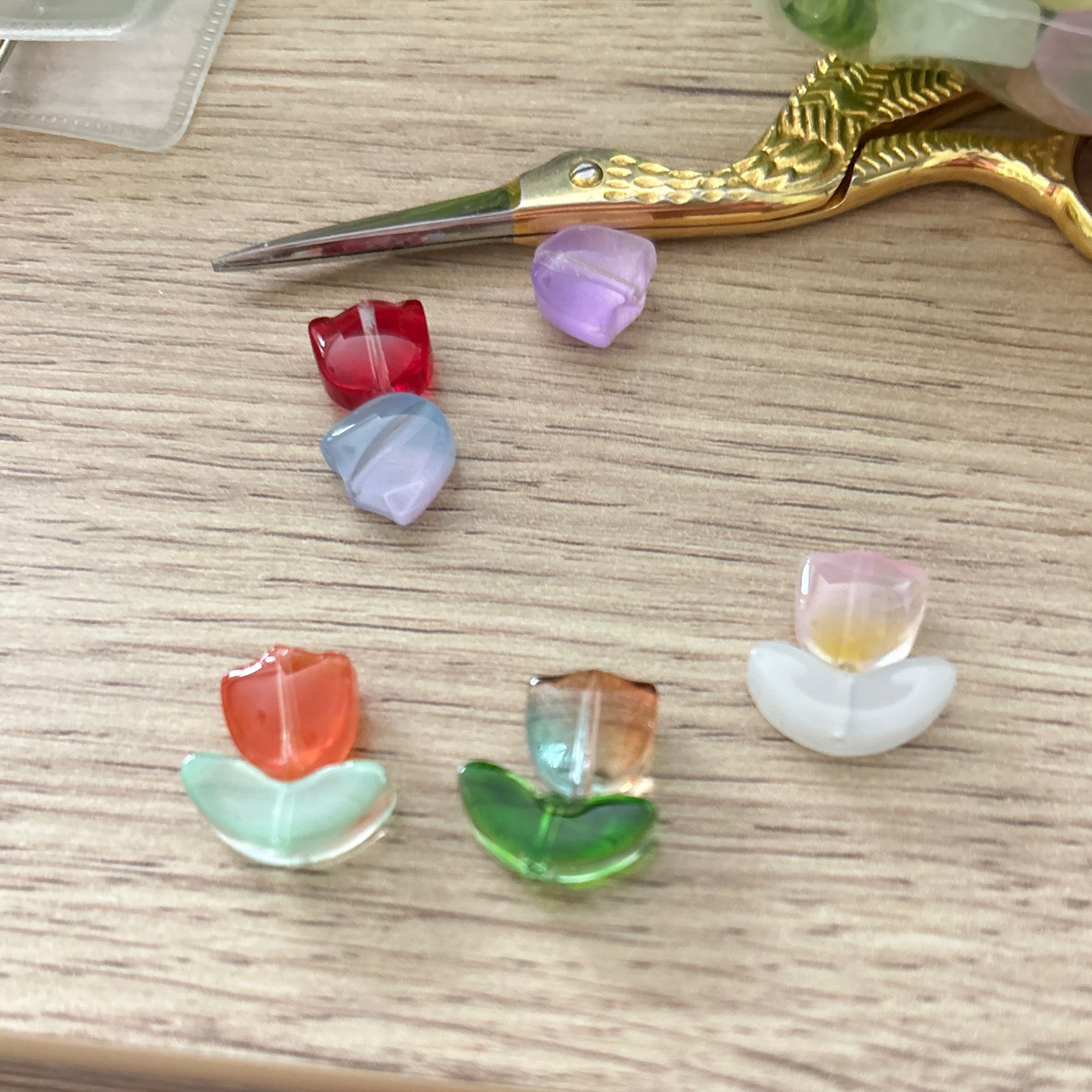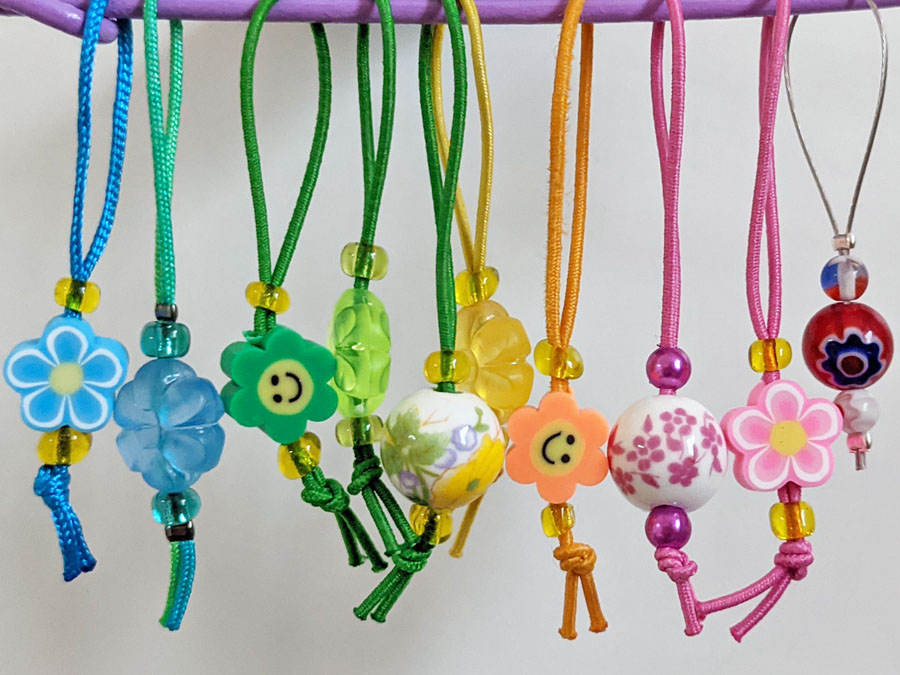 - Glas, Acryl, Knetmasse, bemalte Keramik, Schmuckschnur, Metall, Gummiband