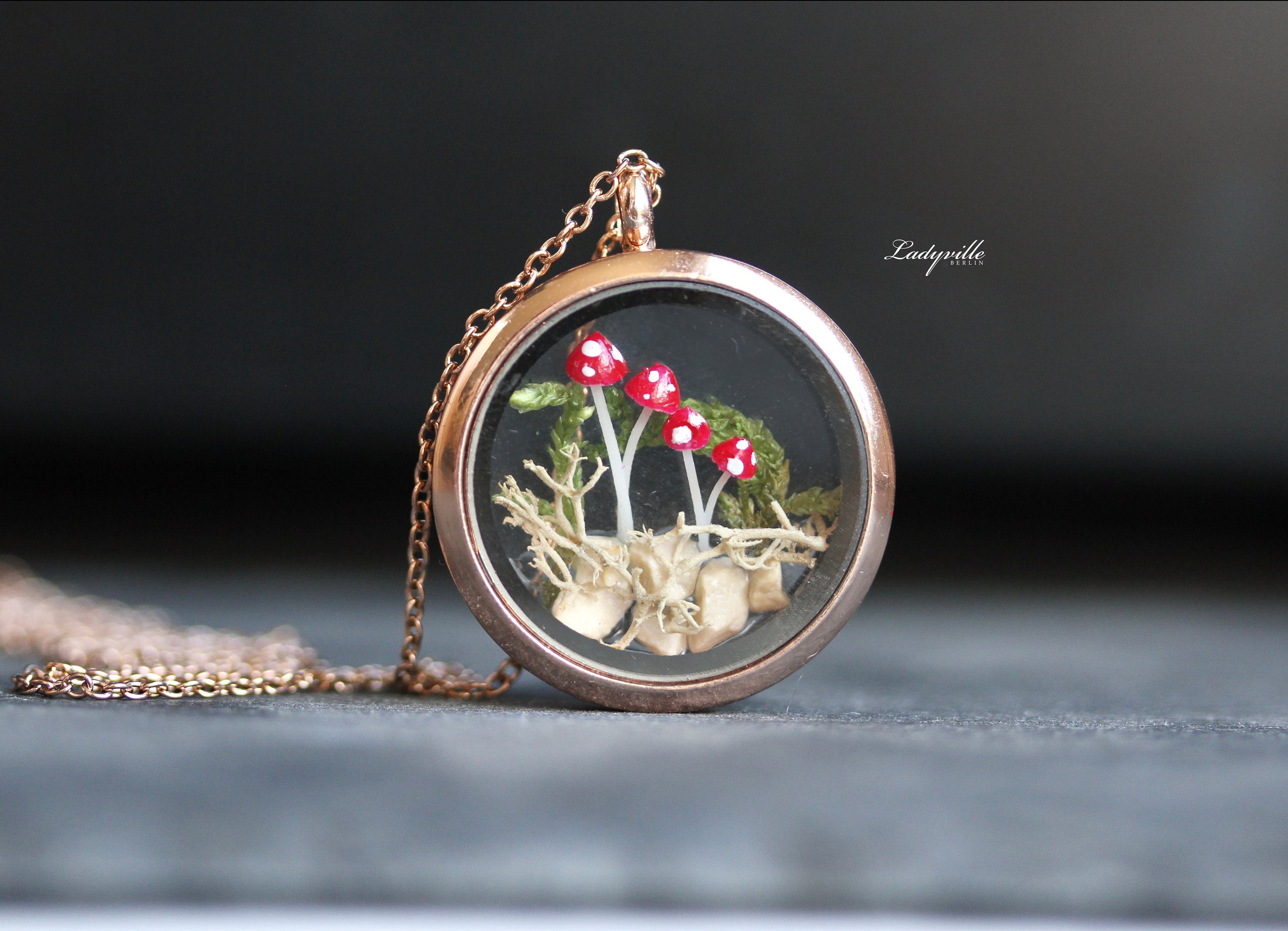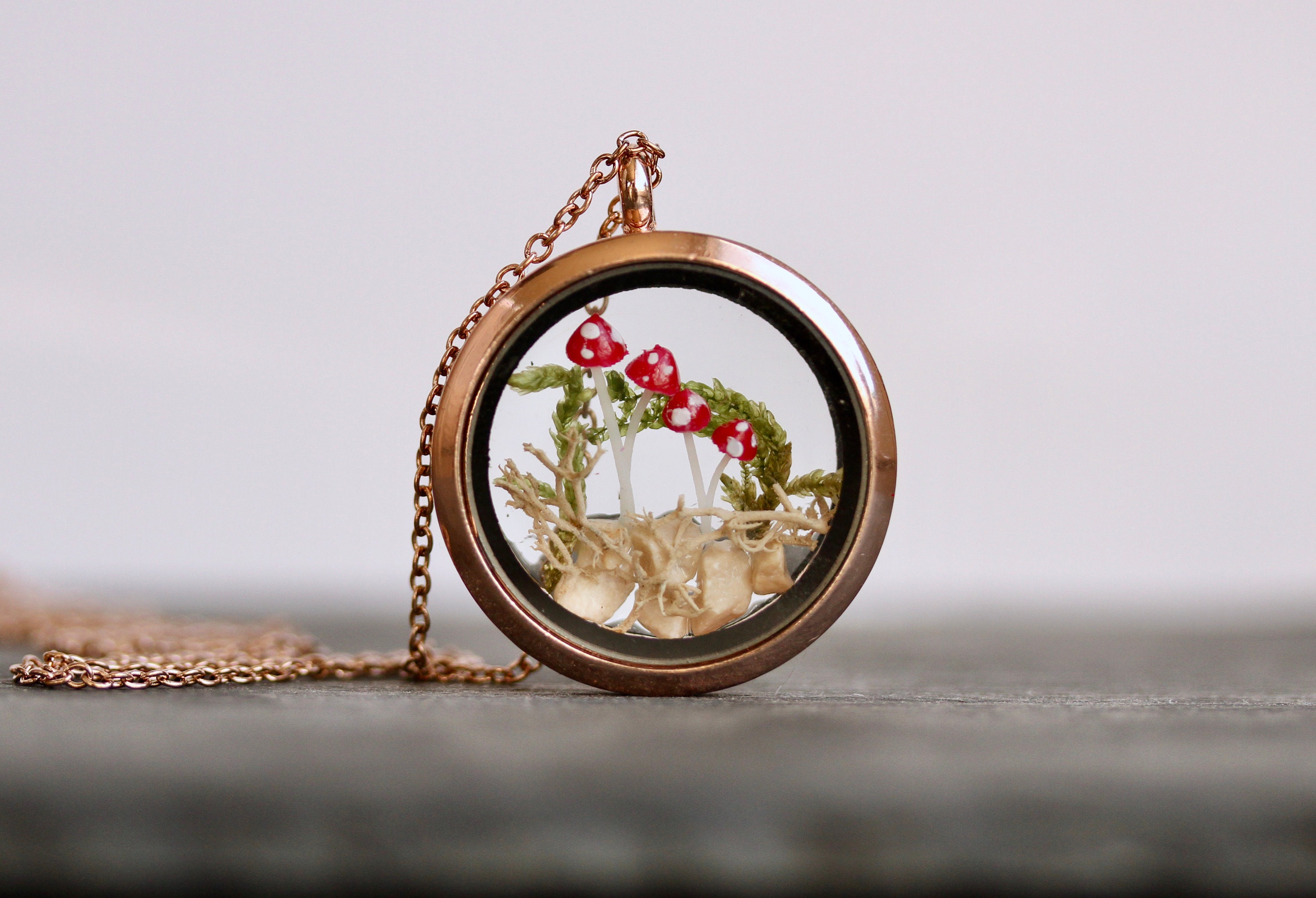 Wie ein Stück verwunschen Waldboden mit Pilzen die rot leuchten, etwas Moos und ein paar Kieselsteinen, kommt diese kleine Kette mit rosegoldfarbenen Medaillon daher. Die Pilze sind per Hand geformt. Damit nicht alles hin und her wirbelt, wurden die Elemente am Boden mit Gießharz sorgfältig fixiert. Die feine Kette ist aus hochwertigen Edelstahl, rosegoldfarben legiert.