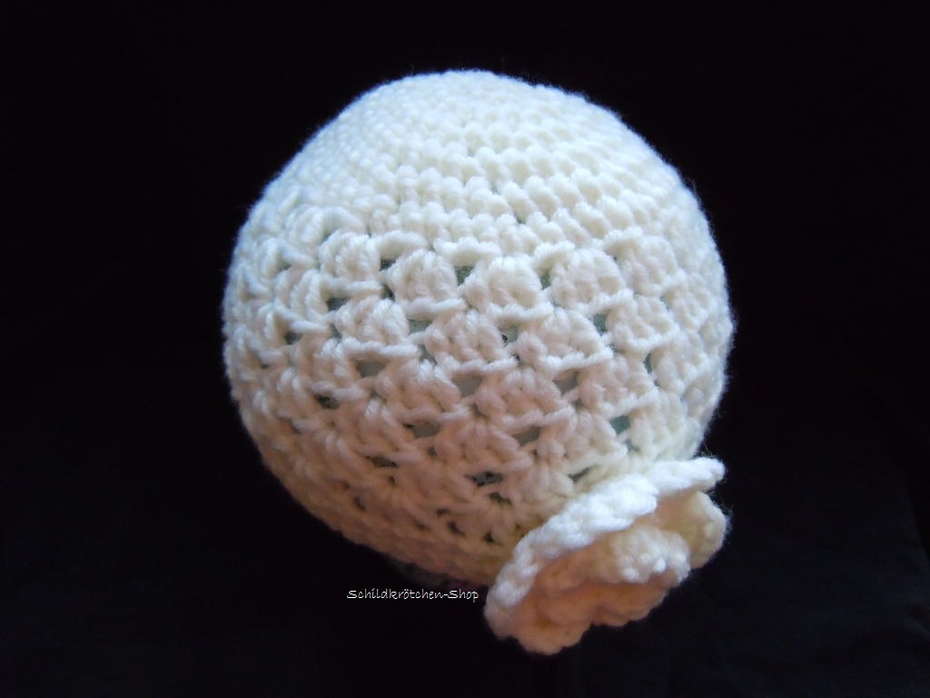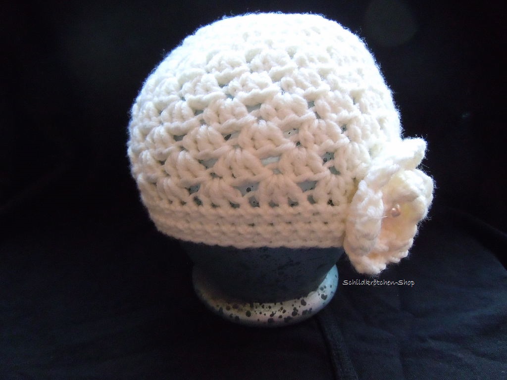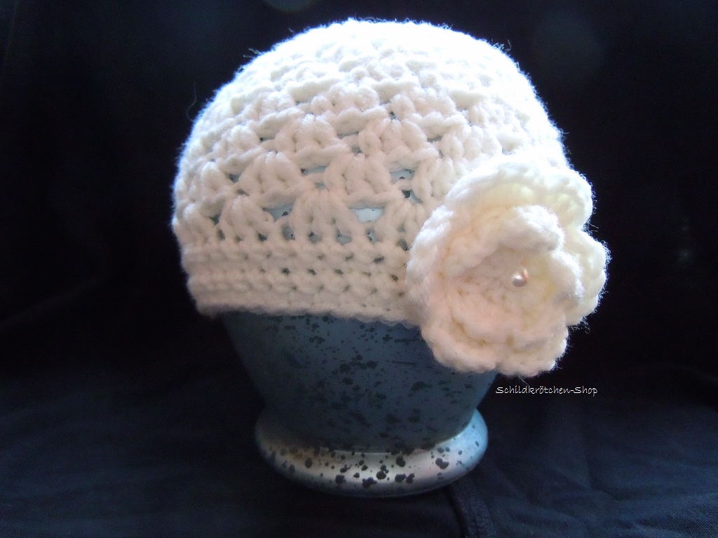 Verziert ist die süße Taufmütze mit einer großen Blüte und einer Acrylperle.
