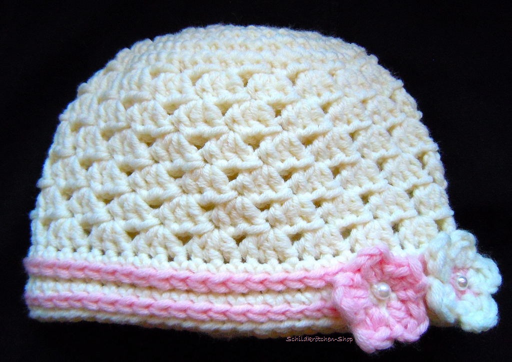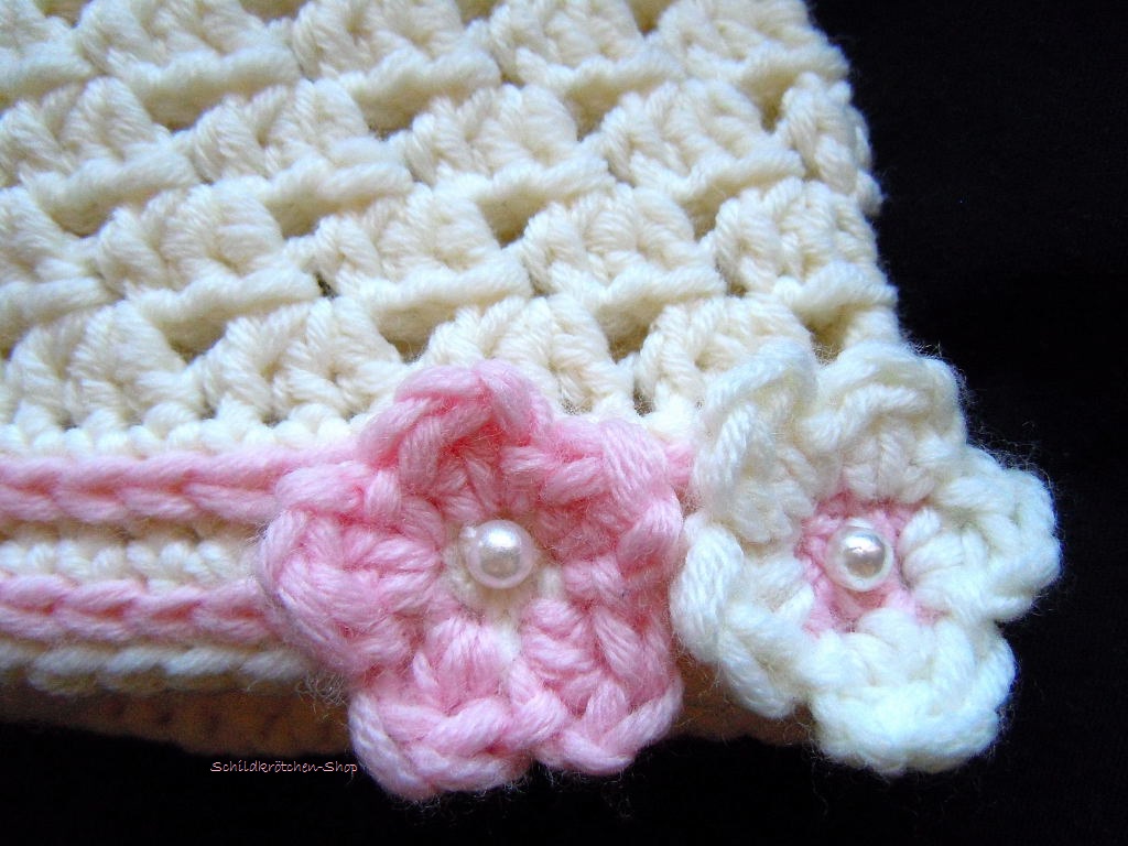 Die superweiche Taufmütze besticht durch das hübsche Muschelmuster und die zuckersüßen Deko-Blümchen.