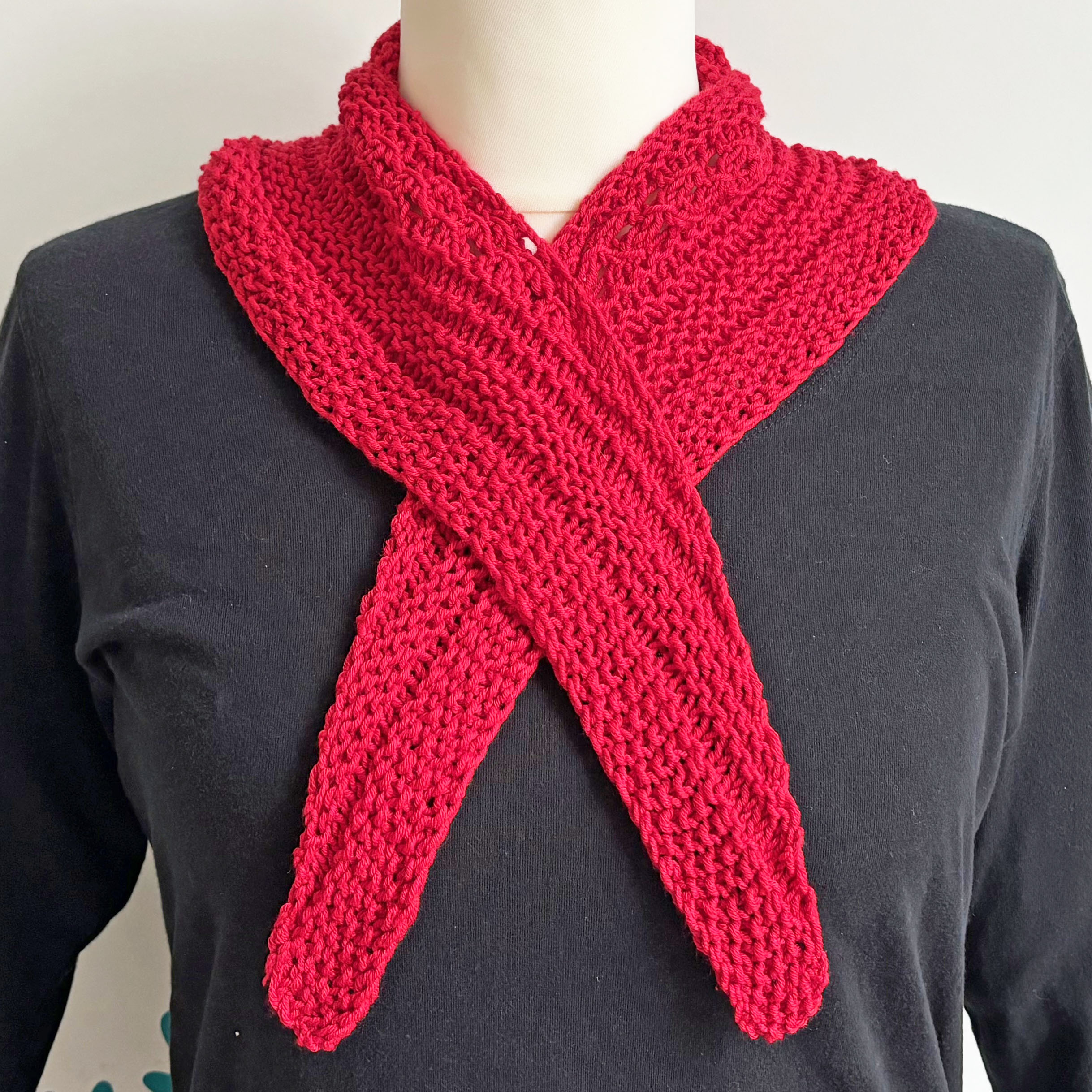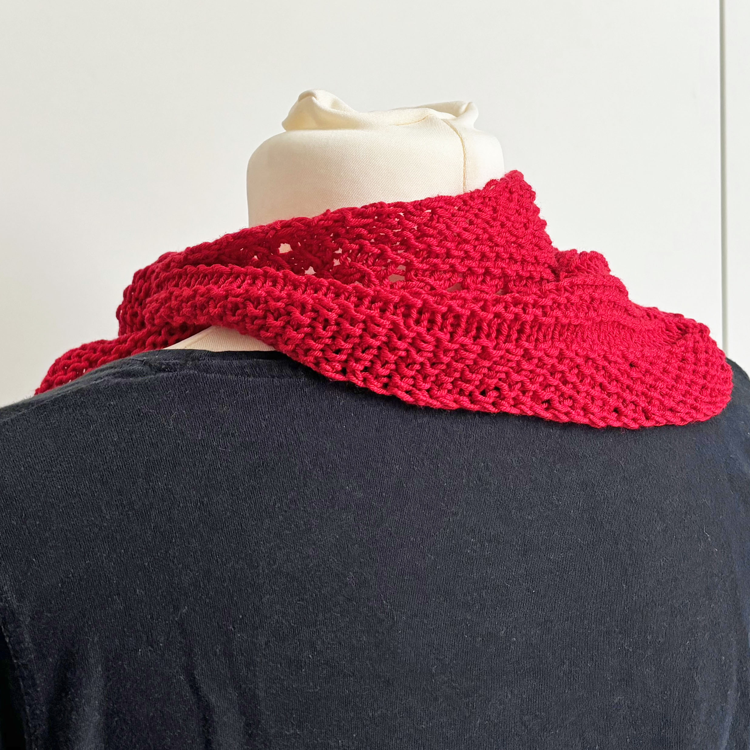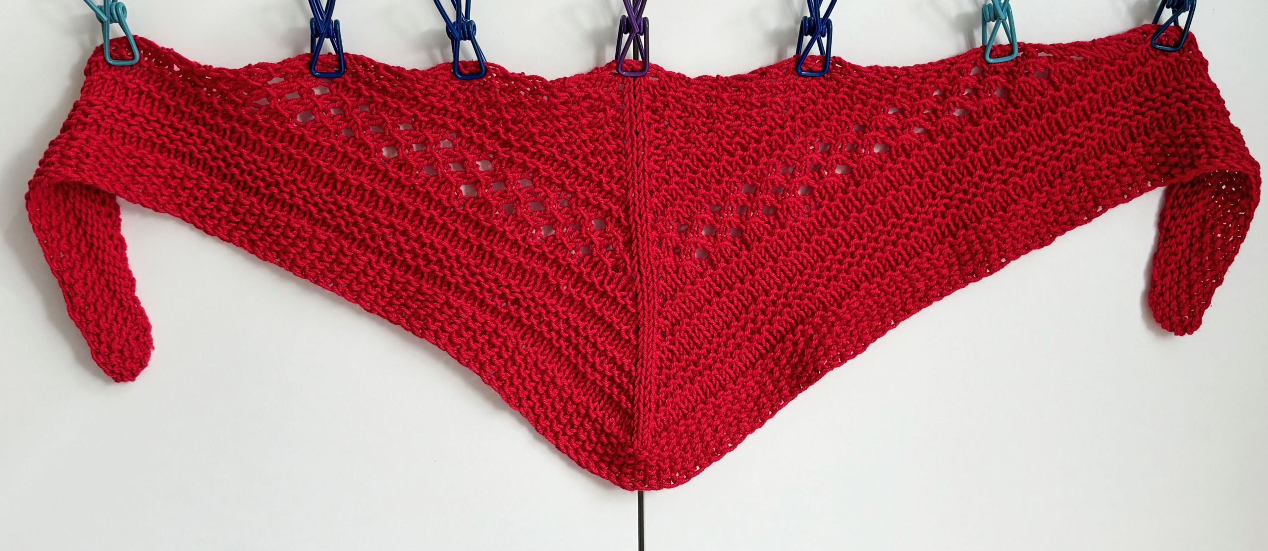 Leichtes weiches Dreieckstuch fürs ganze Jahr aus rotem mitteldicken Garn in Mustermix gestrickt.