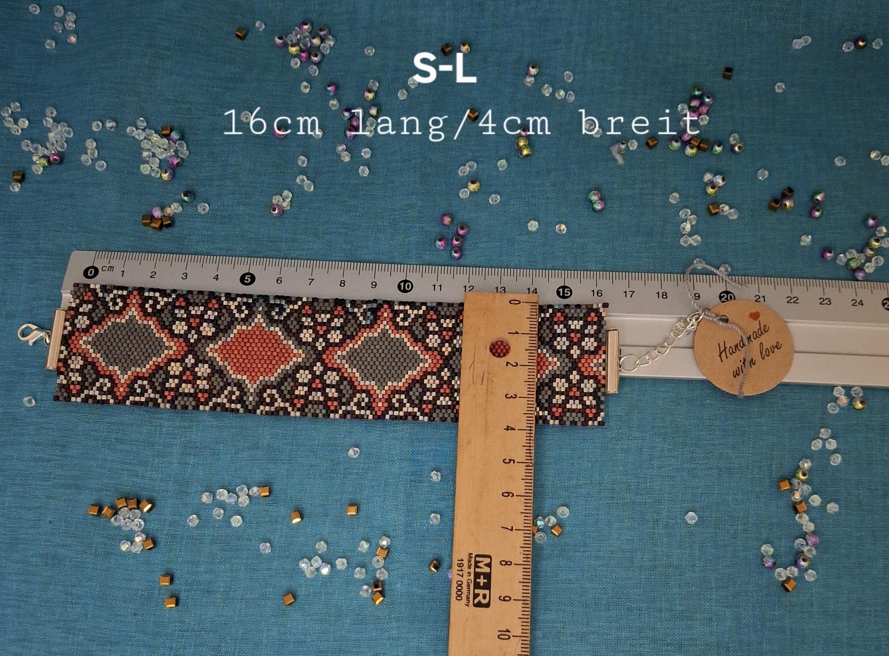 Dieses Armband besteht aus hochwertigen japanischen Miyuki-Delica-Glasperlen. Diese Perlen sind für ihre Regelmäßigkeit und unvergleichliche Brillanz bekannt und bieten ein perfektes Finish und ein zartes Aussehen. Mithilfe der Peyote-Nadelspitzenwebtechnik wird jede Perle sorgfältig zusammengesetzt, um eine weiche Textur und eine ideale Passform am Handgelenk zu gewährleisten.
