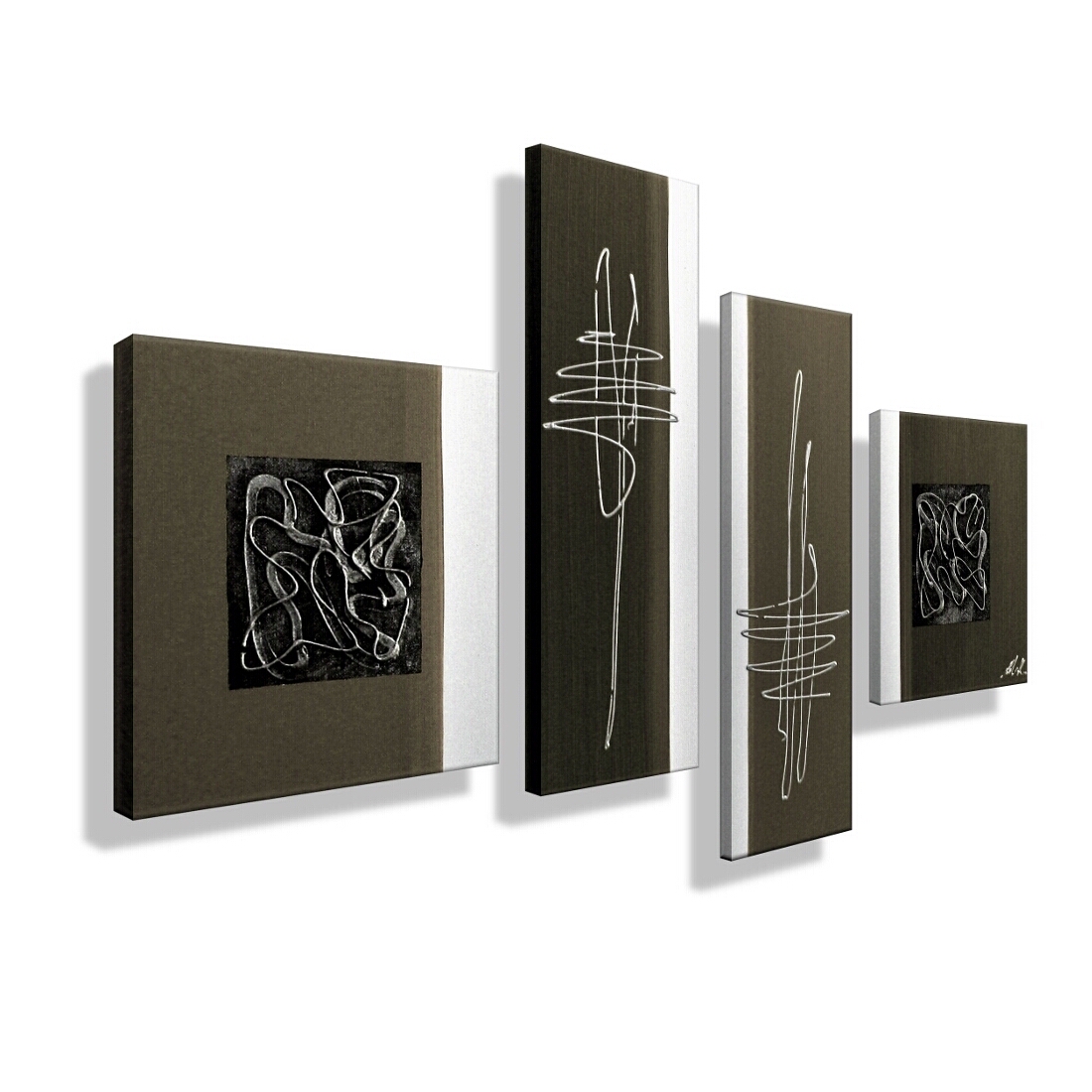 Titanweiß, Umbra gebrannt, Mittelbraun. Metallic-Silber (echte Metallpigmente) auf Anthrazit. |