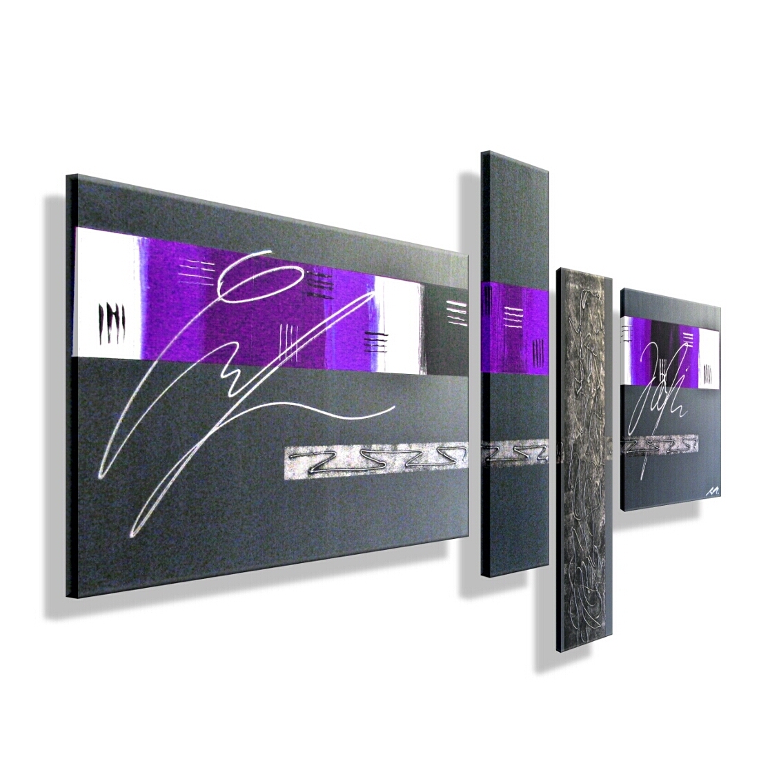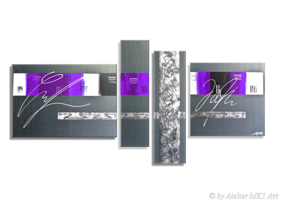 Titanweiß, Grau, Flieder, Lila. Metallic-Silber (echte Metallpigmente) auf Anthrazit. |