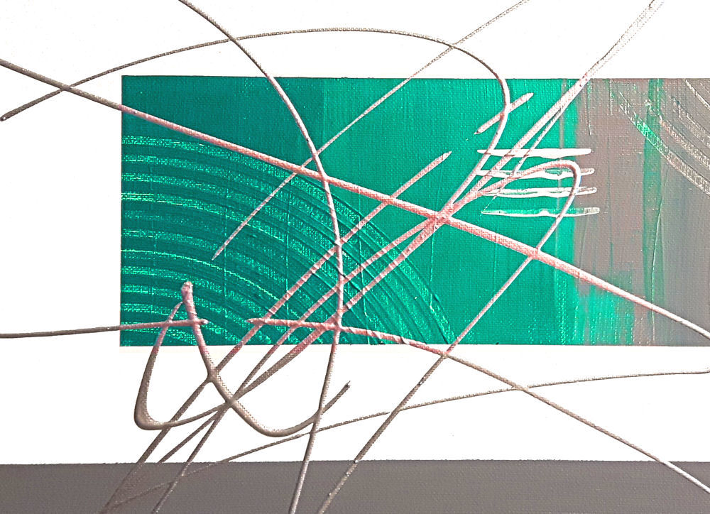 Titanweiß, Grau, Petrol Metallic-Silber (echte Metallpigmente) auf Anthrazit. |