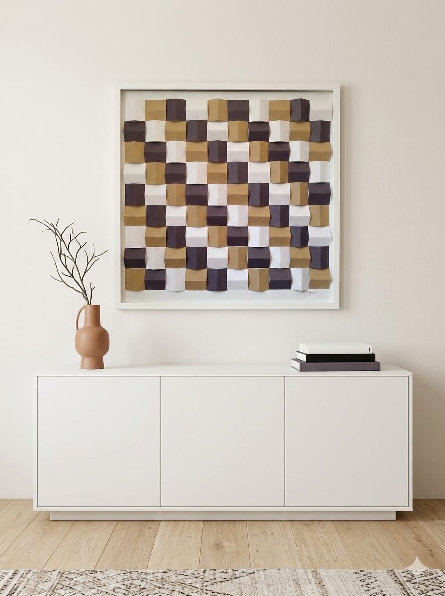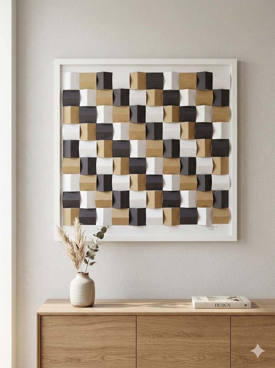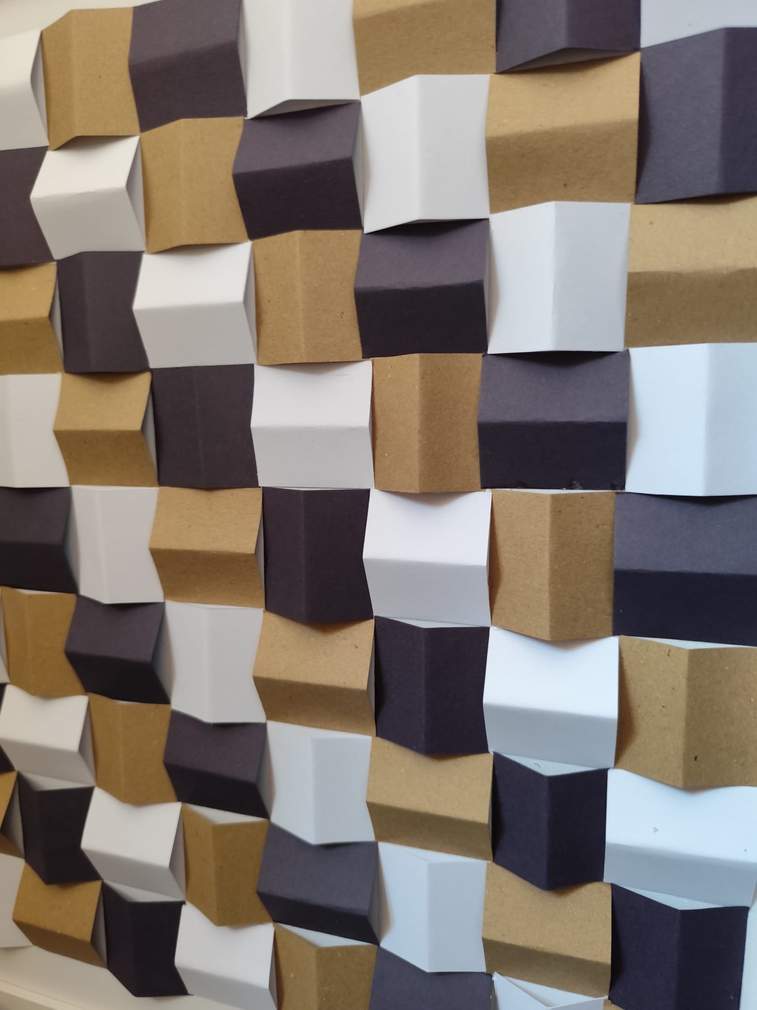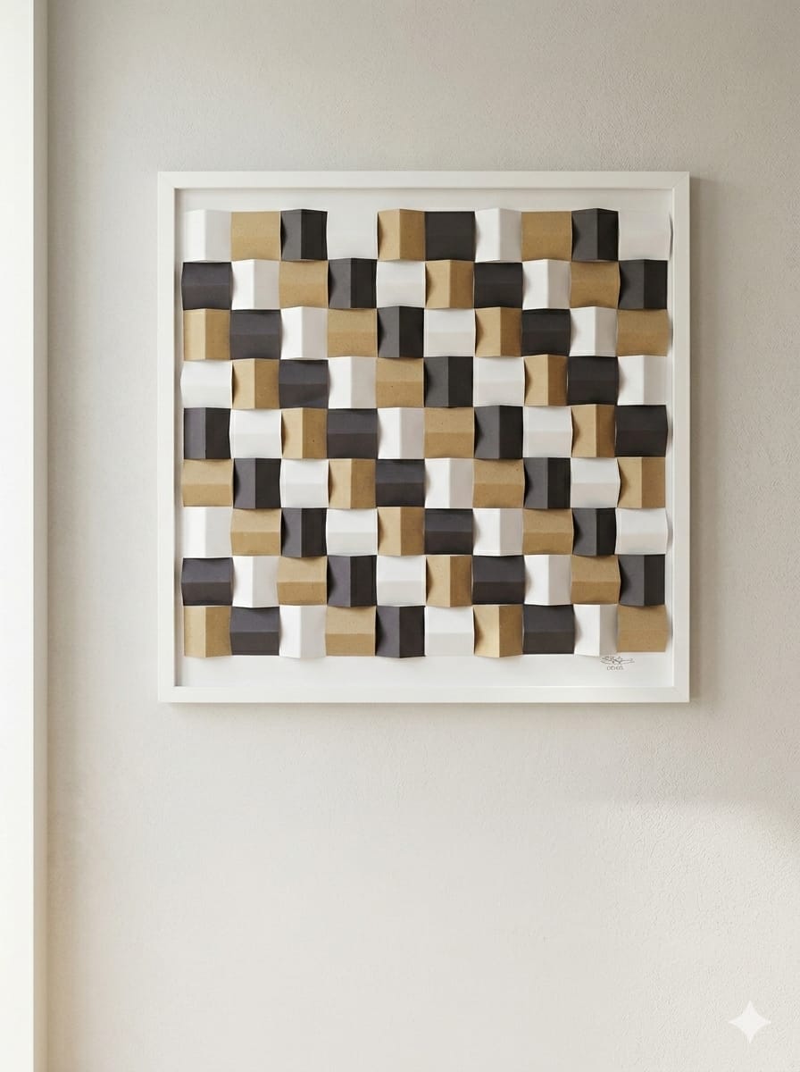 Das Bild besteht aus sorgfältig gefaltetem Papier und erzeugt durch die dreidimensionale Struktur ein faszinierendes Spiel aus Licht und Schatten.