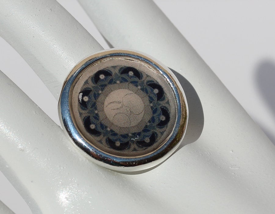 Der Ring ist aus glänzend silberfarbenem Metall, Motiv unter Resinguss. Der Durchmesser des Rahmen beträgt etwa 25 mm, und der Ring ist größenverstellbar.