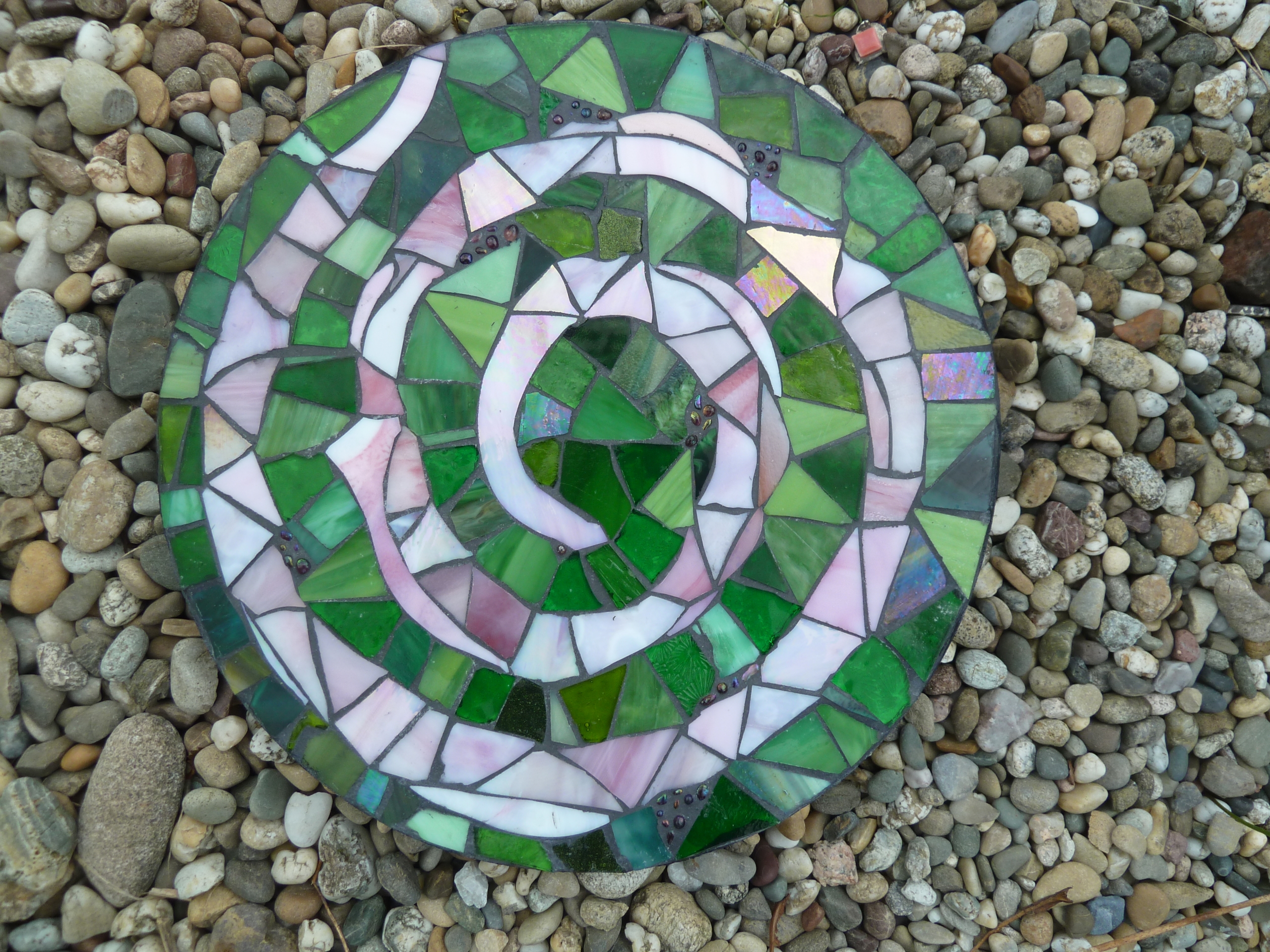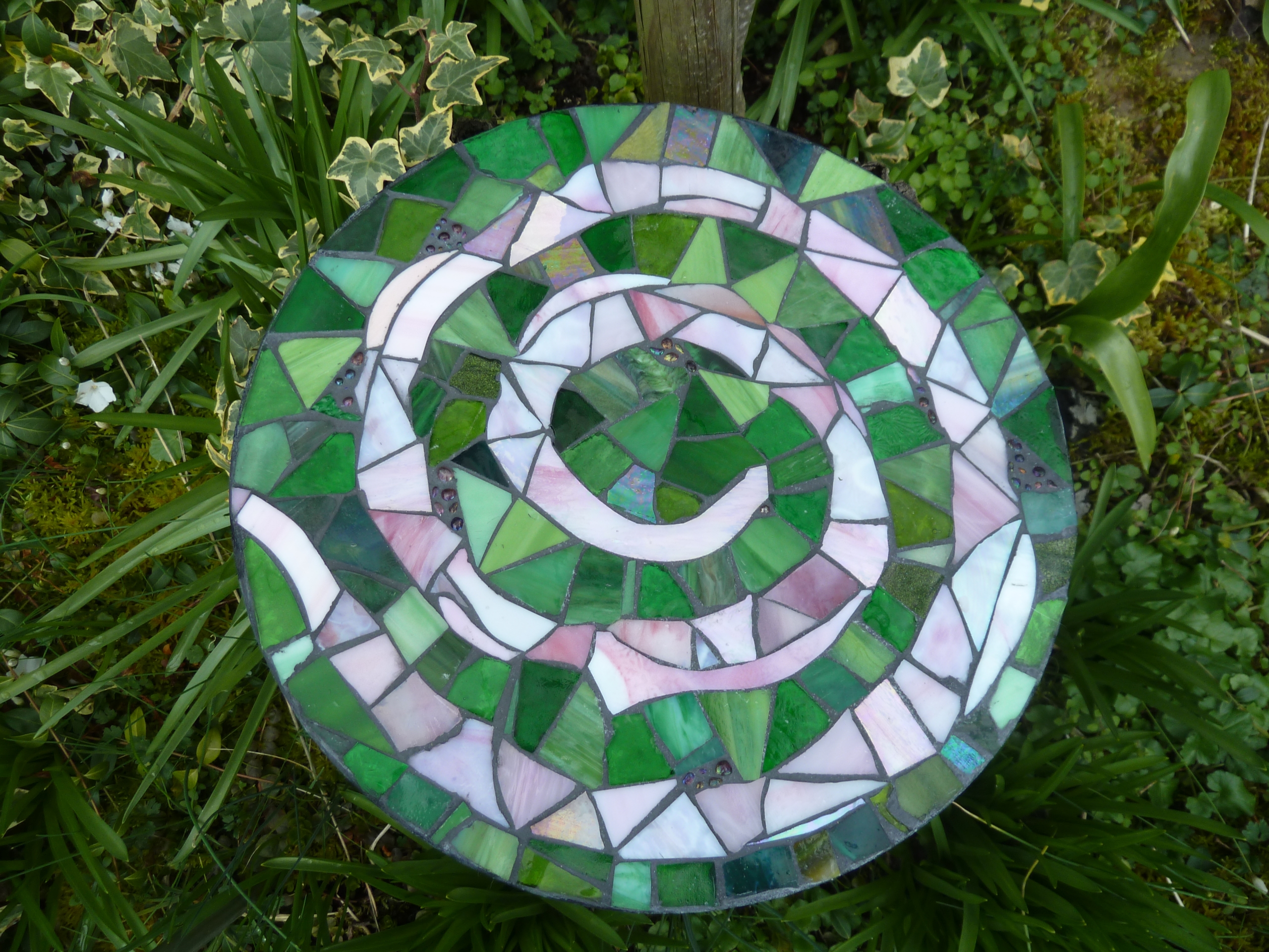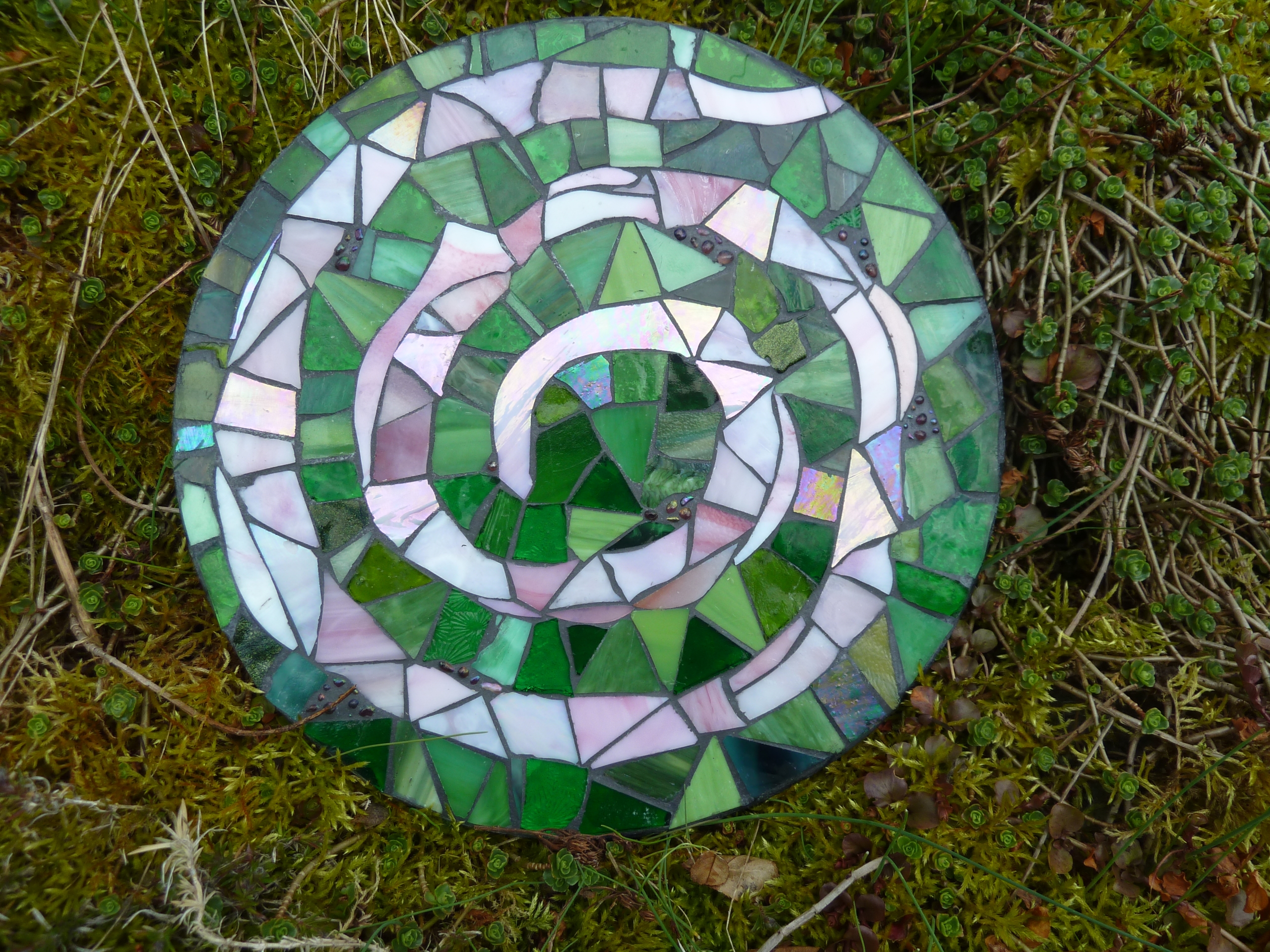 Diese runde Mosaikplatte mit einer rosa Spirale ist ein hübscher Hingucker und findet Platz in jedem Garten, als Schmuckstein, Gedenkstein oder dekorativer Trittstein oder an einen Baum gelehnt als hübscher Blickfang.
