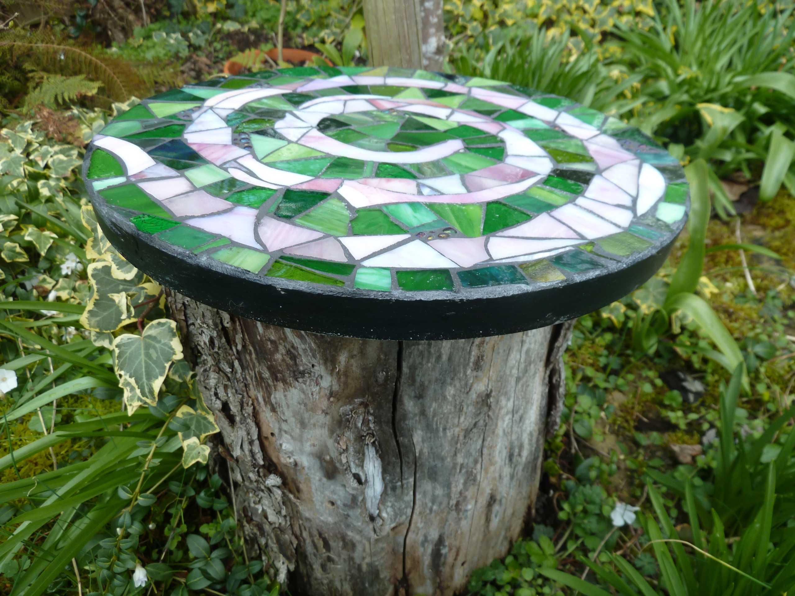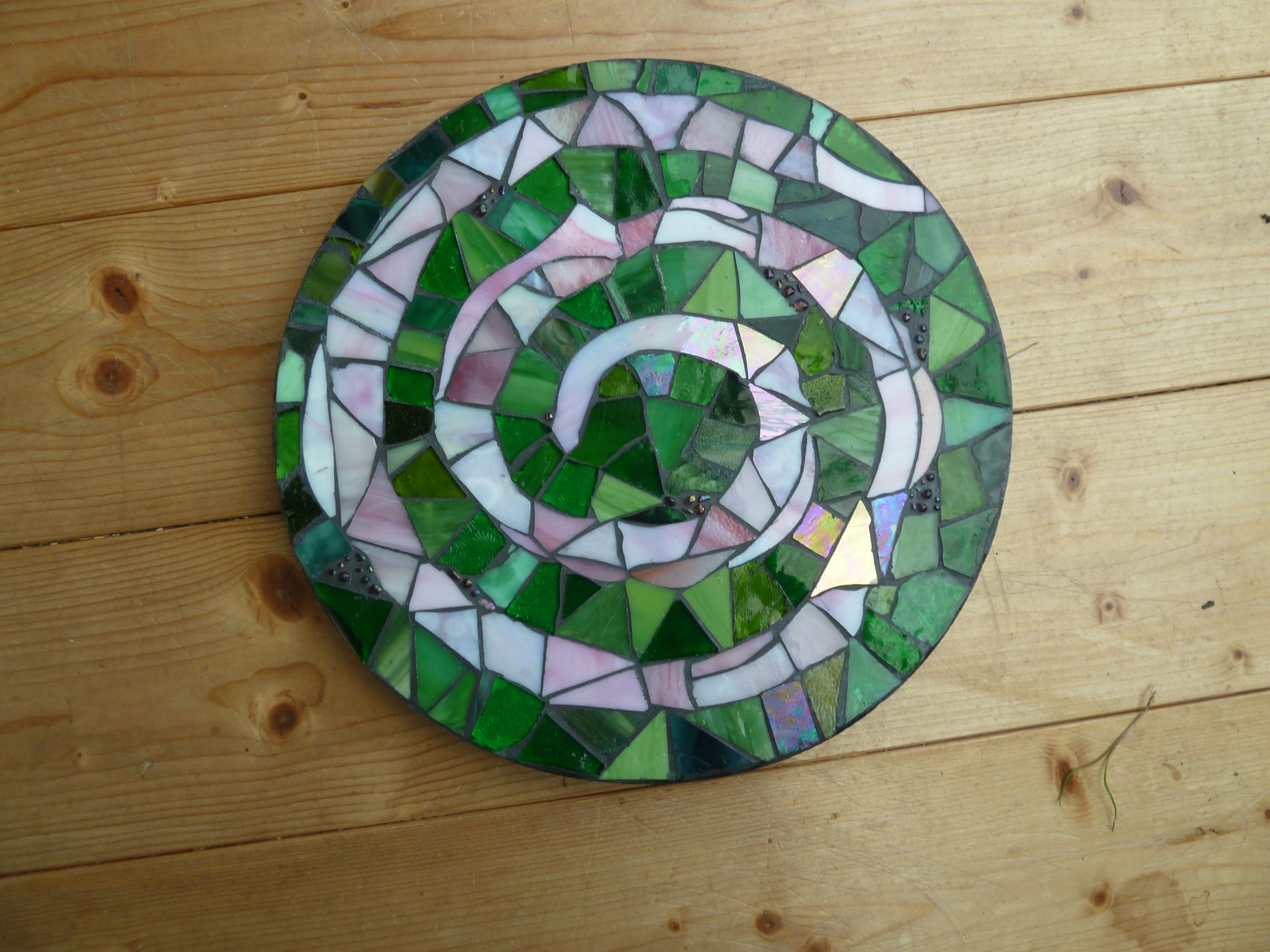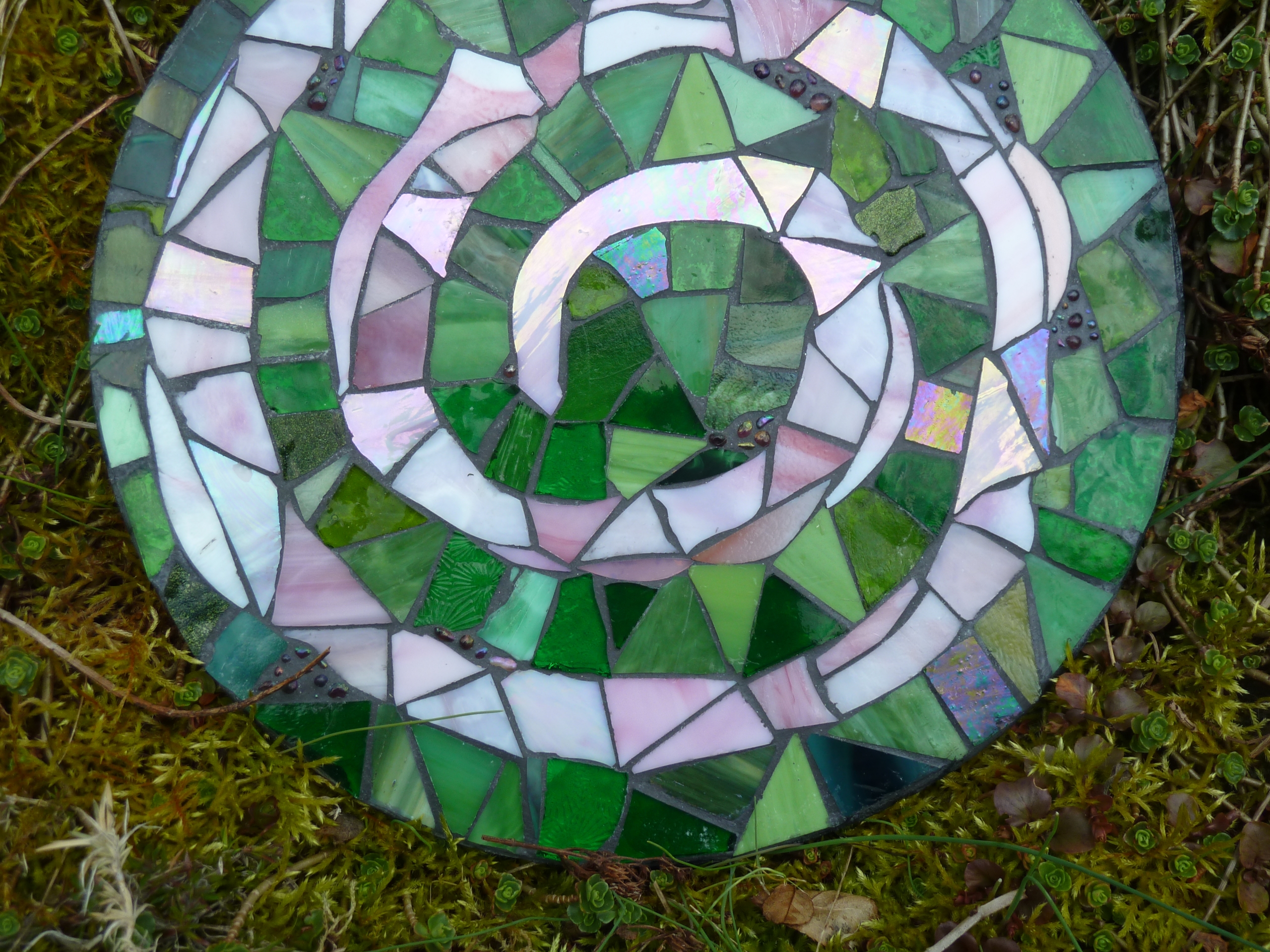 Diese runde Mosaikplatte mit einer rosa Spirale ist ein hübscher Hingucker und findet Platz in jedem Garten, als Schmuckstein, Gedenkstein oder dekorativer Trittstein oder an einen Baum gelehnt als hübscher Blickfang.