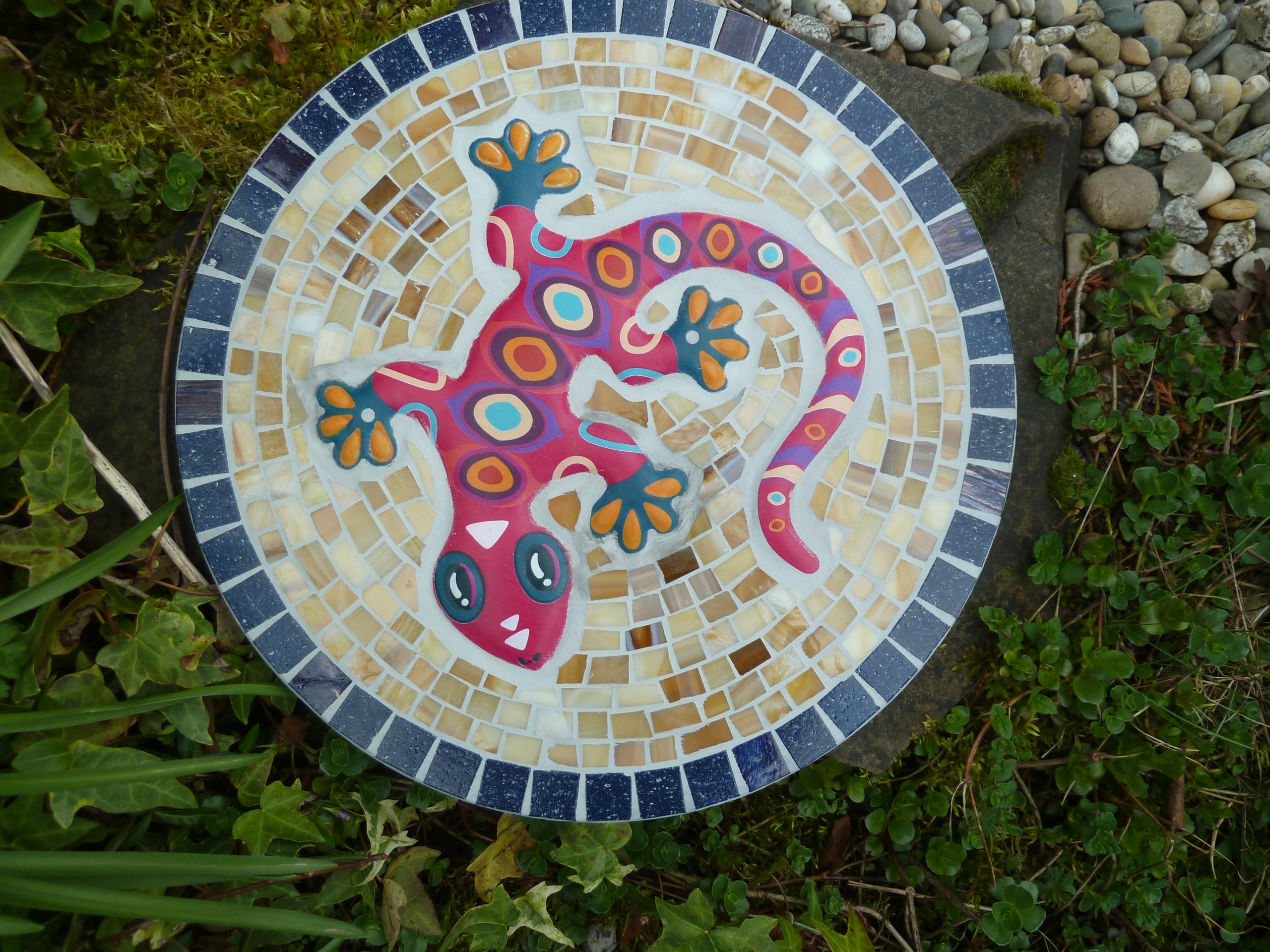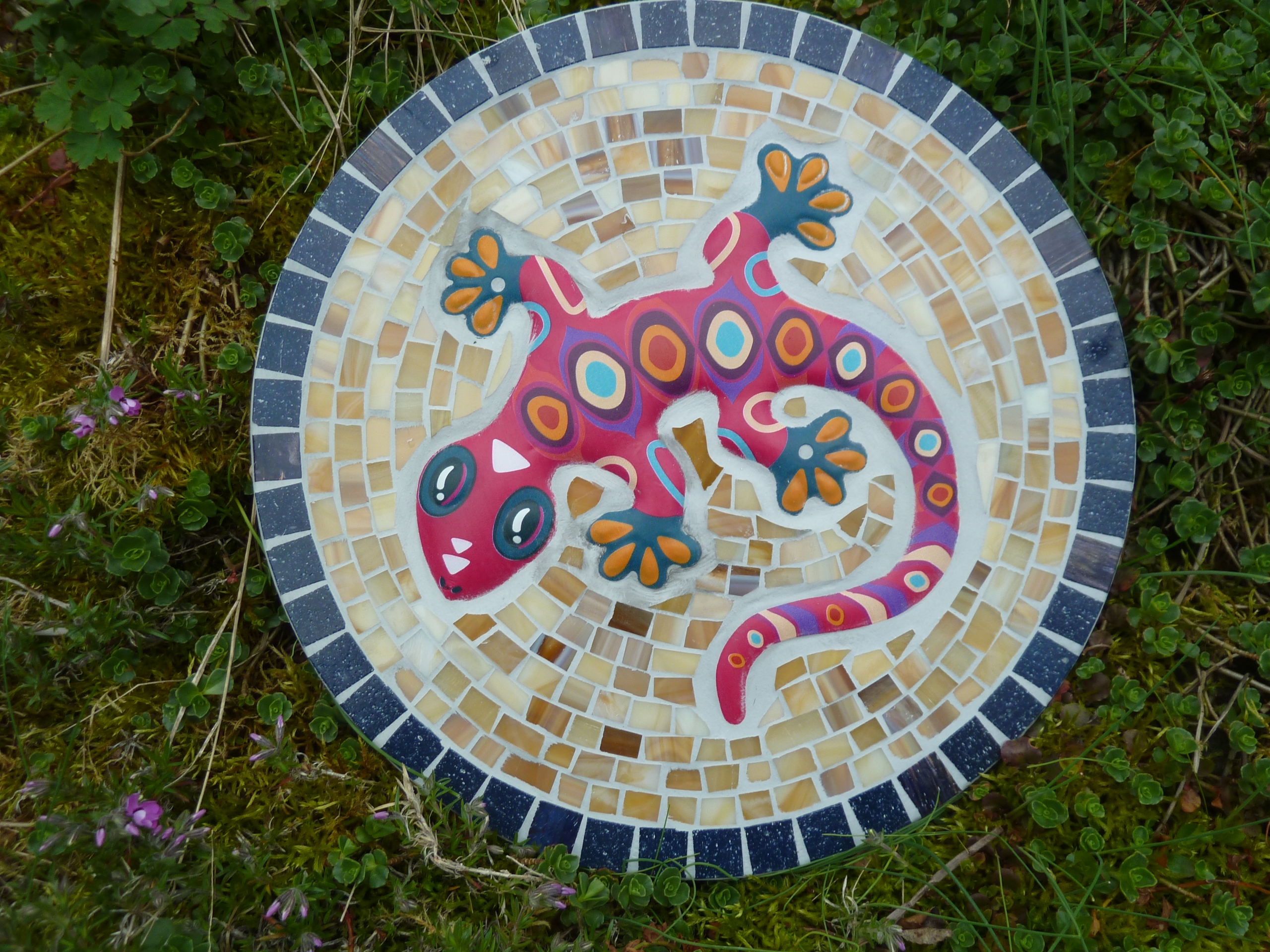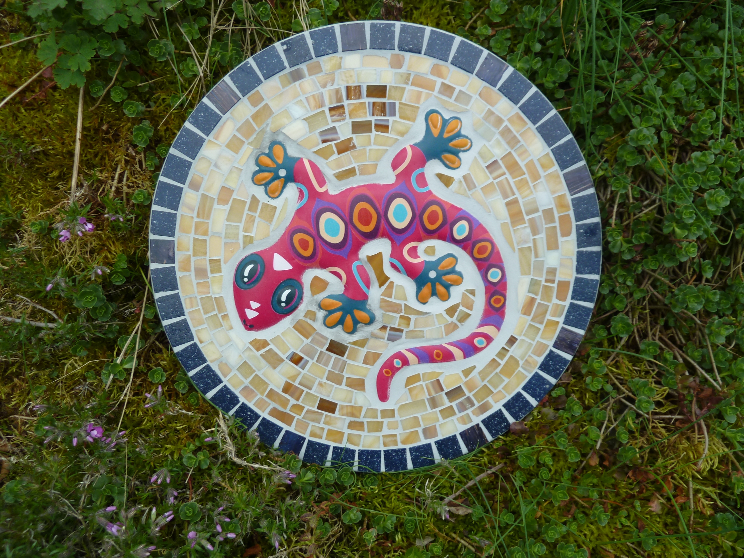 Diese runde Mosaikplatte mit einem bunten Gecko aus Metall ist ein hübscher Hingucker und findet Platz in jedem Garten, als Schmuckstein oder dekorativer Trittstein (mit leichter Erhebung) oder an einen Baum gelehnt als hübscher Blickfang.