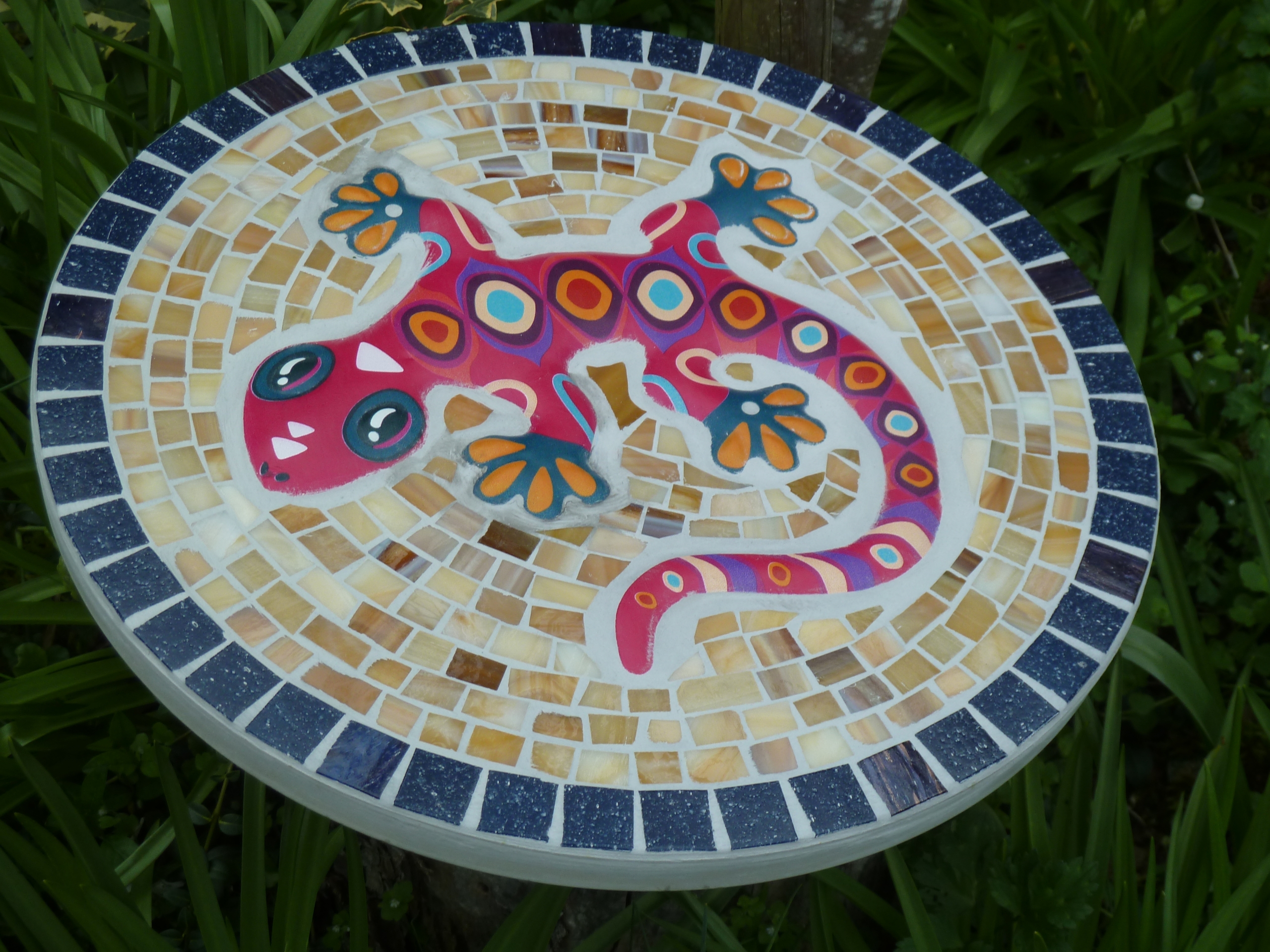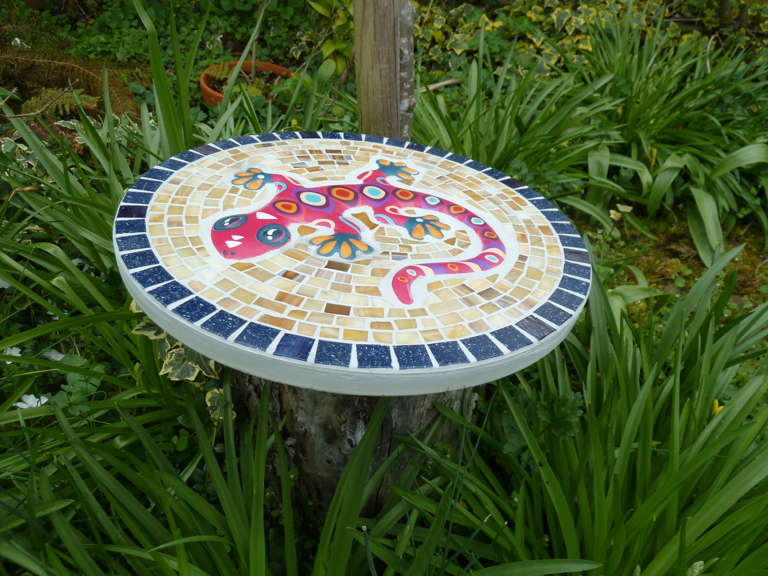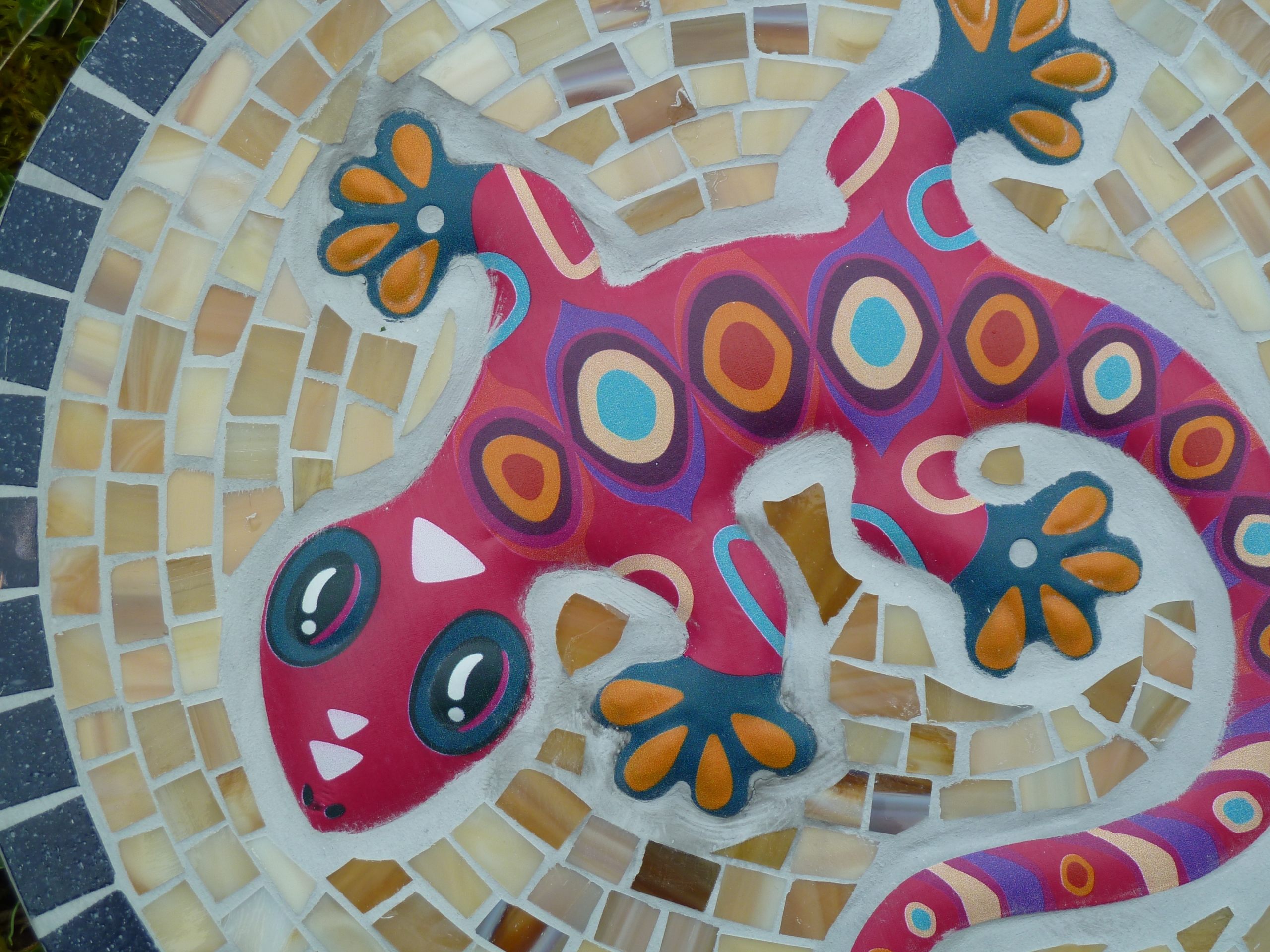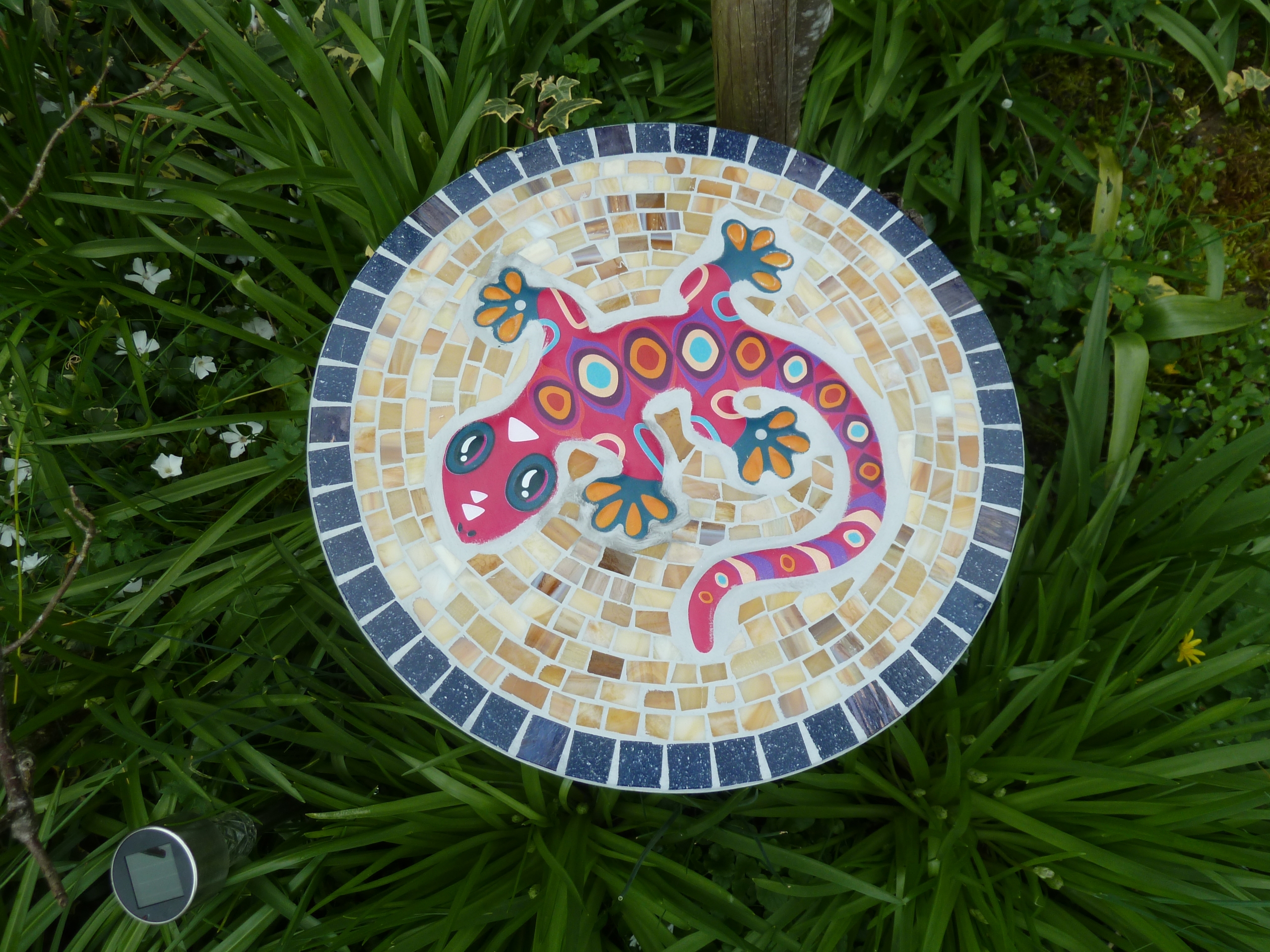 Diese runde Mosaikplatte mit einem bunten Gecko aus Metall ist ein hübscher Hingucker und findet Platz in jedem Garten, als Schmuckstein oder dekorativer Trittstein (mit leichter Erhebung) oder an einen Baum gelehnt als hübscher Blickfang.