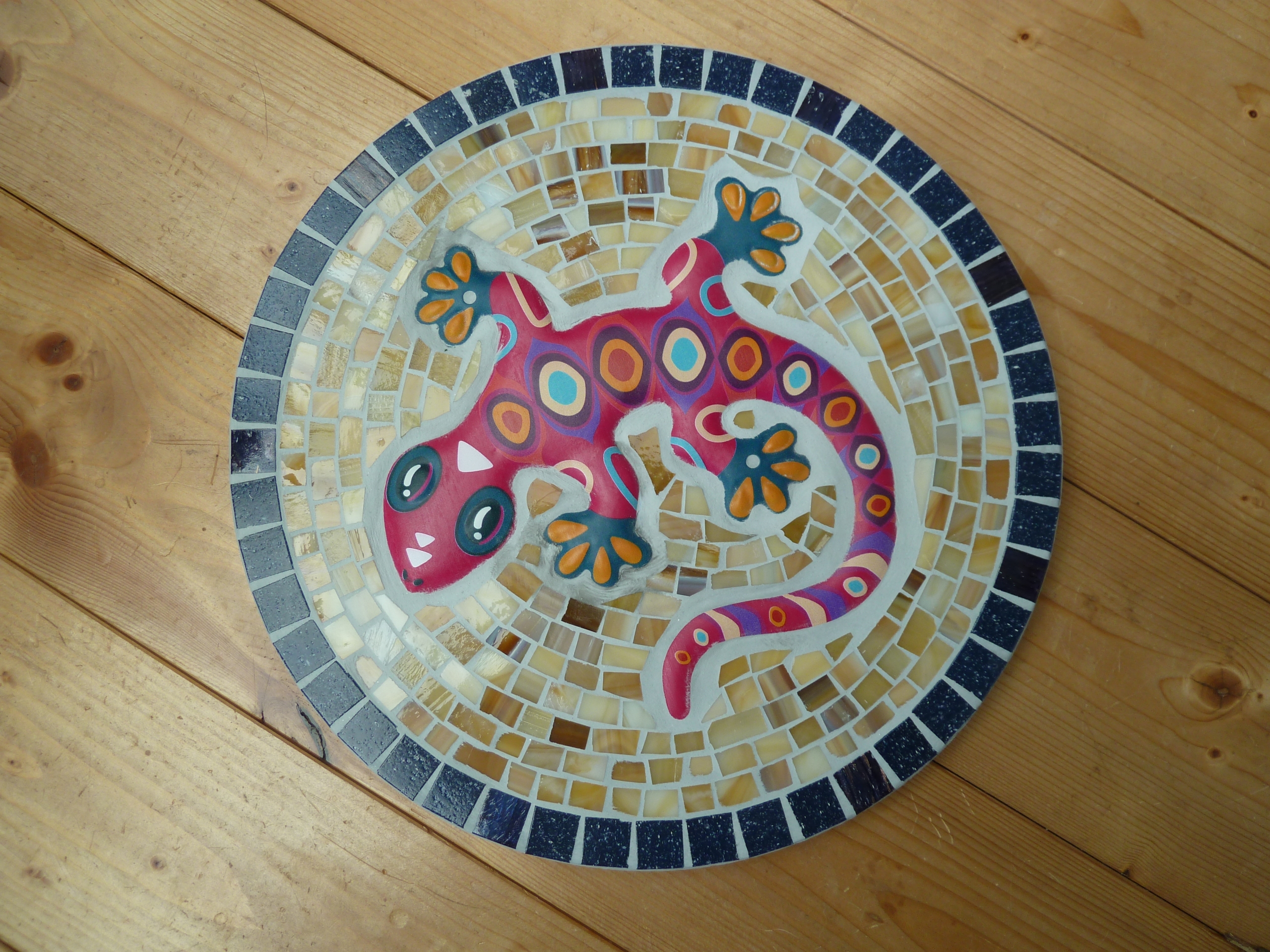 Der runde Stein hat einen Durchmesser von 35cm und eine Höhe von 2 cm. Ein echter Hingucker ist der bunte Metallgecko, der von farblich passenden Mosaiksteinen und Glasscherben eingerahmt ist. Die Platte besteht aus Beton, Fugen und Mosaiksteine sind auch für den Außenbereich geeignet. Das Mosaik wurde mit einer lösungsmittelfreien Lasur behandelt und ist somit auch wetterfest.