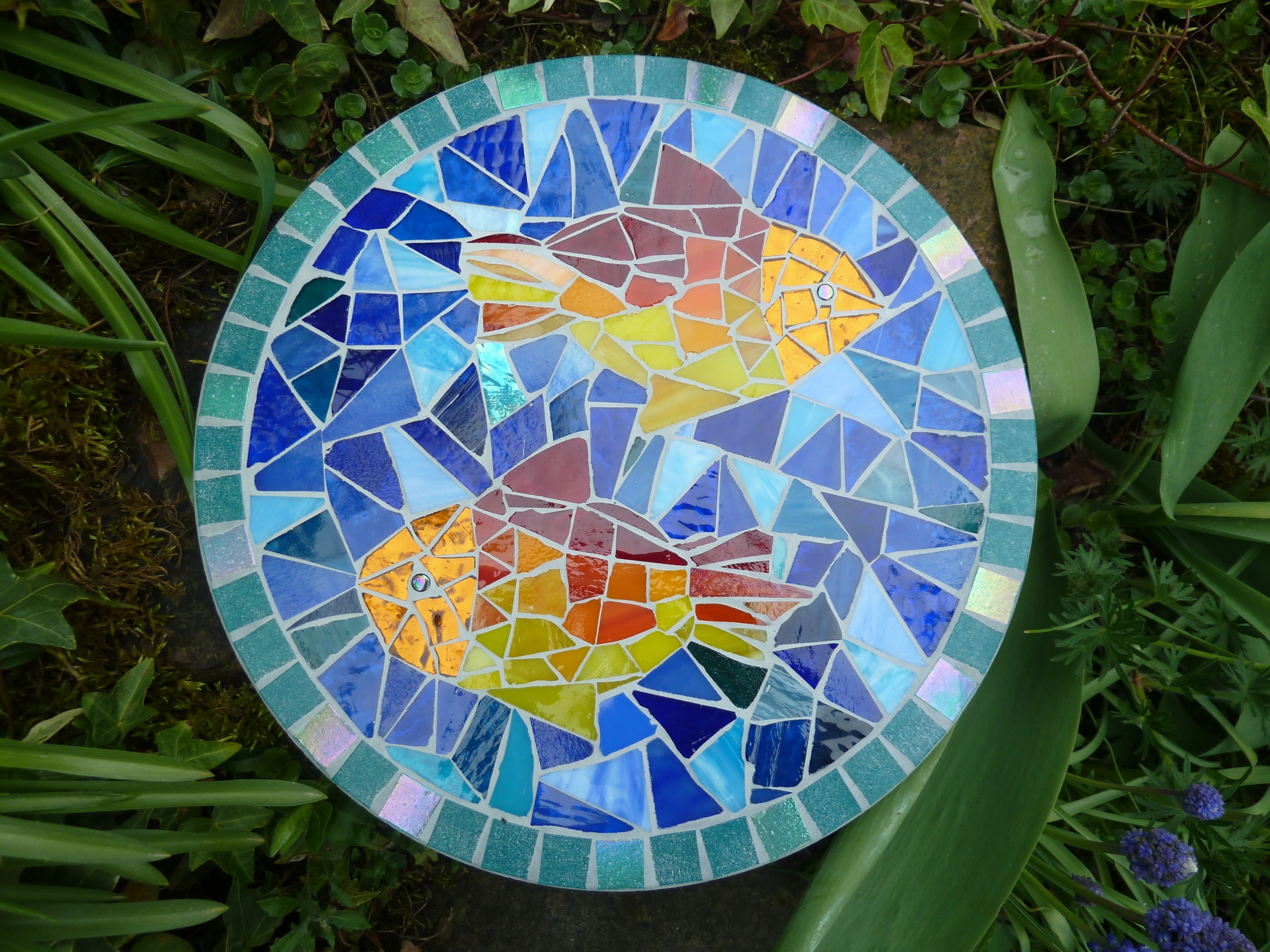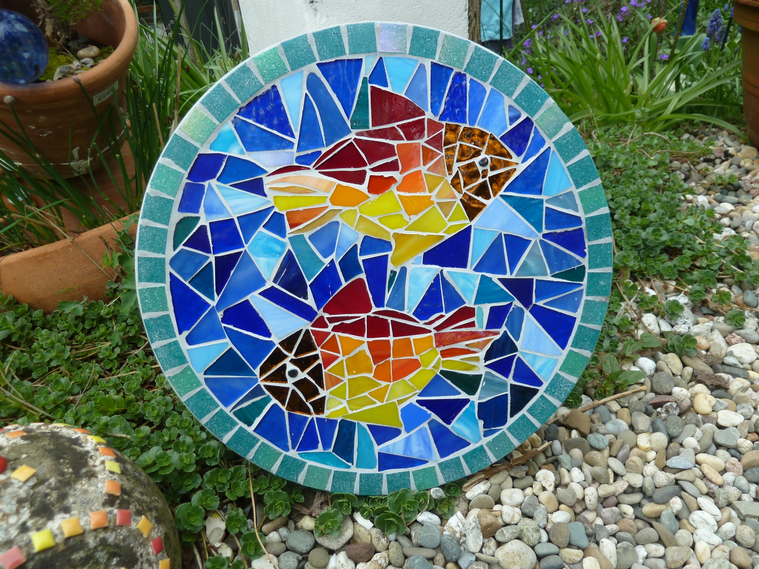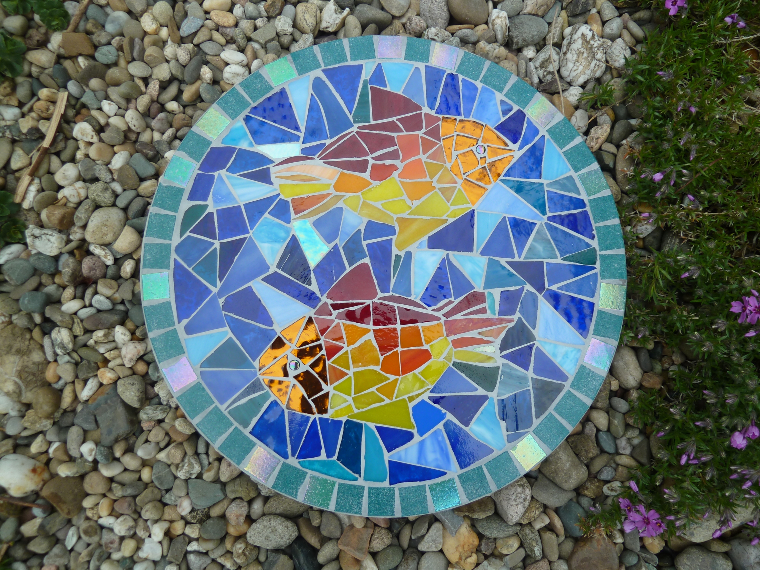 Diese runde Mosaikplatte mit zwei bunten Fischen aus Tiffanyglas- und Spiegelscherben(Kopf) ist ein hübscher Hingucker und findet Platz in jedem Garten, als Schmuckstein oder dekorativer Trittstein oder an einen Baum gelehnt als hübscher Blickfang.
