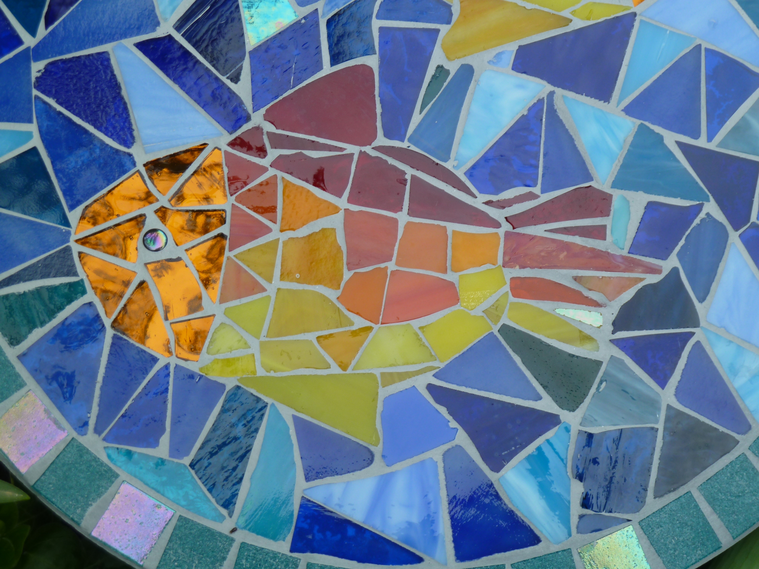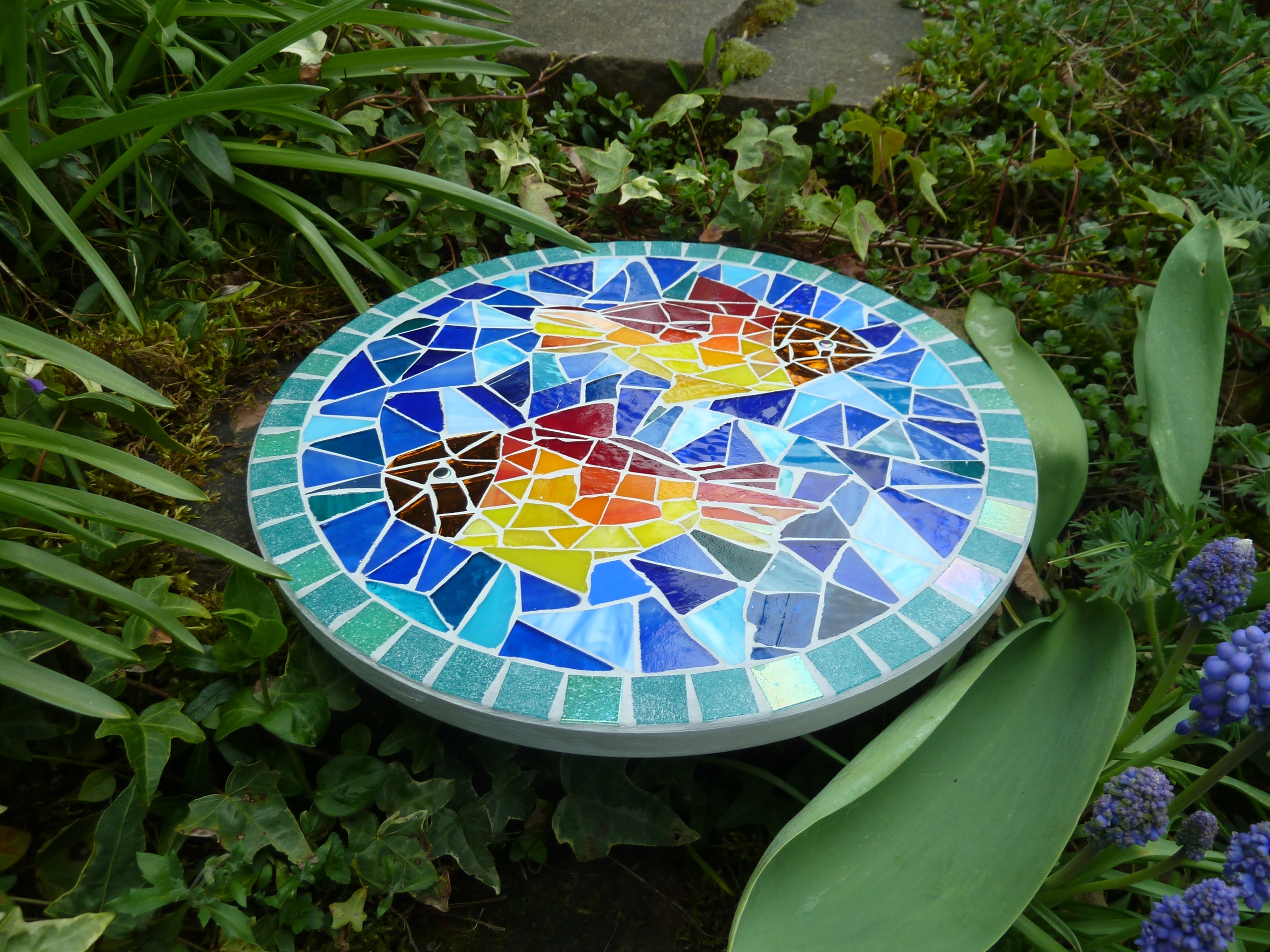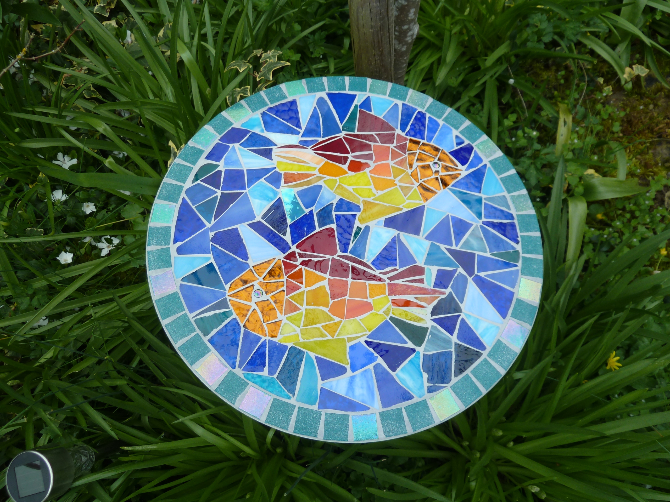 Diese runde Mosaikplatte mit zwei bunten Fischen aus Tiffanyglas- und Spiegelscherben(Kopf) ist ein hübscher Hingucker und findet Platz in jedem Garten, als Schmuckstein oder dekorativer Trittstein oder an einen Baum gelehnt als hübscher Blickfang.