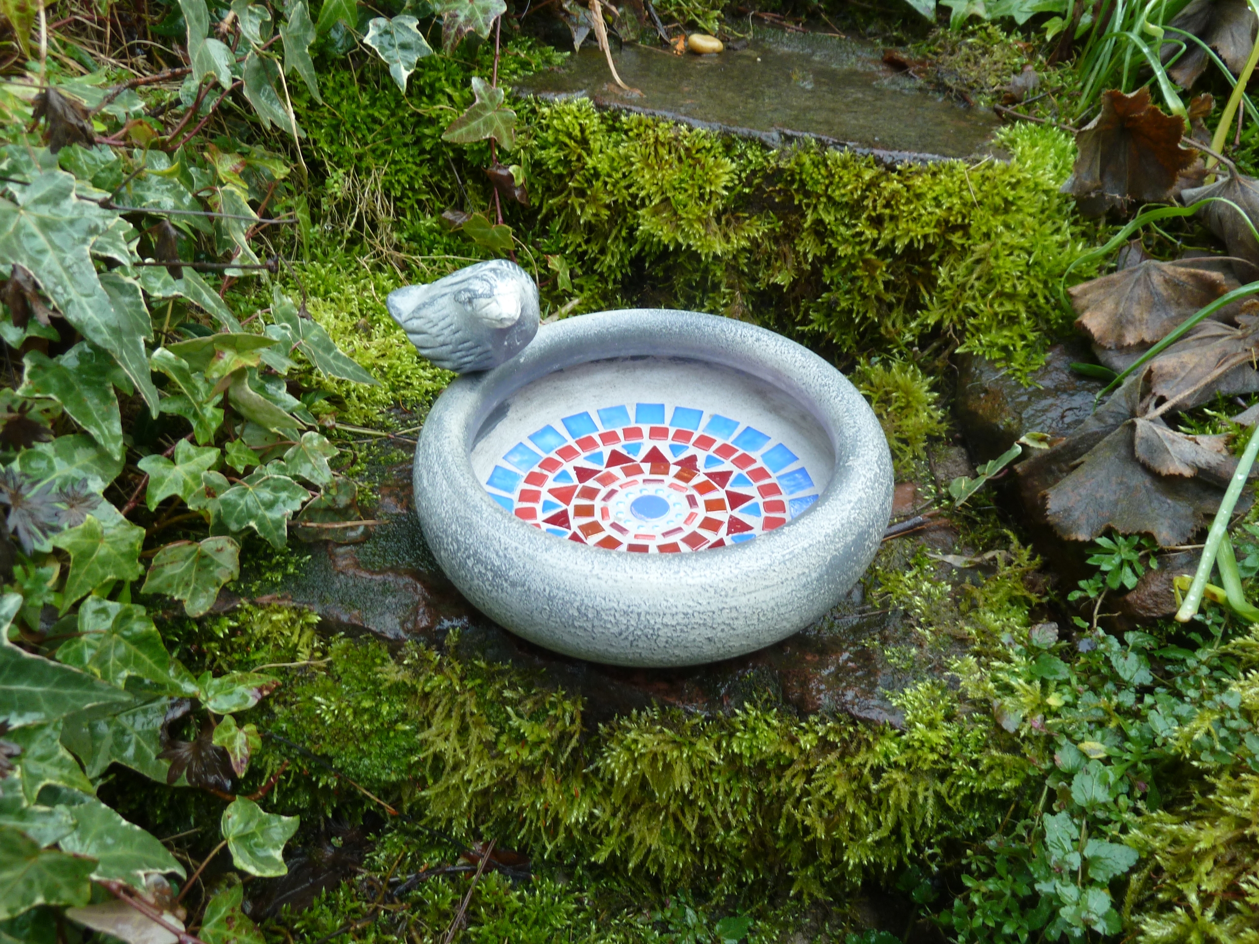 Mosaik Vogeltränke Keramik grün rot gelb