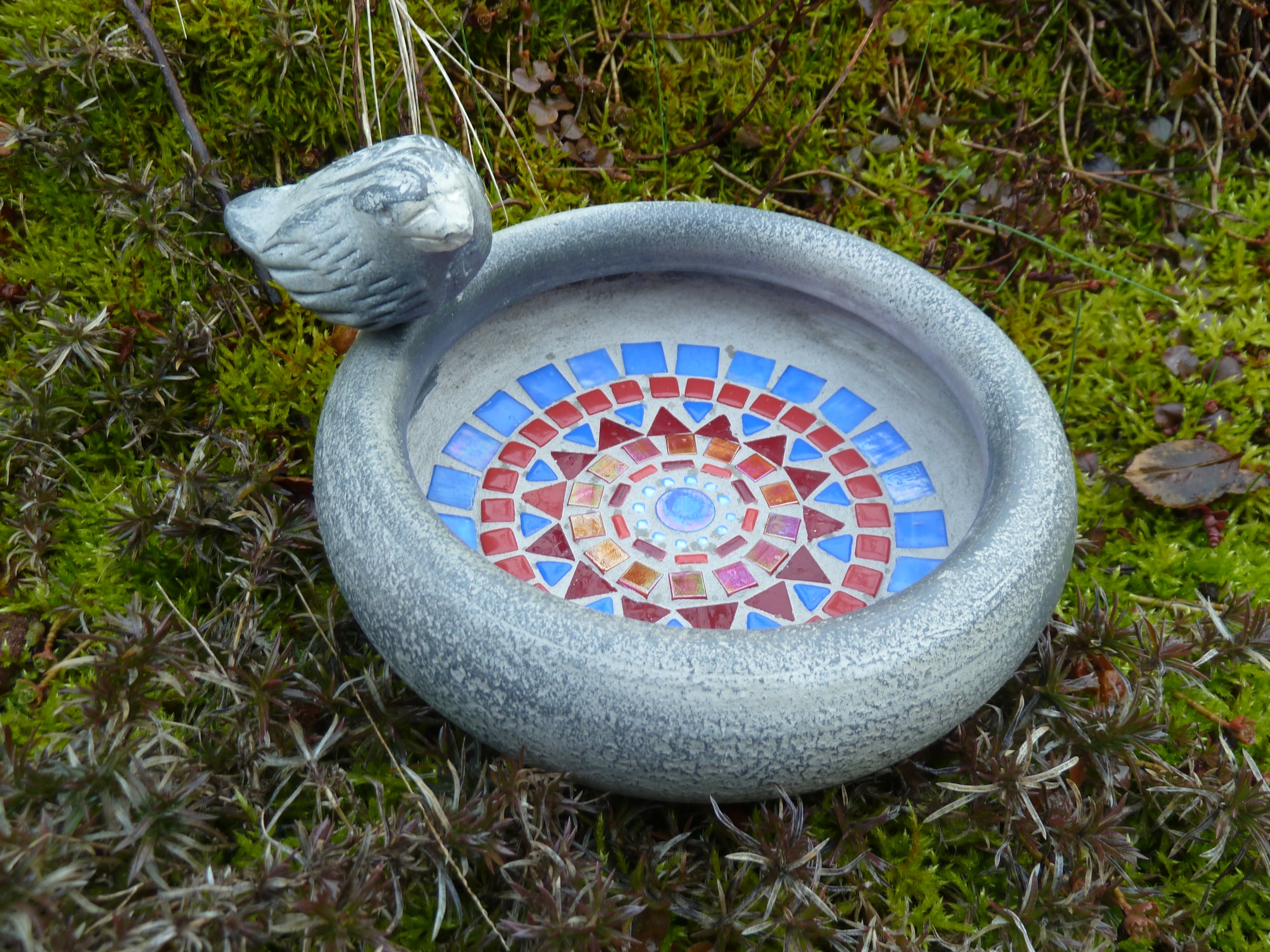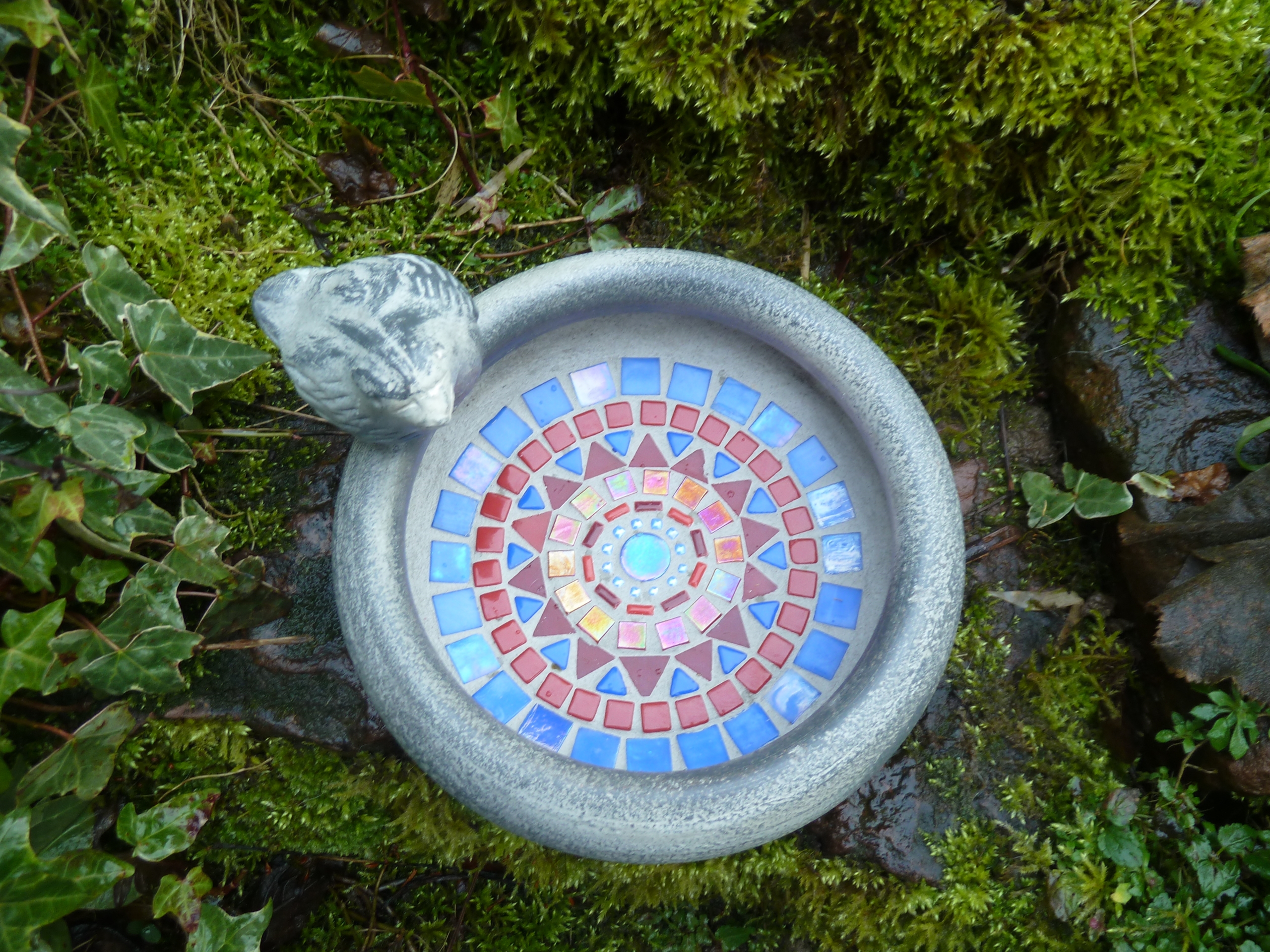 Mosaik Vogeltränke blau grün Keramik