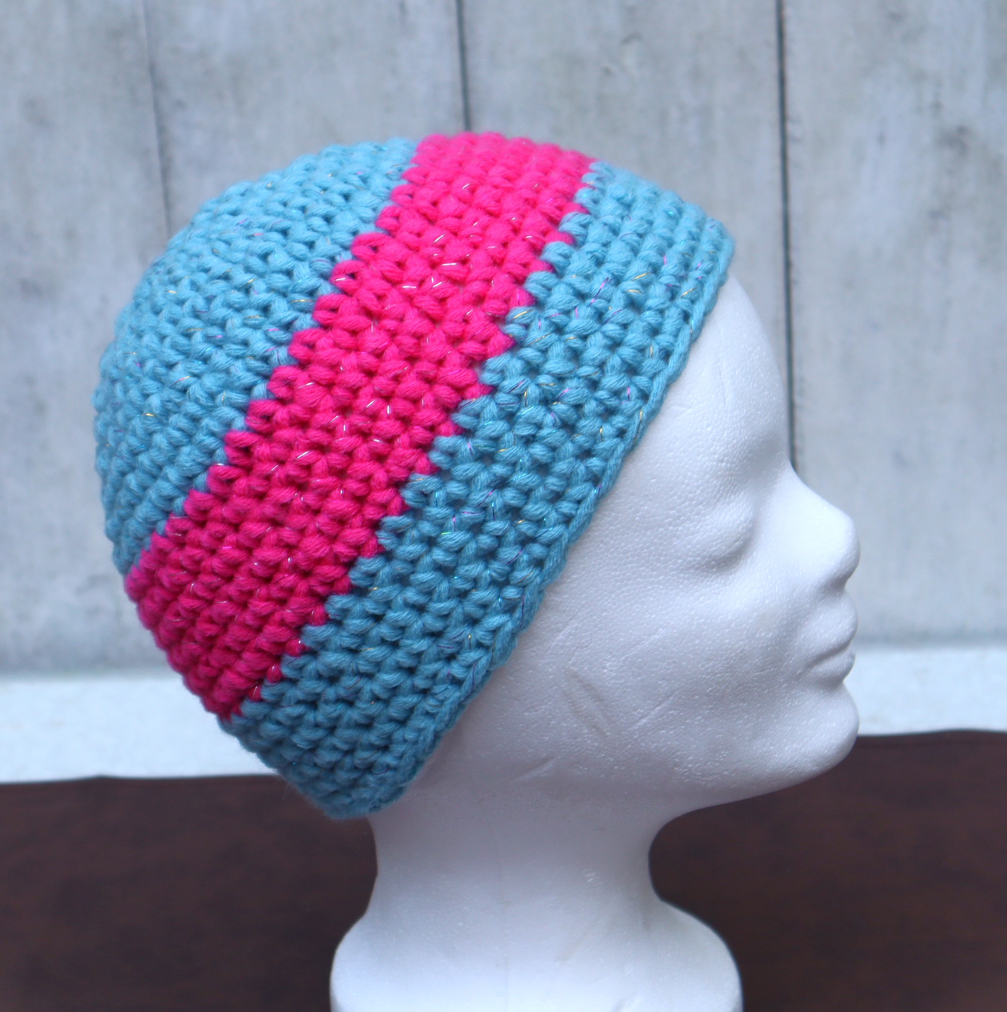 Schicke Häkelmütze aus einem pflegeleichten Mischgarn in türkis und pink mit Glitzerfaden.