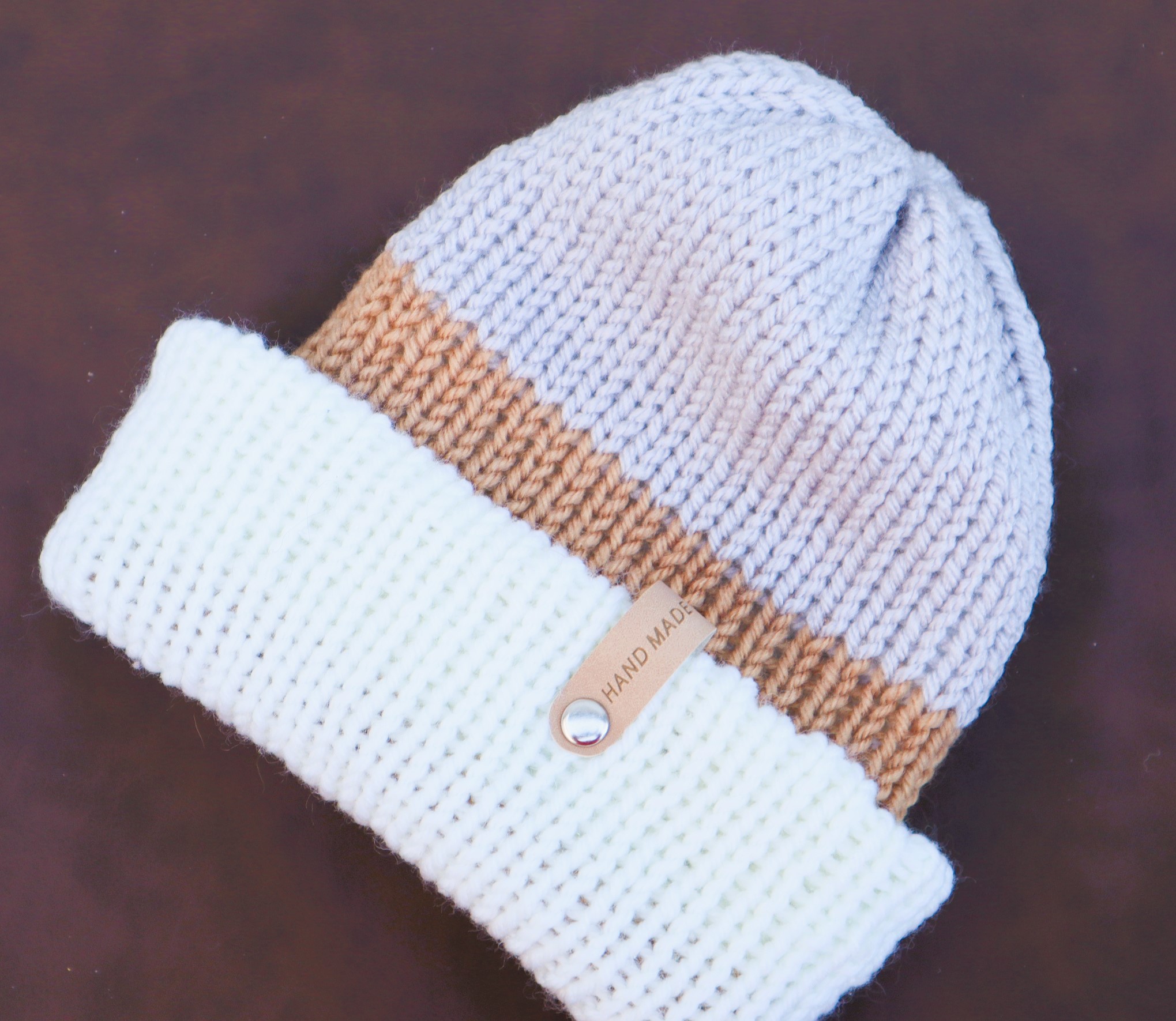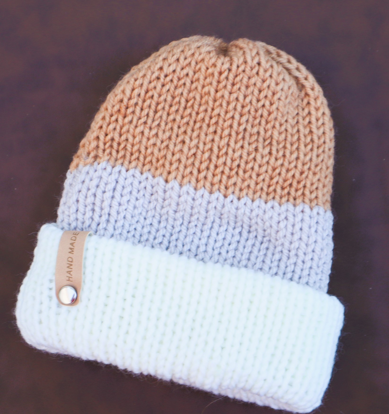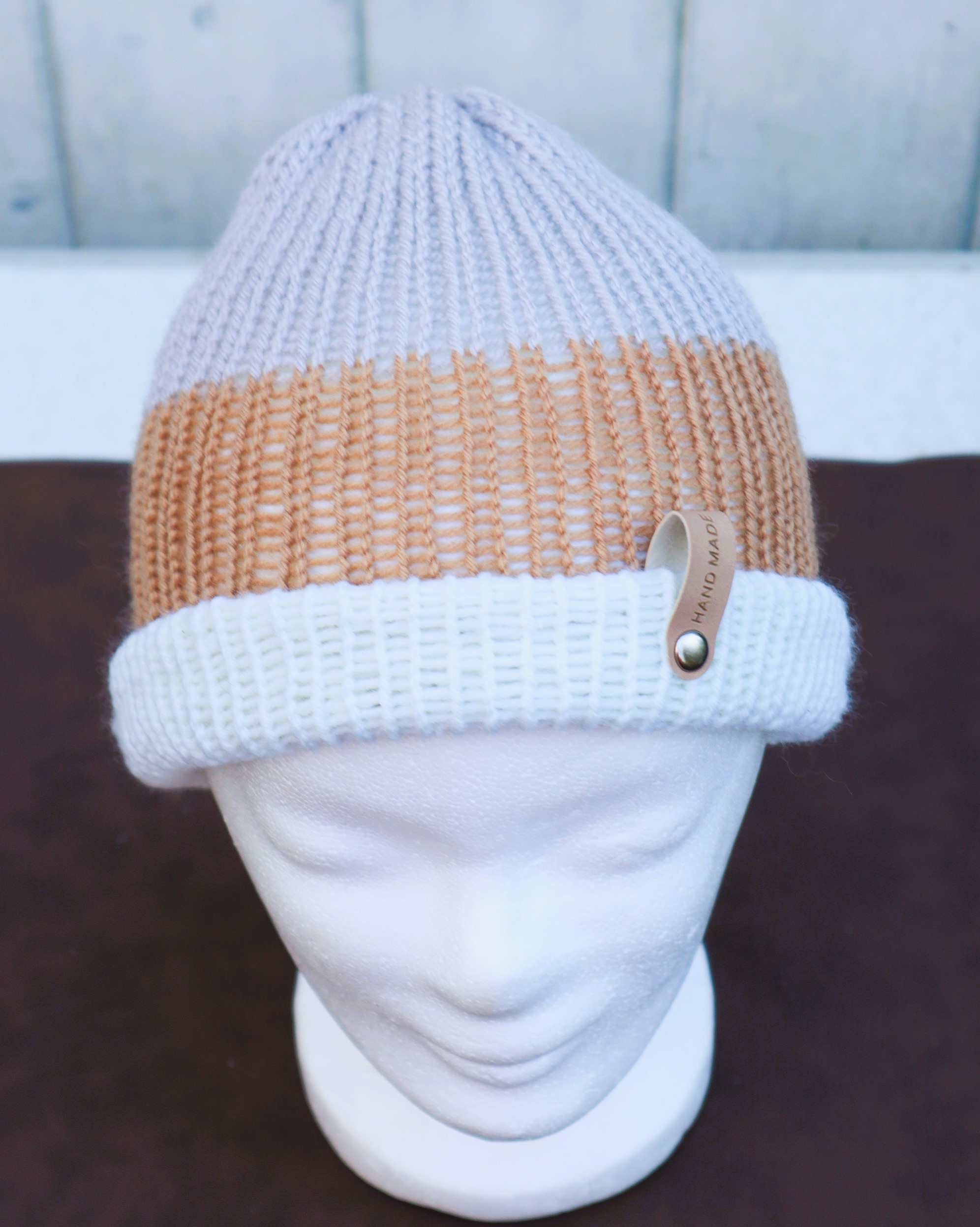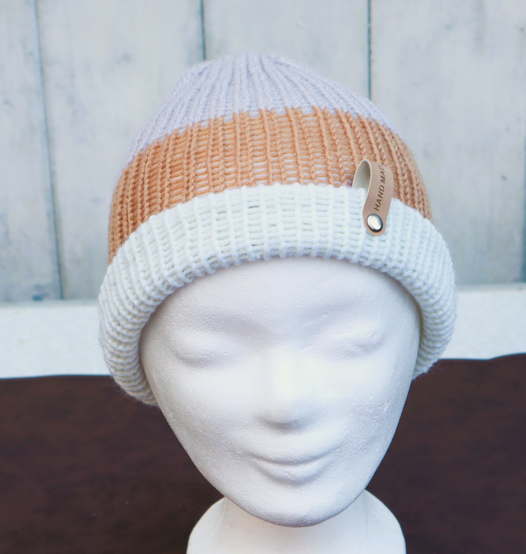 Schicke handgestrickte Mütze in breiten Streifen aus weichem Polyacrylgarn in dezenten Farben, die zu fast allem passen.