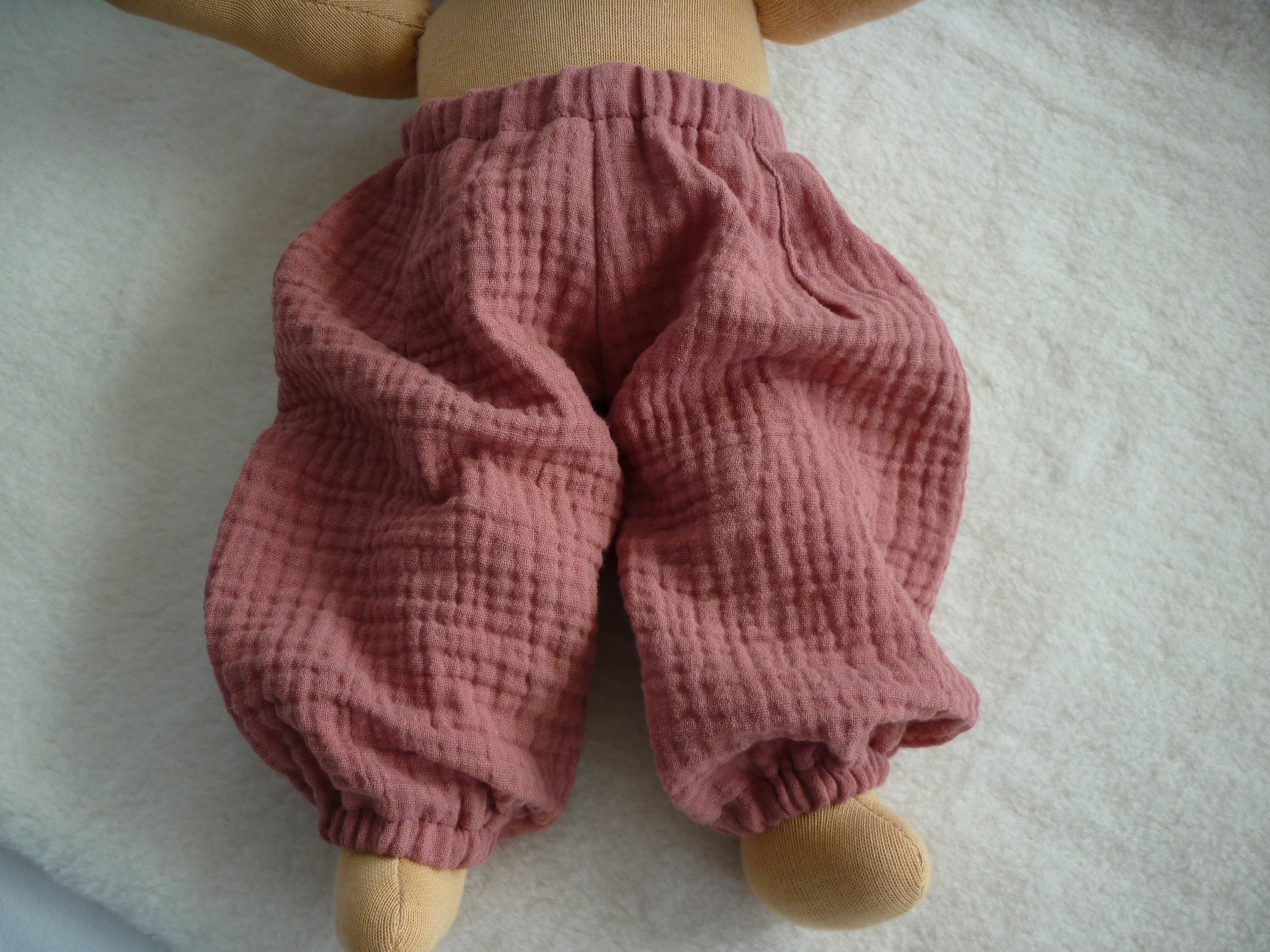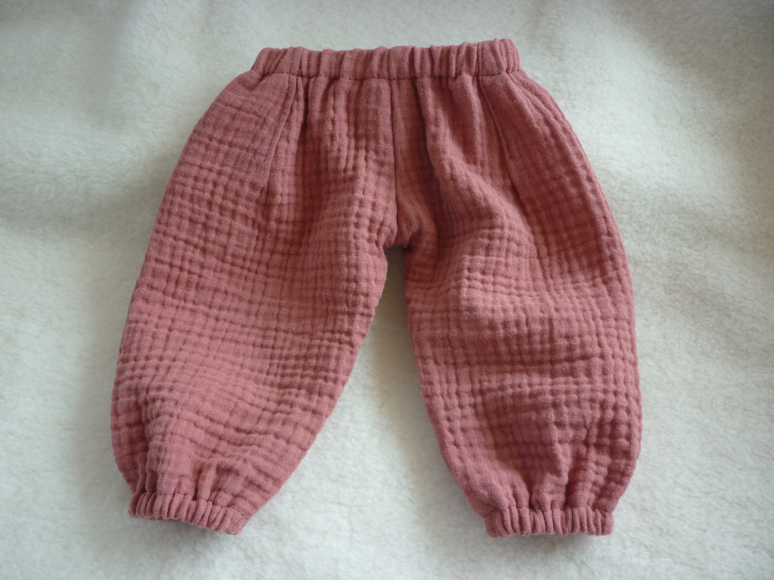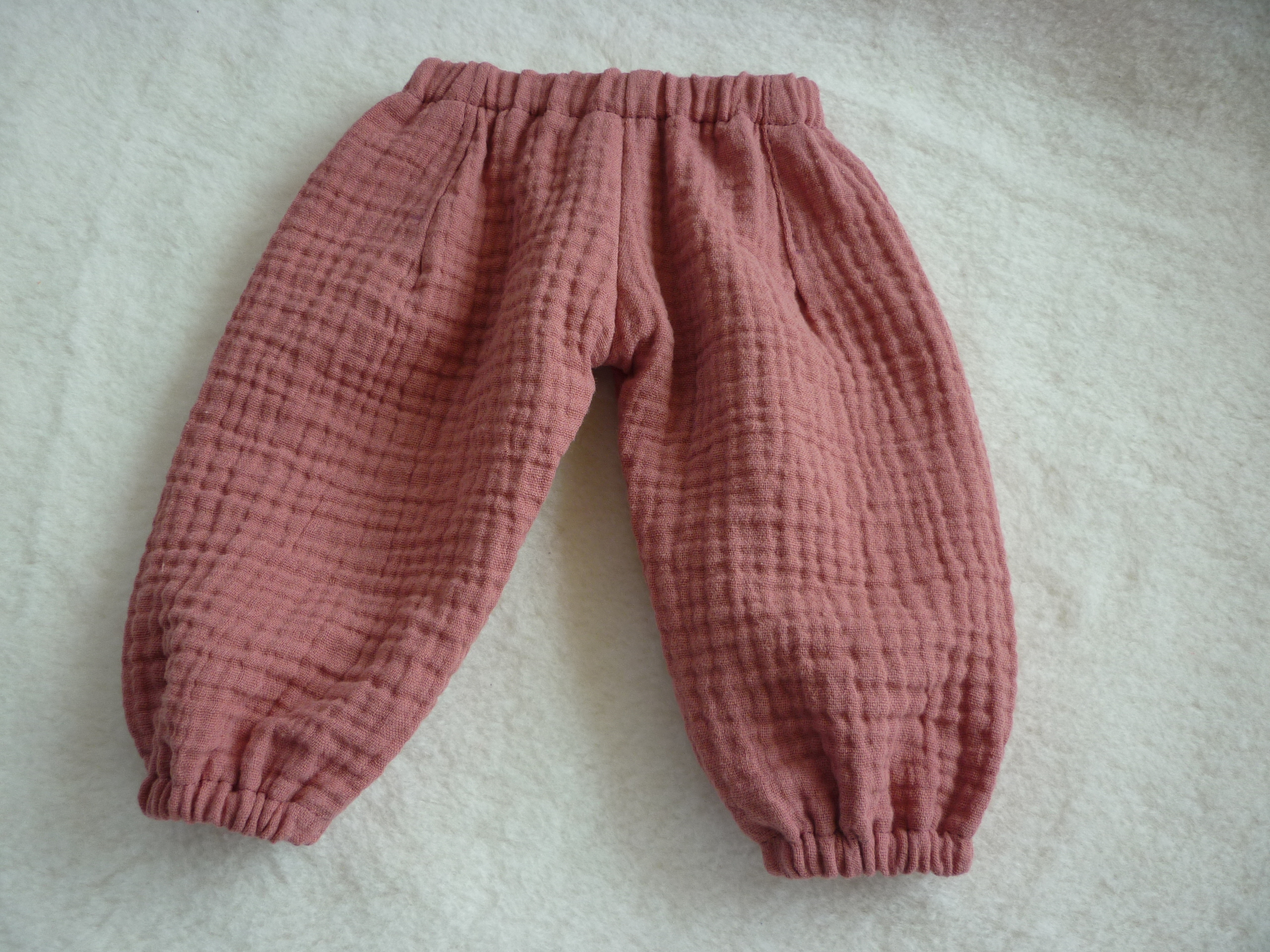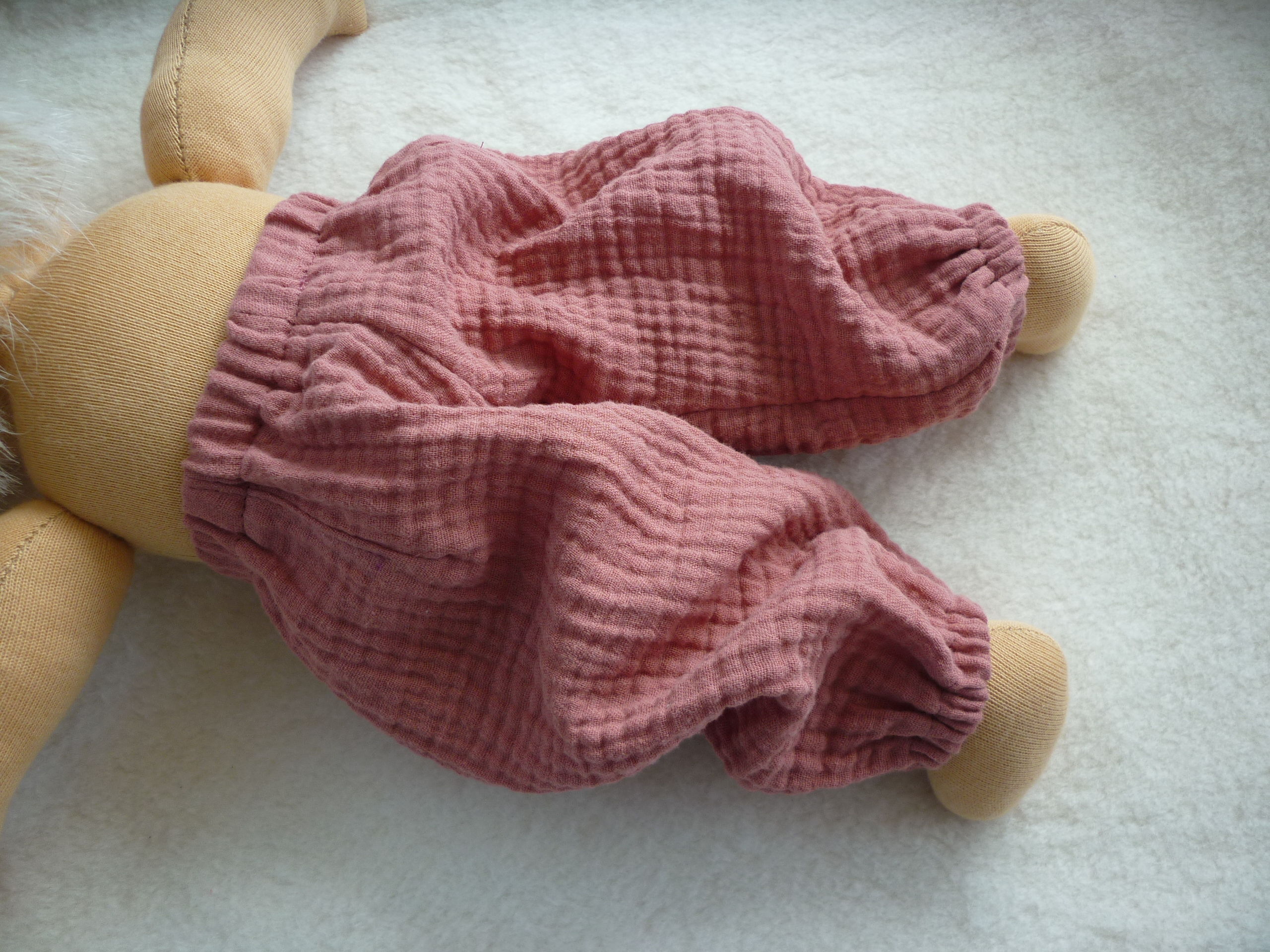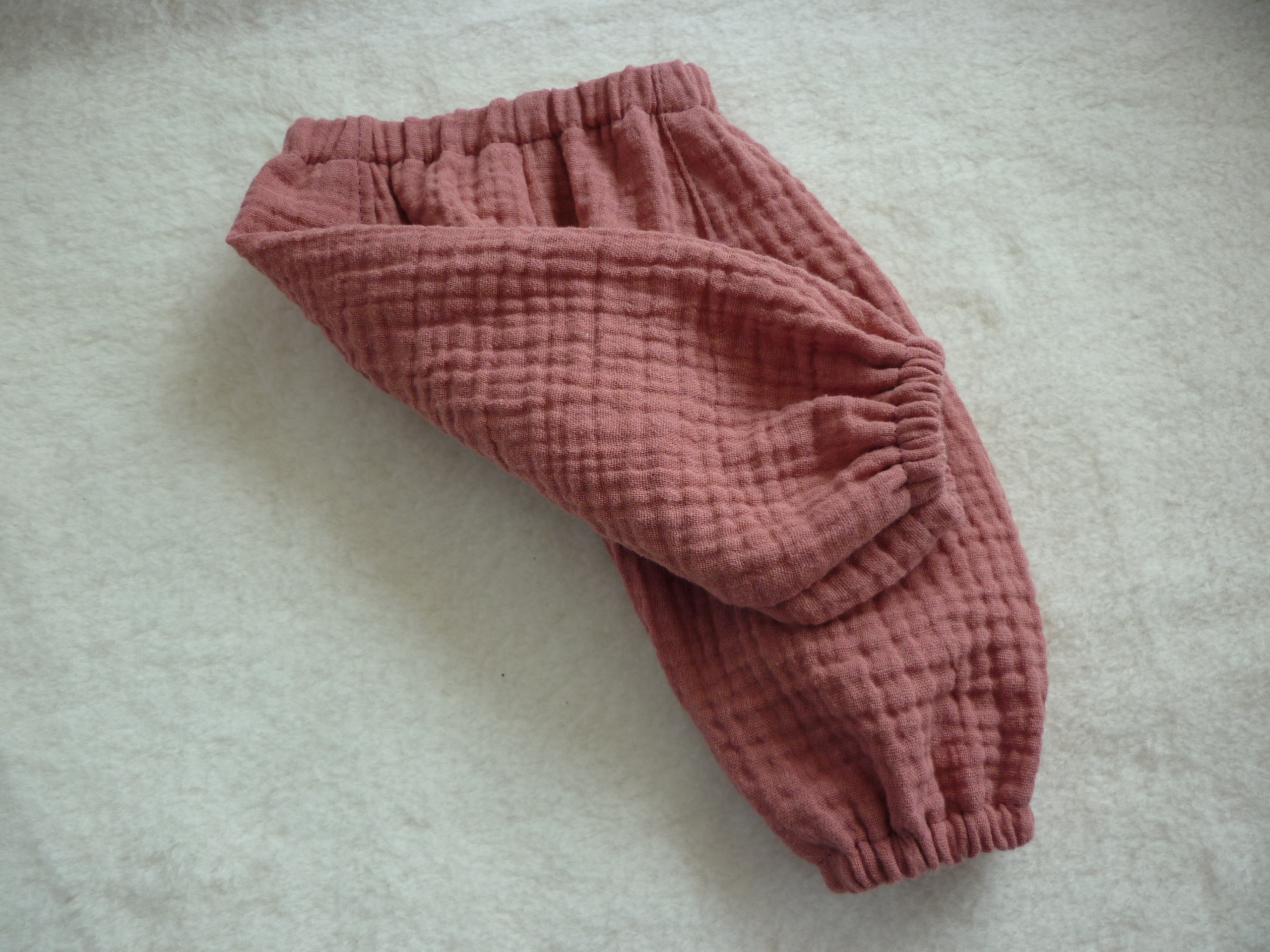 Die Hose ist aus Musselin double gauze genäht und hat einen Gummizug im Bund und am Fuß. Die Farbe würde ich als dunkles altrosa beschreiben.