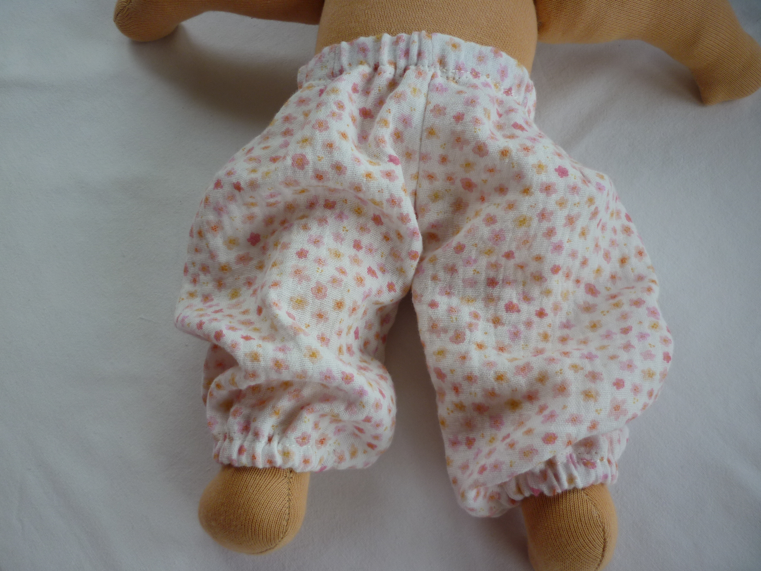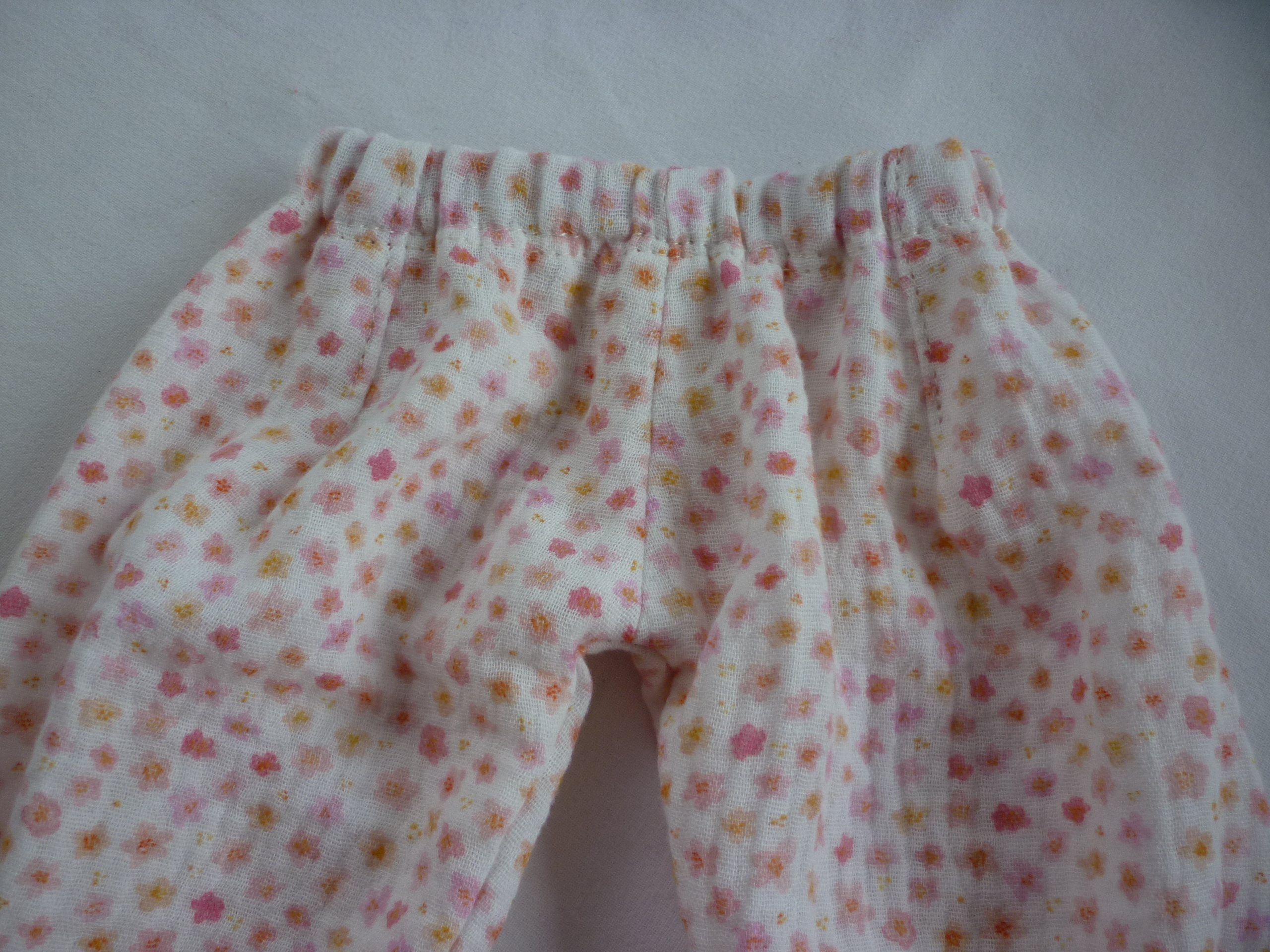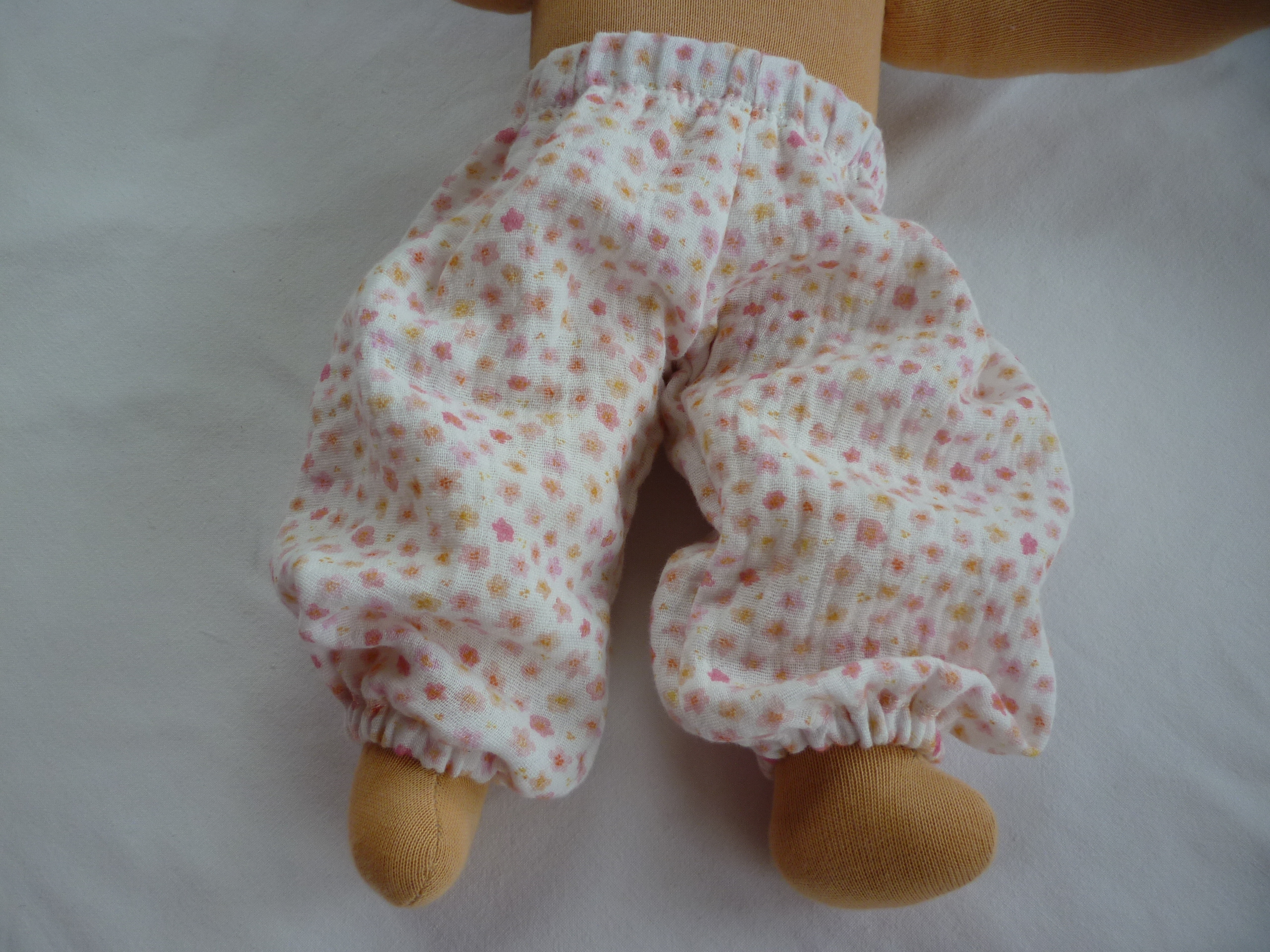 Die Hose ist aus weißgrundigem Musselin double gauze genäht und hat einen Gummizug im Bund und am Fuß.