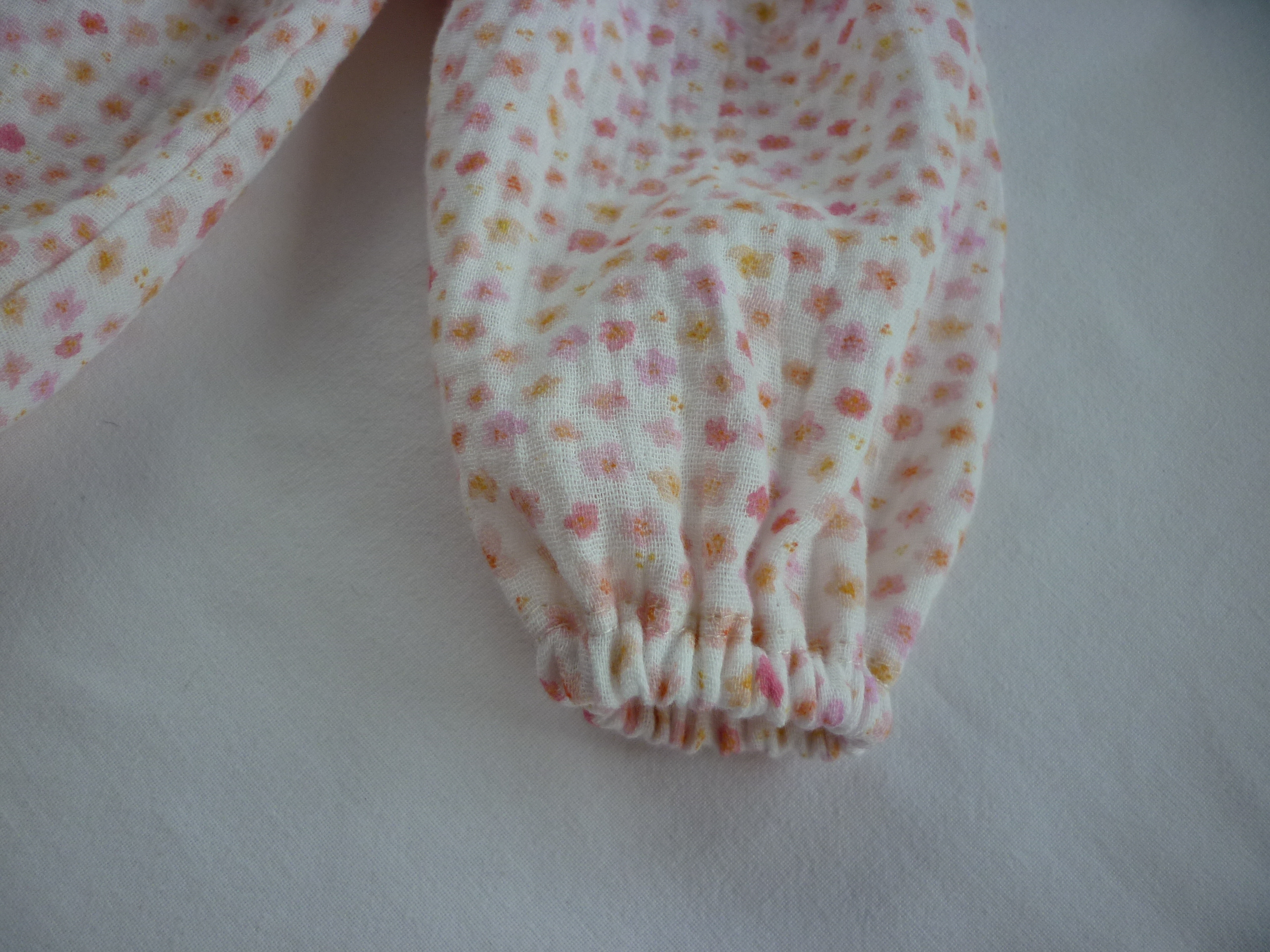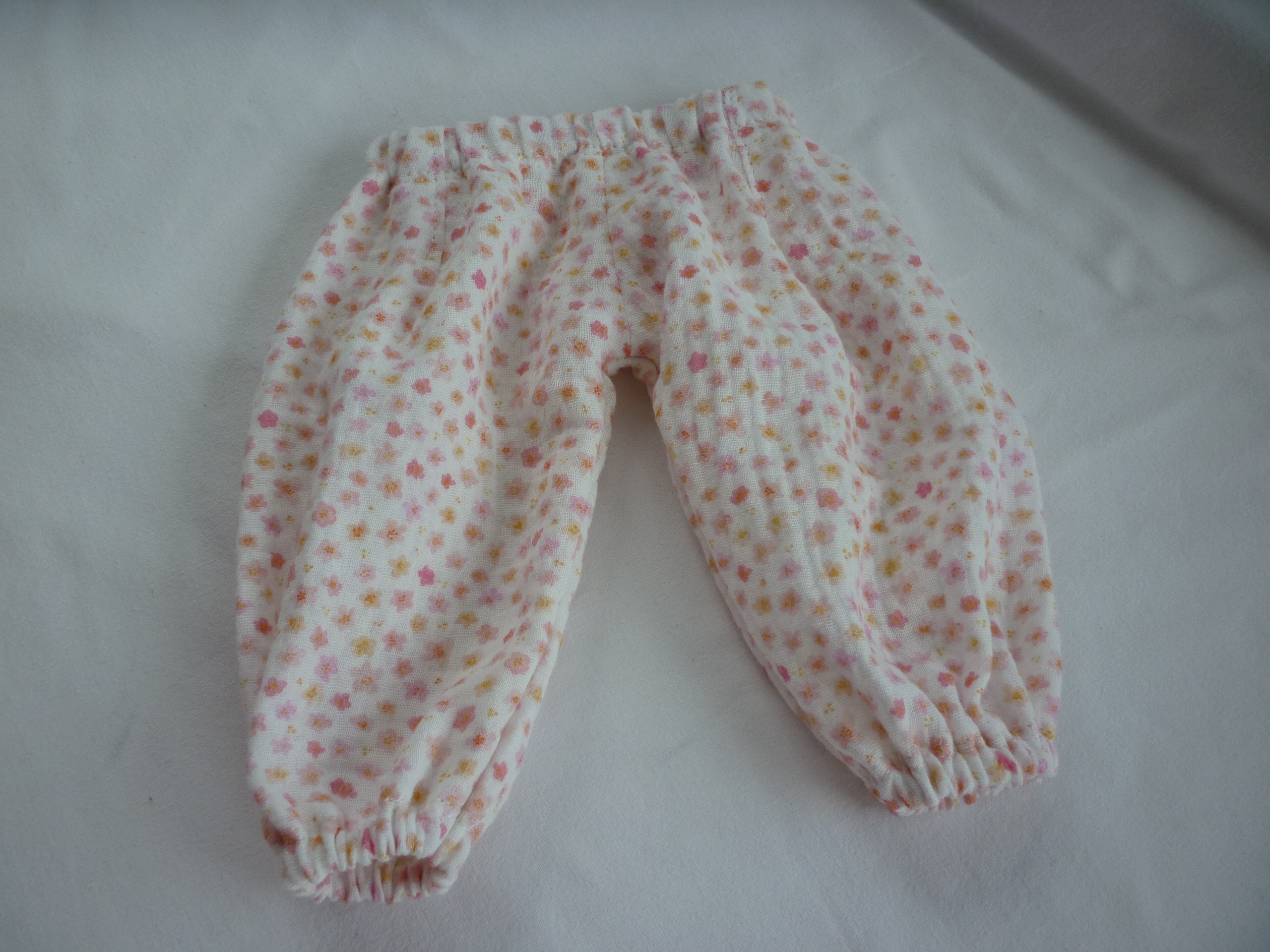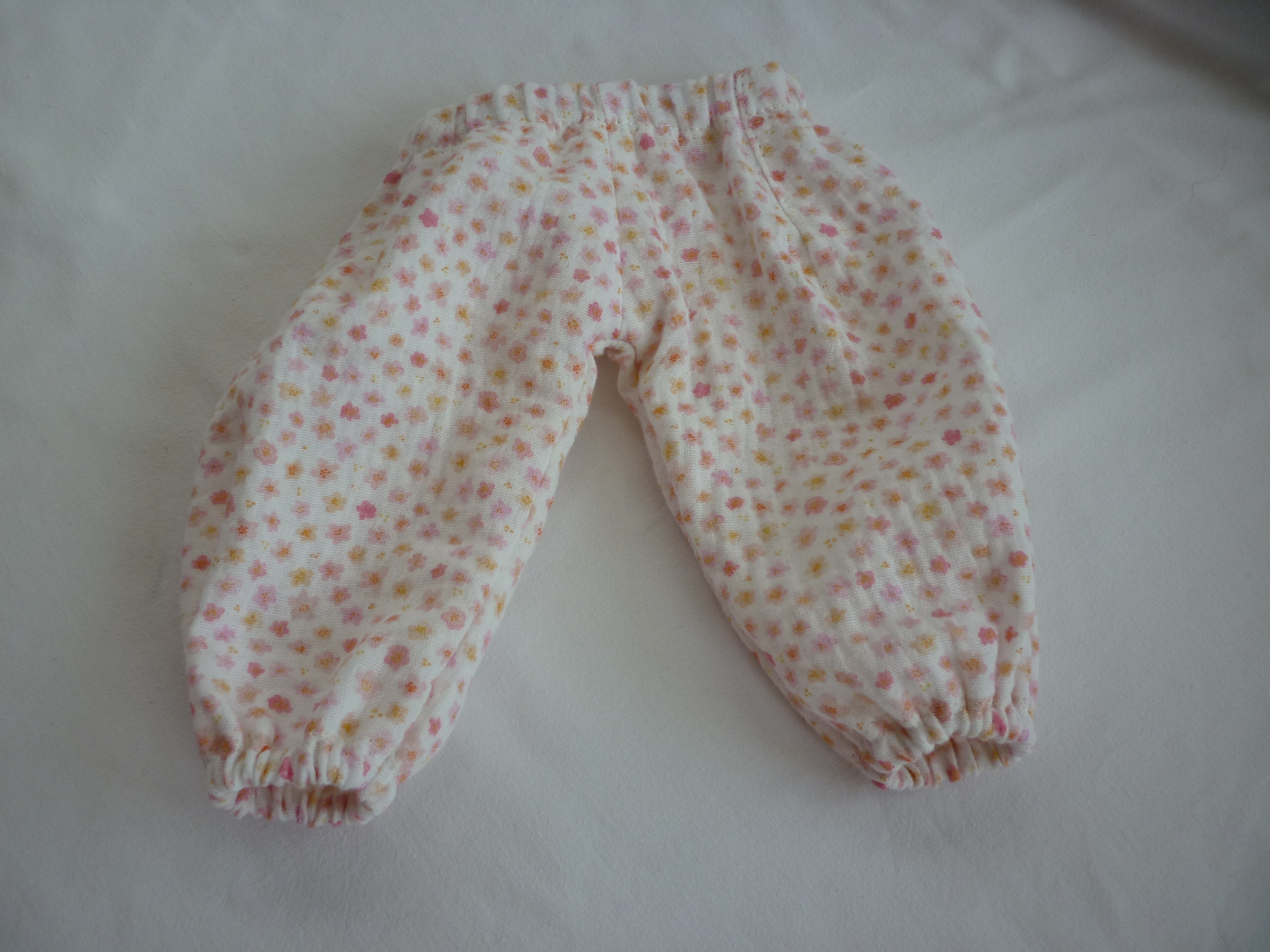 Die Hose ist aus weißgrundigem Musselin double gauze genäht und hat einen Gummizug im Bund und am Fuß.