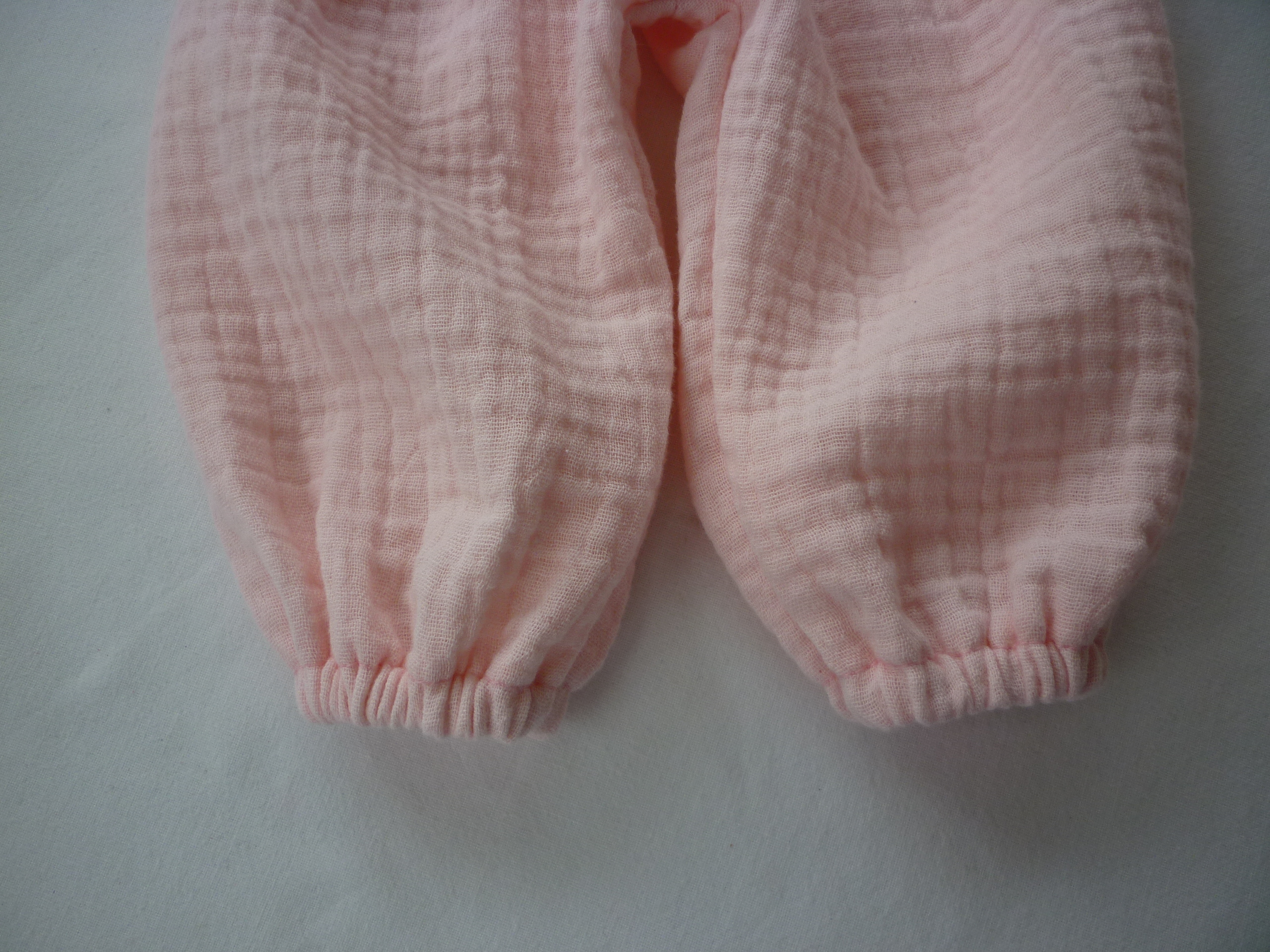 Die Hose ist aus rosé Musselin double gauze genäht und hat einen Gummizug im Bund und am Fuß.